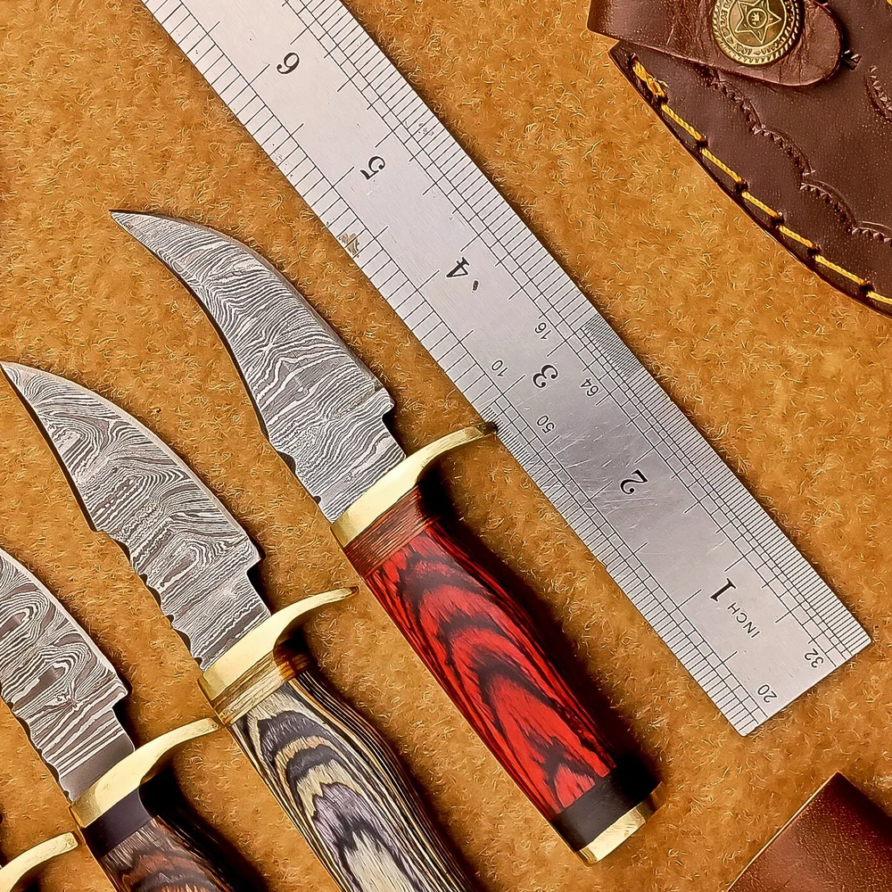 4 Pcs Damascus Blade Skinner Knives Set | 6" | Hardwood , Leather Sheath IT-833