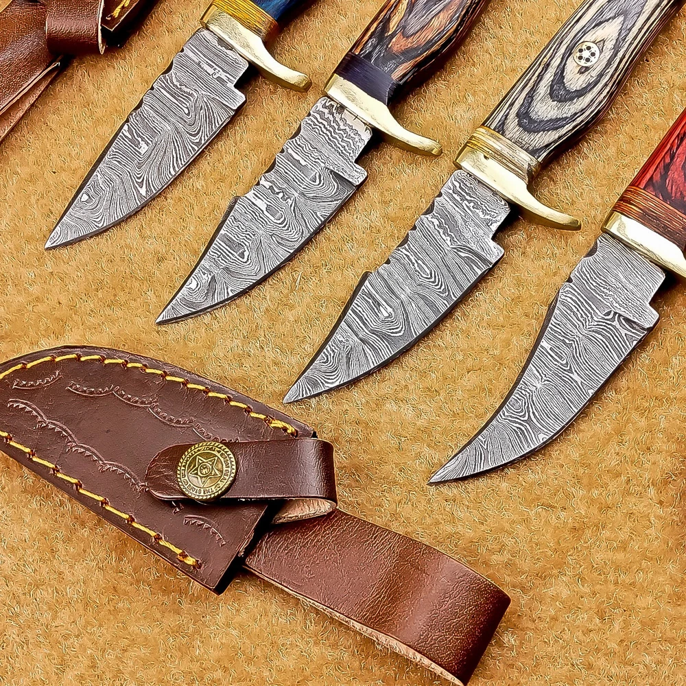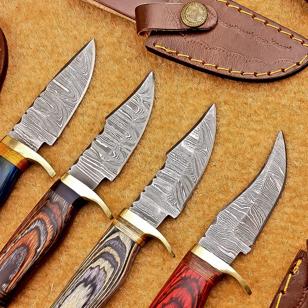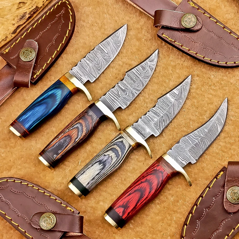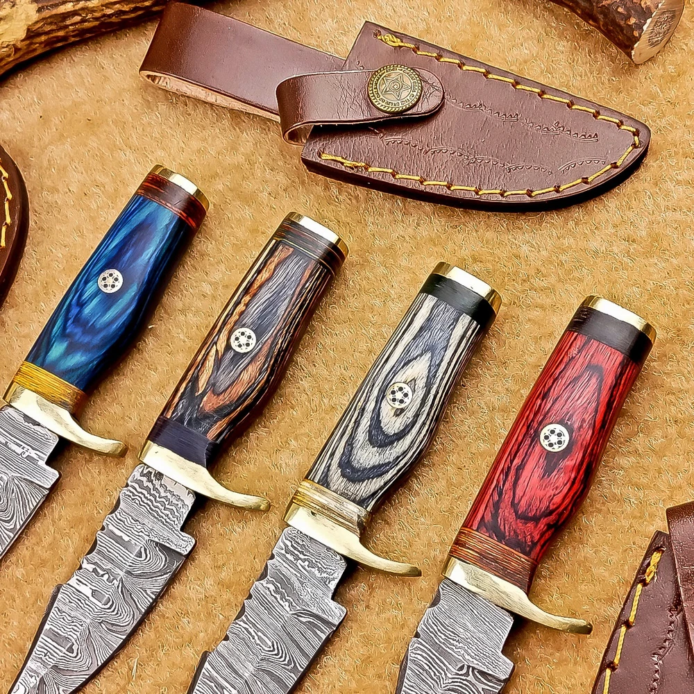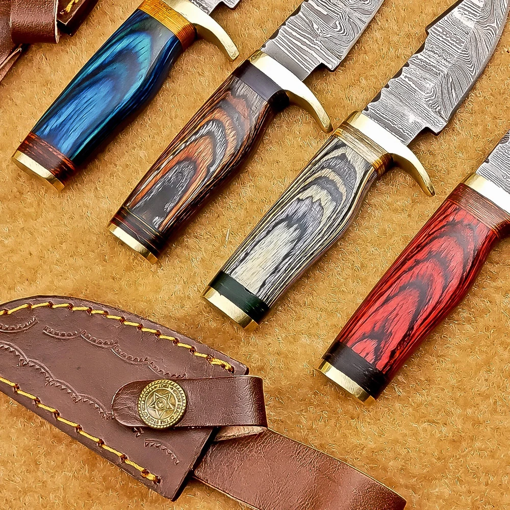 LOT OF 4 PCS! Handmade Damascus Hunting Knives – Multicolor Wood Handles Specifications: Overall Length: 6.00" Blade Thickness: ~4 mm Blade Material: Damascus Steel Handle Material: Multicolor wood with mosaic pins & hand casted brass bolster. Includes: Leather sheaths Blade Craftsmanship: Blades are made from 1095 & 15N20 High Carbon Tool Steel with over 256 layers and a hardness of 58-60 HRC for durability and sharpness. Spine of the blade tang has Excellent fire work Care Instructions: Sharpen with a Diamond Wet Stone at a 20-degree angle. Clean with soap and water, dry thoroughly, and apply gun oil. Store away from the sheath to prevent rust. Important Notes for Buyers: Verify your country’s import regulations before purchase. Customs duties, if any, are the buyer’s responsibility. Shipping & Returns: Free shipping included. 14-day return policy applies. Contact Us: Message us anytime. We respond within 24 hours.