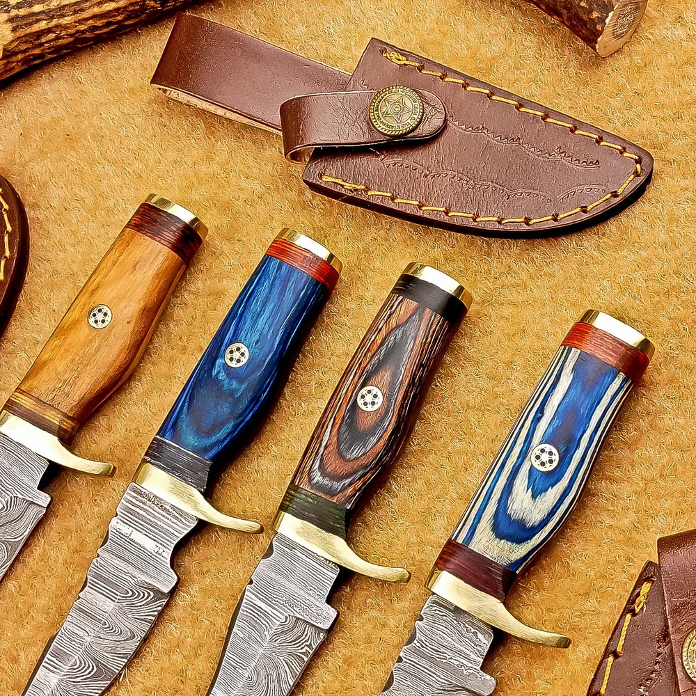 LOT OF 4 PCS! Handmade Damascus Hunting Knives – Multicolor Wood Handles Specifications: Overall Length: 6.00" Blade Thickness: ~4 mm Blade Material: Damascus Steel Handle Material: Multicolor wood with mosaic pins & hand casted brass bolster. Includes: Leather sheaths Blade Craftsmanship: Blades are made from 1095 & 15N20 High Carbon Tool Steel with over 256 layers and a hardness of 58-60 HRC for durability and sharpness. Spine of the blade tang has Excellent fire work Care Instructions: Sharpen with a Diamond Wet Stone at a 20-degree angle. Clean with soap and water, dry thoroughly, and apply gun oil. Store away from the sheath to prevent rust. Important Notes for Buyers: Verify your country’s import regulations before purchase. Customs duties, if any, are the buyer’s responsibility. Shipping & Returns: Free shipping included. 14-day return policy applies. Contact Us: Message us anytime. We respond within 24 hours.