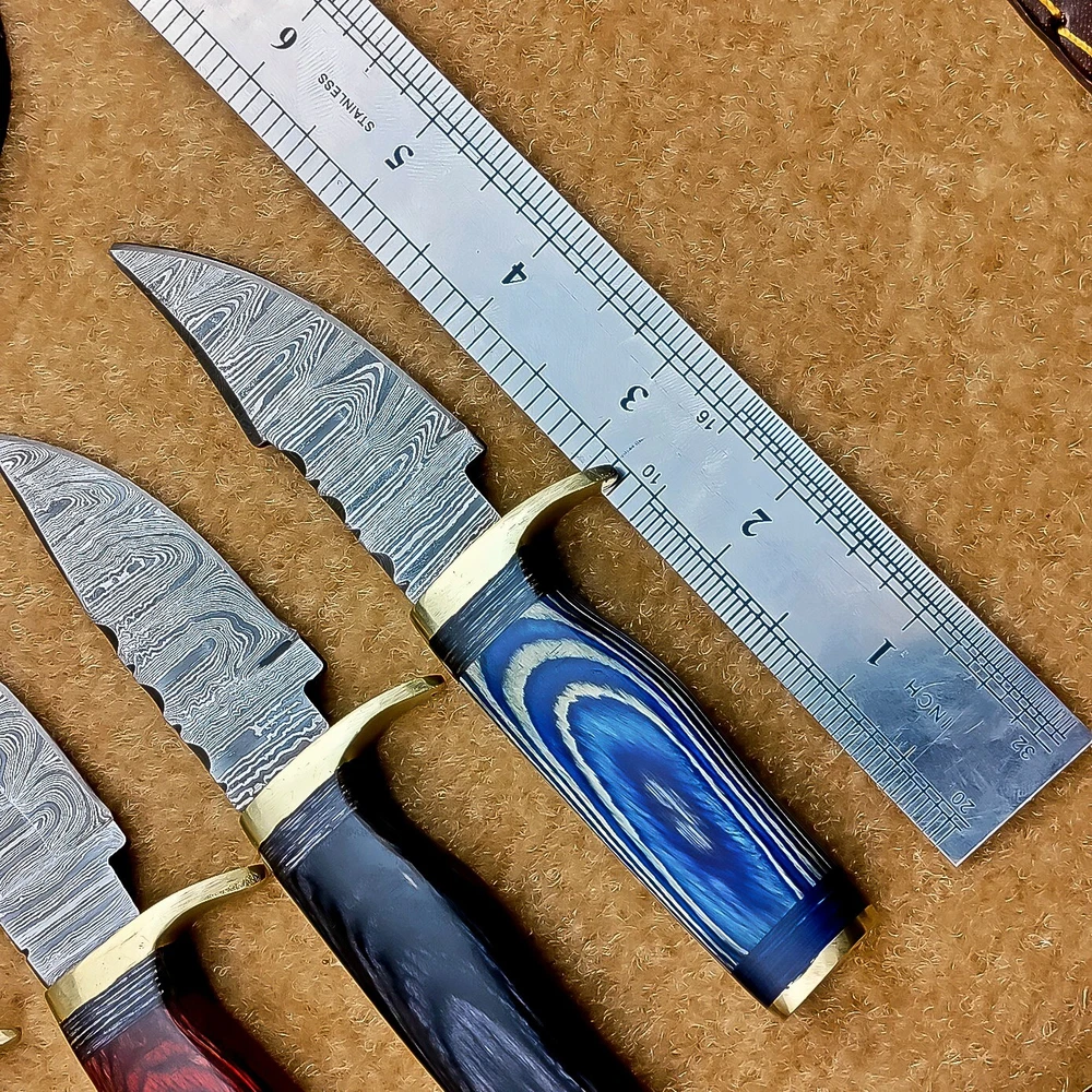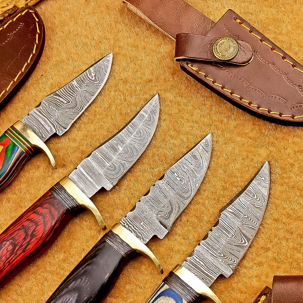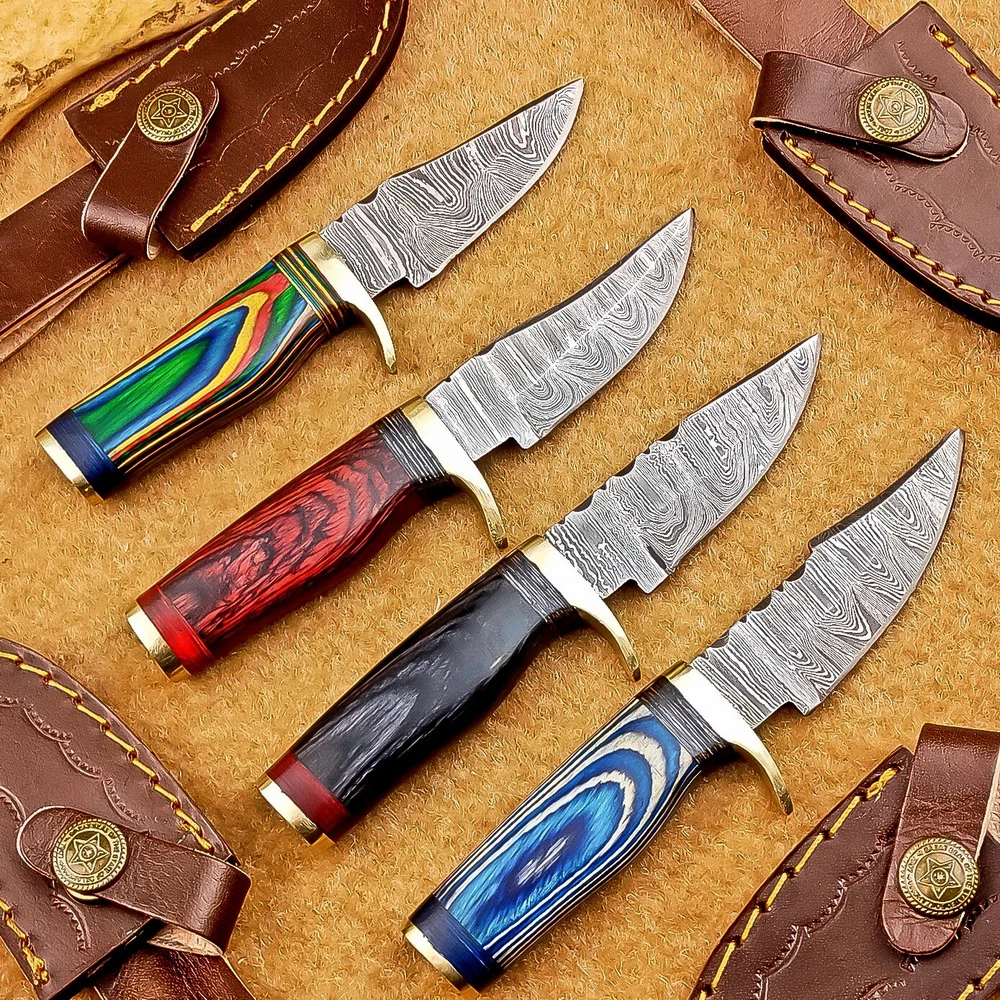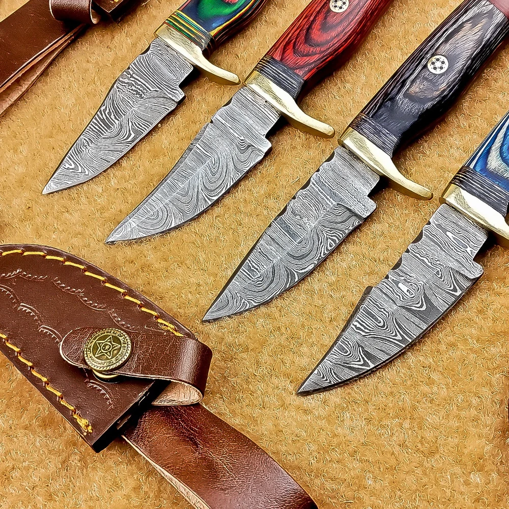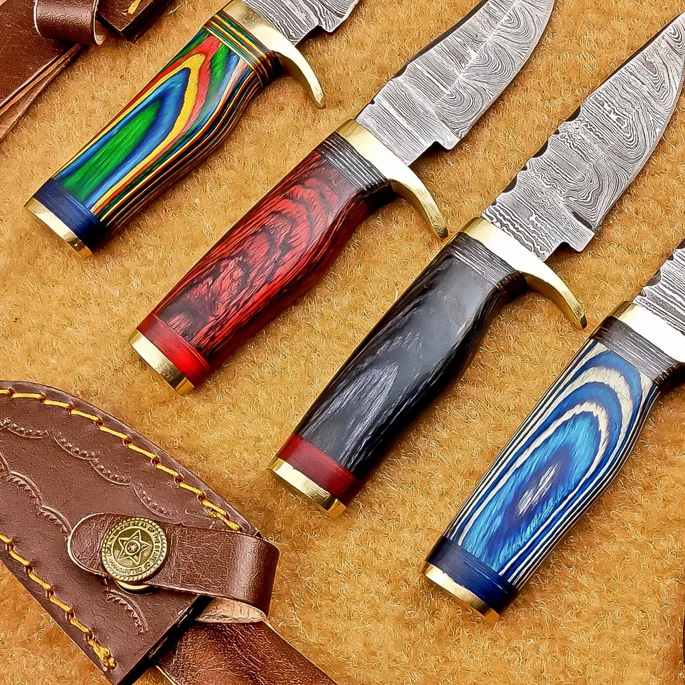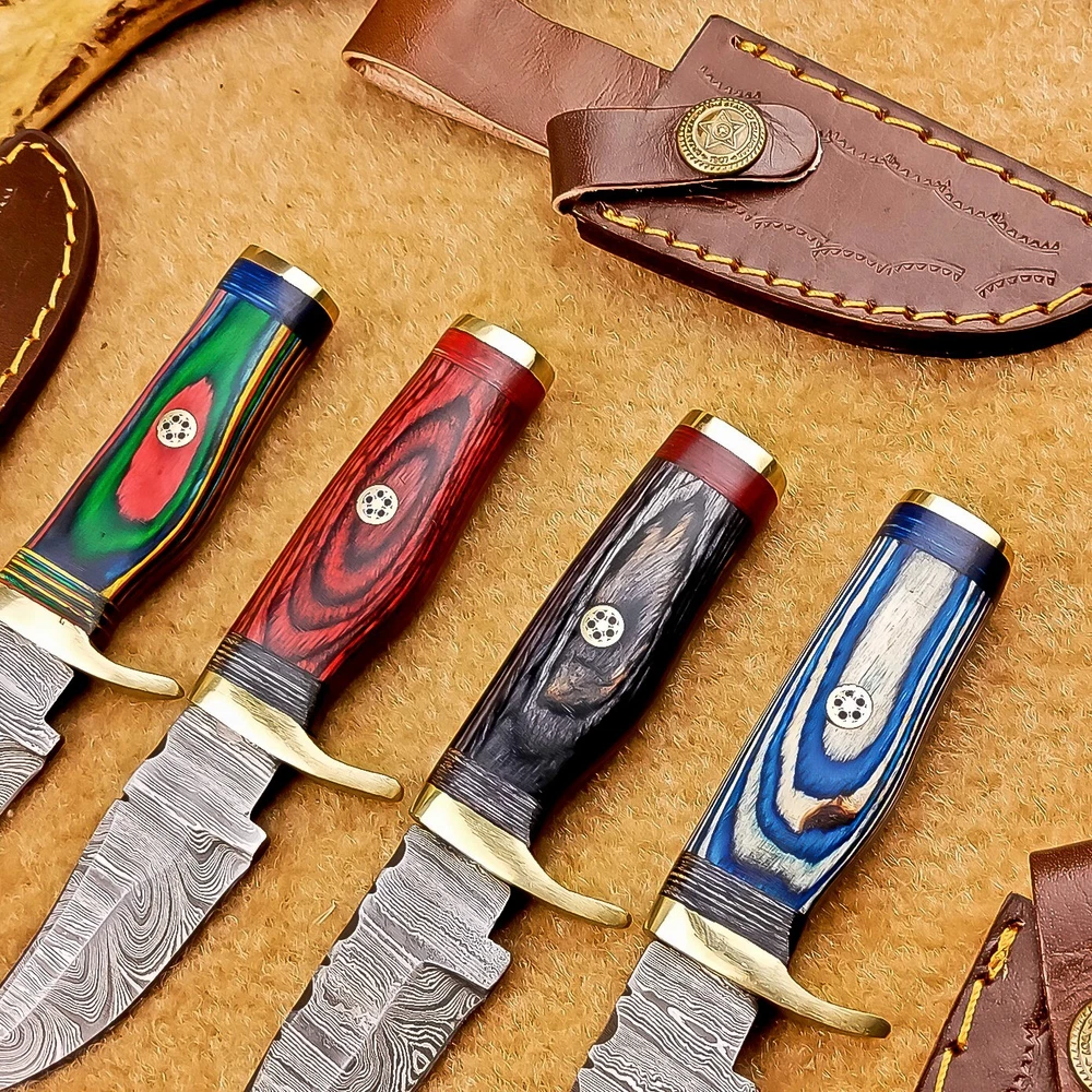 LOT OF 4 PCS! Handmade Damascus Hunting Knives – Multicolor Wood Handles Specifications: Overall Length: 6.00" Blade Thickness: ~4 mm Blade Material: Damascus Steel Handle Material: Multicolor wood with mosaic pins & hand casted brass bolster. Includes: Leather sheaths Blade Craftsmanship: Blades are made from 1095 & 15N20 High Carbon Tool Steel with over 256 layers and a hardness of 58-60 HRC for durability and sharpness. Spine of the blade tang has Excellent fire work Care Instructions: Sharpen with a Diamond Wet Stone at a 20-degree angle. Clean with soap and water, dry thoroughly, and apply gun oil. Store away from the sheath to prevent rust. Important Notes for Buyers: Verify your country’s import regulations before purchase. Customs duties, if any, are the buyer’s responsibility. Shipping & Returns: Free shipping included. 14-day return policy applies. Contact Us: Message us anytime. We respond within 24 hours.