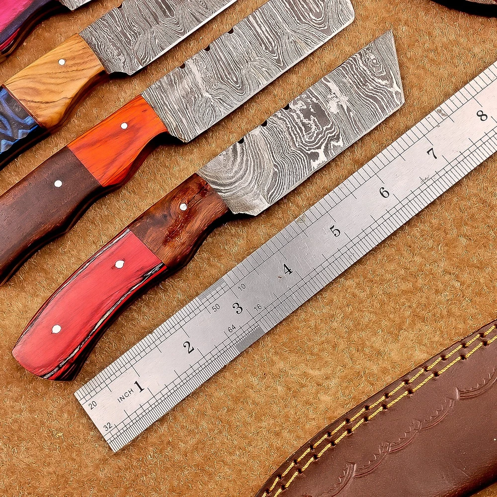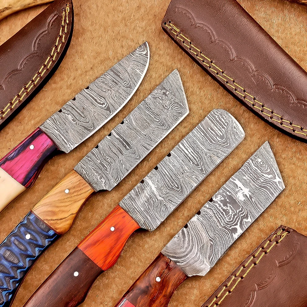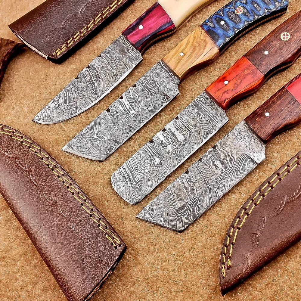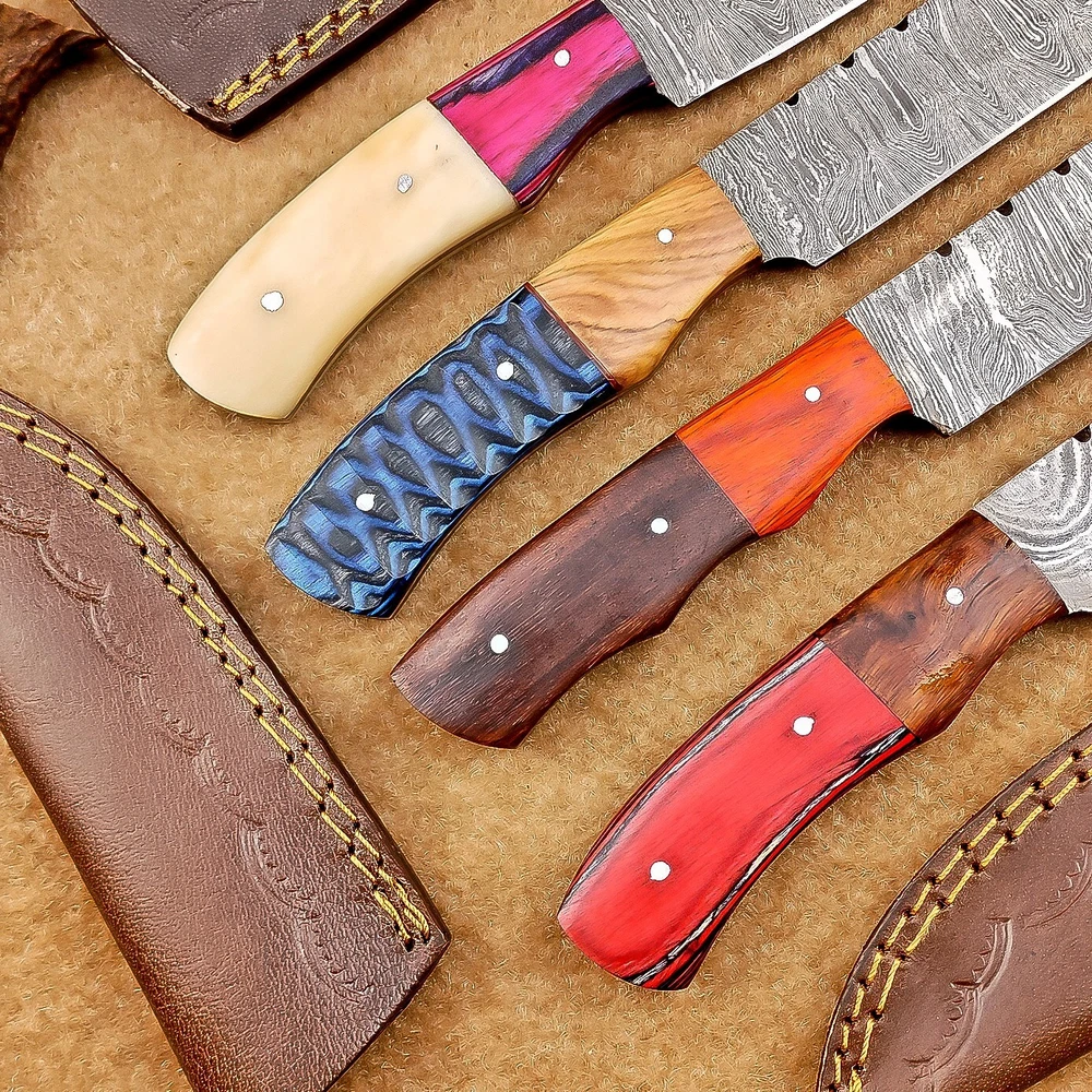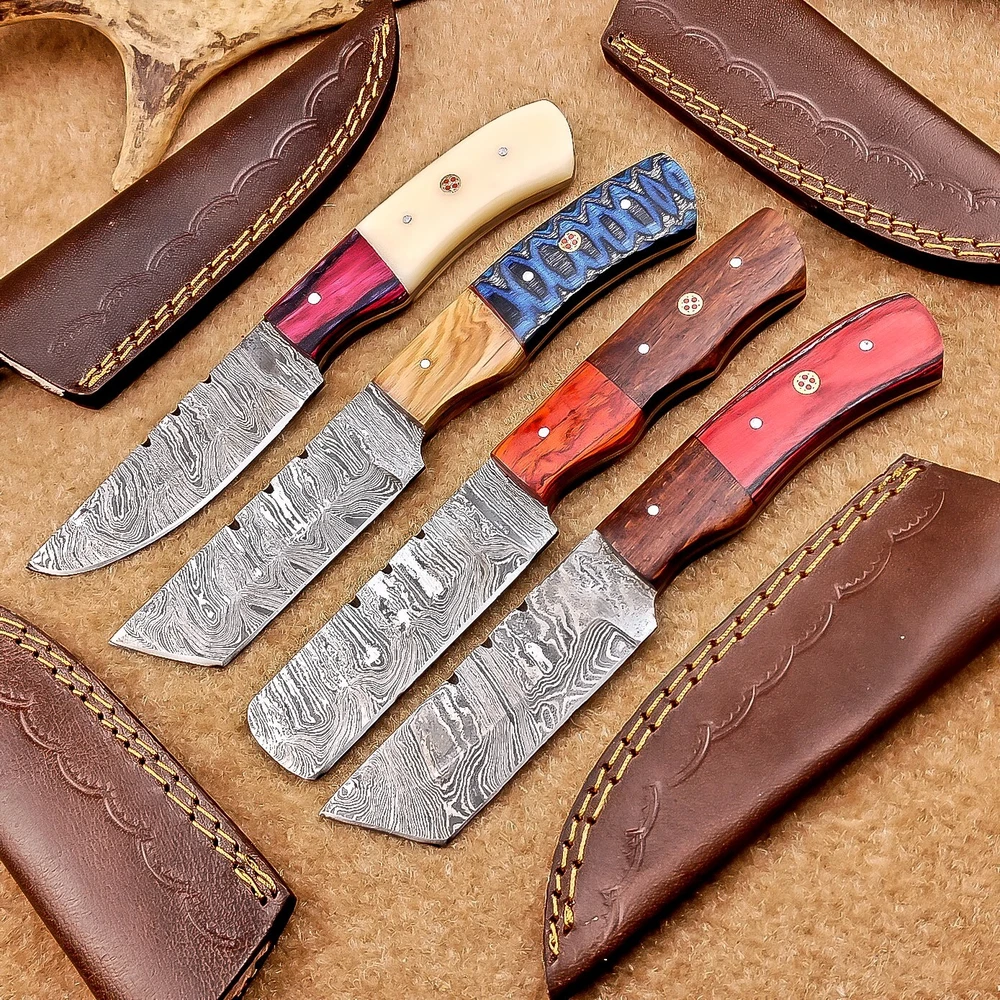 LOT OF 4 PCS! Handmade Damascus Hunting Knives , Skinner Knives Specifications: Overall Length: 8.0" Blade Thickness: ~4 mm Blade Material: Damascus Steel Handle Material: Hard wood and camel bone with brass pins mosaic pin Includes: Leather sheaths Blade Craftsmanship: Blades are made from 1095 & 15N20 High Carbon Tool Steel with over 256 layers and a hardness of 58-60 HRC for durability and sharpness. Spine of the blade tang has excellent fire work. Care Instructions: Sharpen with a Diamond Wet Stone at a 20-degree angle. Clean with soap and water, dry thoroughly, and apply gun oil. Store away from the sheath to prevent rust. Important Notes for Buyers: Verify your country’s import regulations before purchase. Customs duties, if any, are the buyer’s responsibility. Shipping & Returns: Free shipping included. 14-day return policy applies. Contact Us: Message us anytime. We respond within 24 hours.