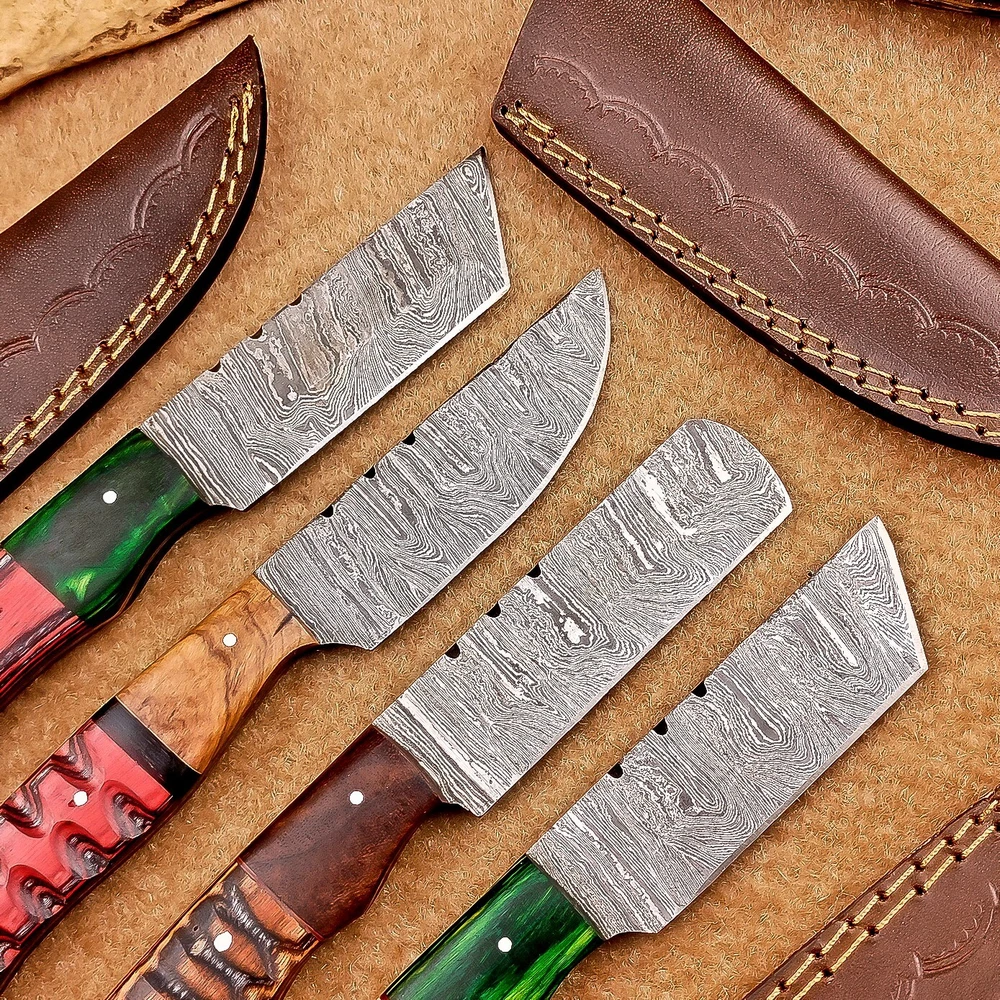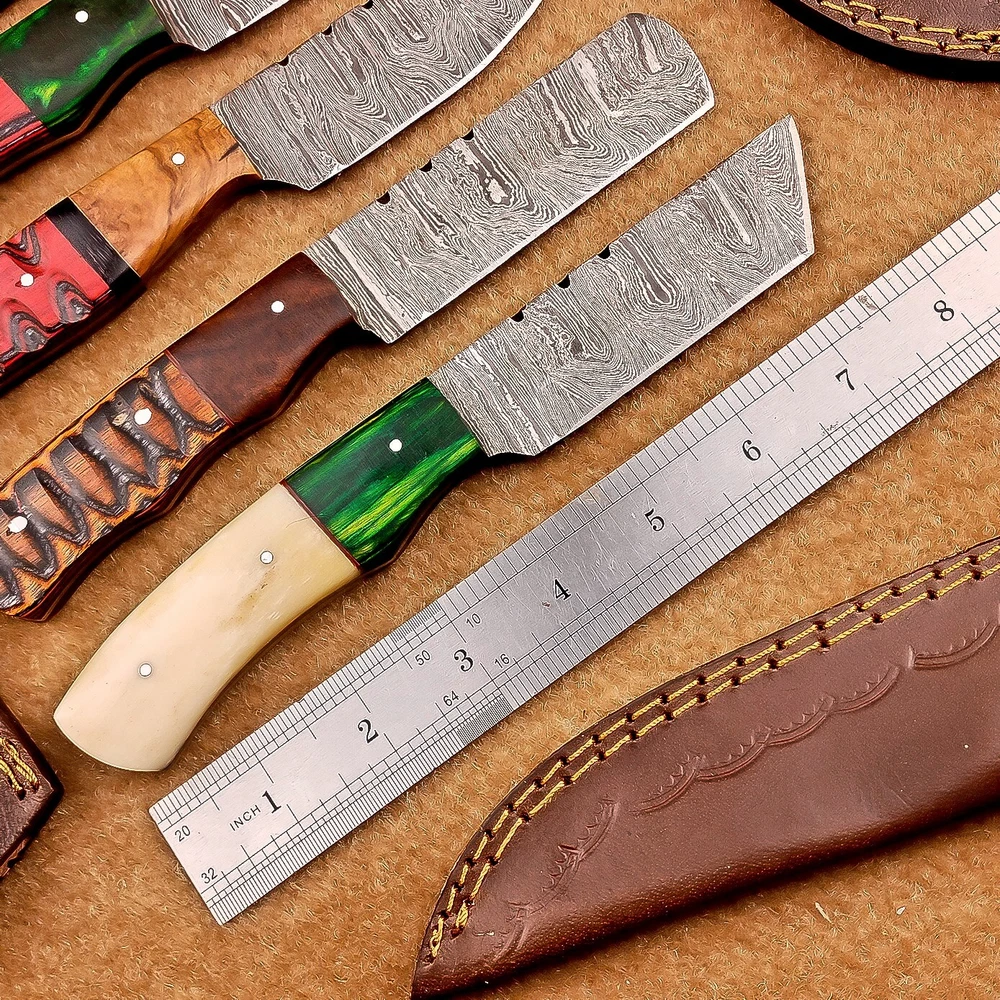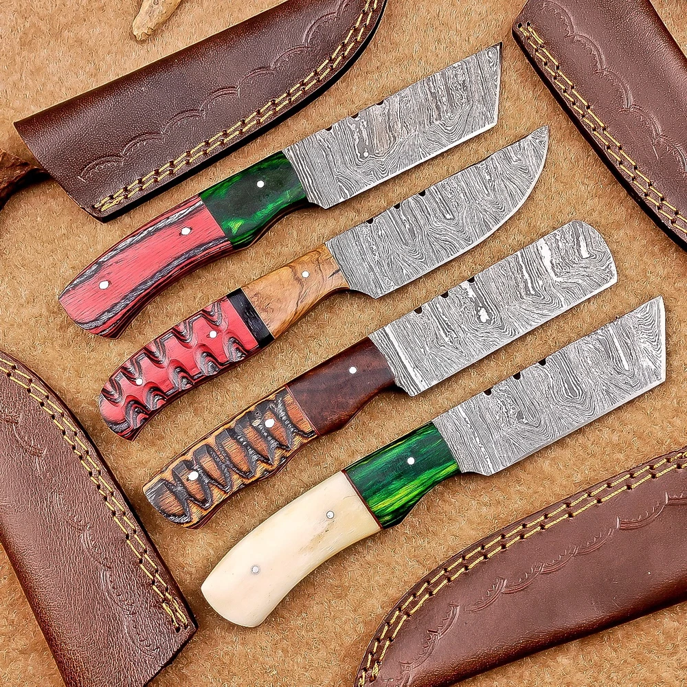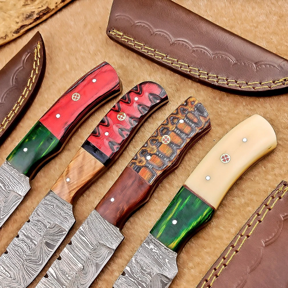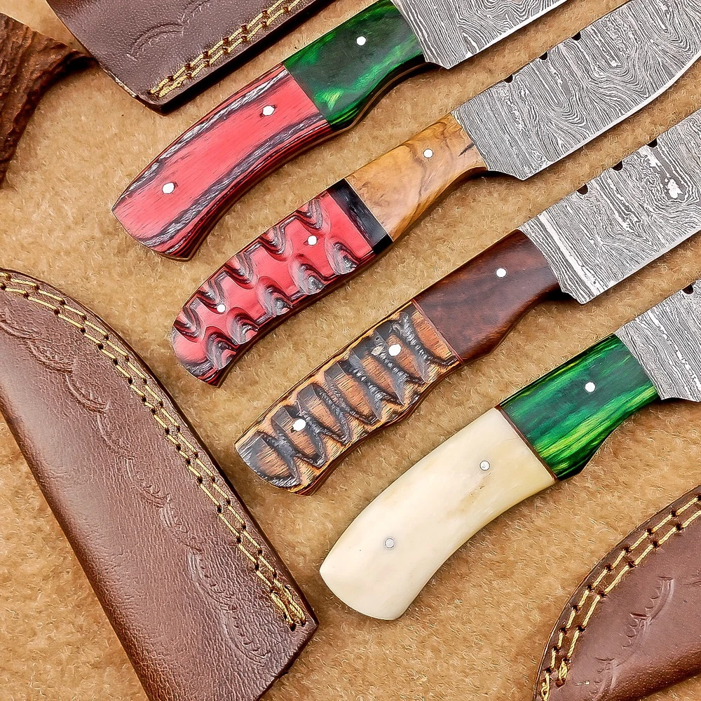 LOT OF 4 PCS! Handmade Damascus Hunting Knives , Skinner Knives Specifications: Overall Length: 8.0" Blade Thickness: ~4 mm Blade Material: Damascus Steel Handle Material: Hard wood and Resin / camel bone with brass pins mosaic pin Includes: Leather sheaths Blade Craftsmanship: Blades are made from 1095 & 15N20 High Carbon Tool Steel with over 256 layers and a hardness of 58-60 HRC for durability and sharpness. Spine of the blade tang has excellent fire work. Care Instructions: Sharpen with a Diamond Wet Stone at a 20-degree angle. Clean with soap and water, dry thoroughly, and apply gun oil. Store away from the sheath to prevent rust. Important Notes for Buyers: Verify your country’s import regulations before purchase. Customs duties, if any, are the buyer’s responsibility. Shipping & Returns: Free shipping included. 14-day return policy applies. Contact Us: Message us anytime. We respond within 24 hours.