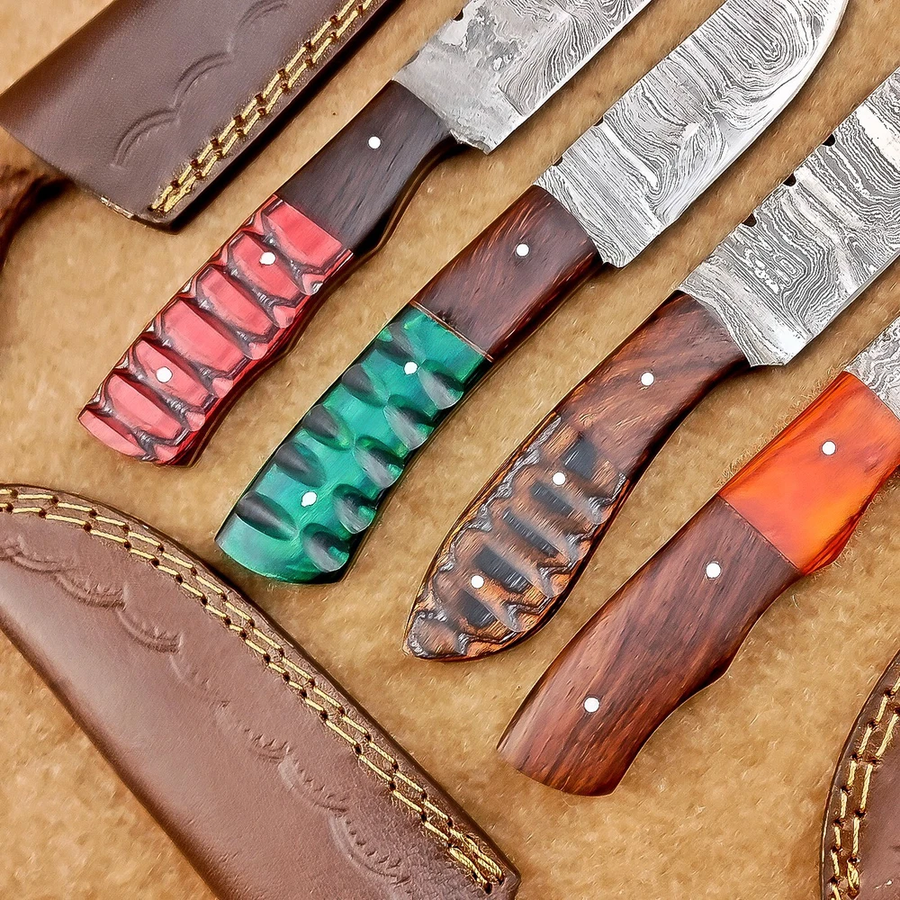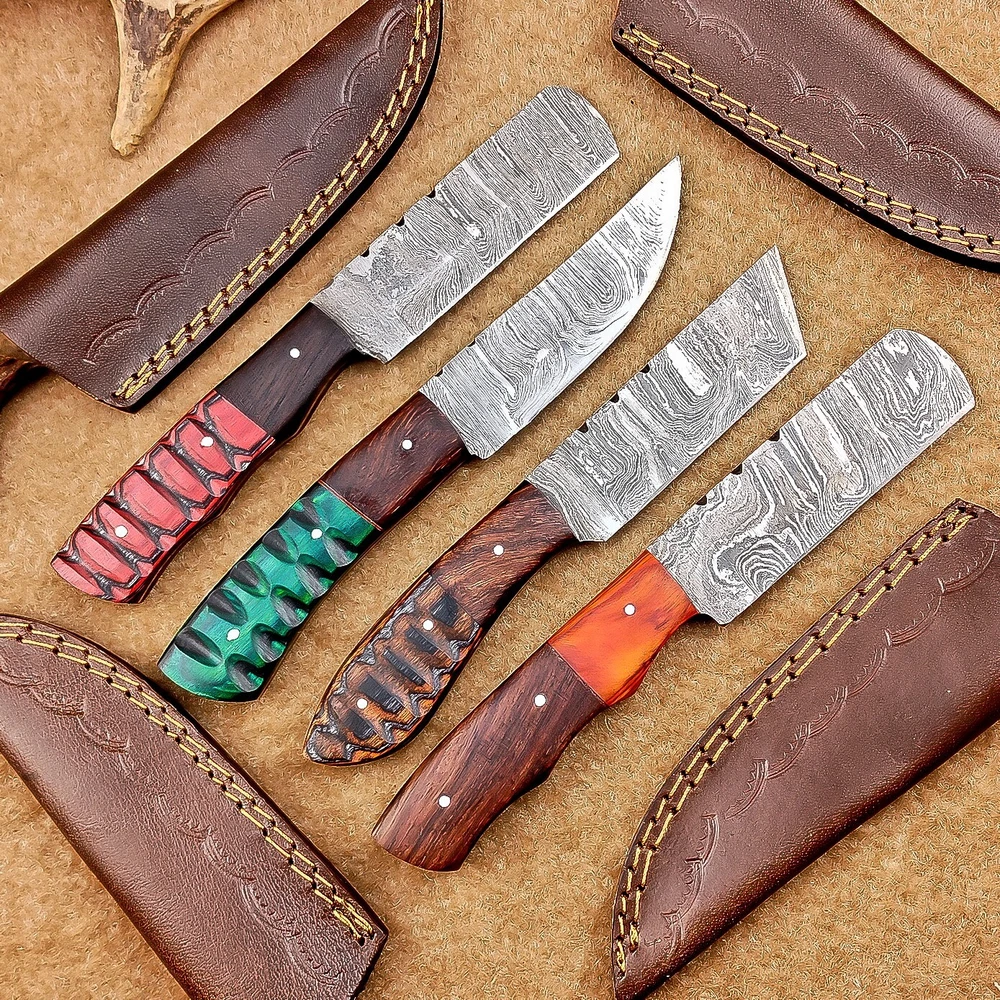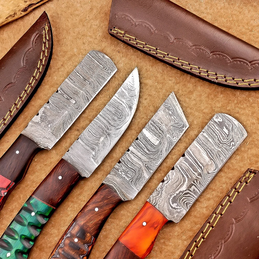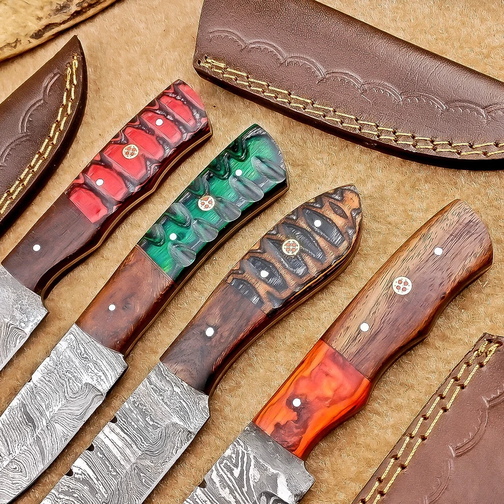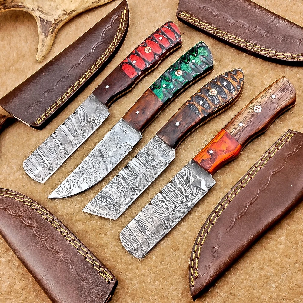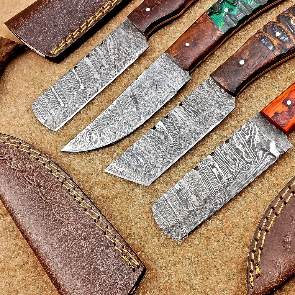 LOT OF 4 PCS! Handmade Damascus Hunting Knives , Skinner Knives Specifications: Overall Length: 8.0" Blade Thickness: ~4 mm Blade Material: Damascus Steel Handle Material: Hard wood with brass pins mosaic pin Includes: Leather sheaths Blade Craftsmanship: Blades are made from 1095 & 15N20 High Carbon Tool Steel with over 256 layers and a hardness of 58-60 HRC for durability and sharpness. Spine of the blade tang has excellent fire work. Care Instructions: Sharpen with a Diamond Wet Stone at a 20-degree angle. Clean with soap and water, dry thoroughly, and apply gun oil. Store away from the sheath to prevent rust. Important Notes for Buyers: Verify your country’s import regulations before purchase. Customs duties, if any, are the buyer’s responsibility. Shipping & Returns: Free shipping included. 14-day return policy applies. Contact Us: Message us anytime. We respond within 24 hours.
