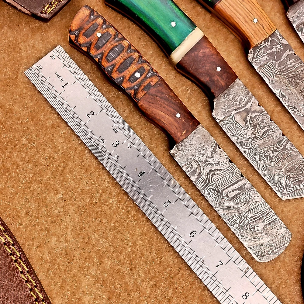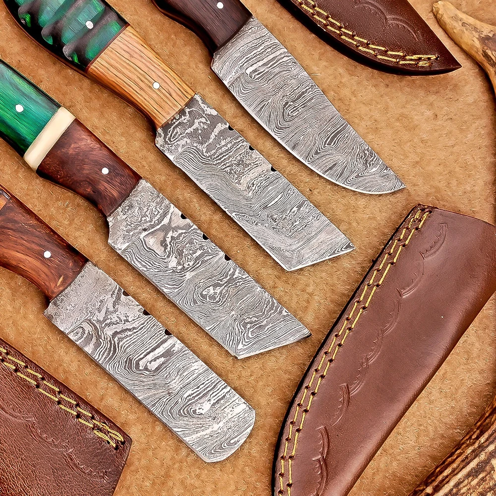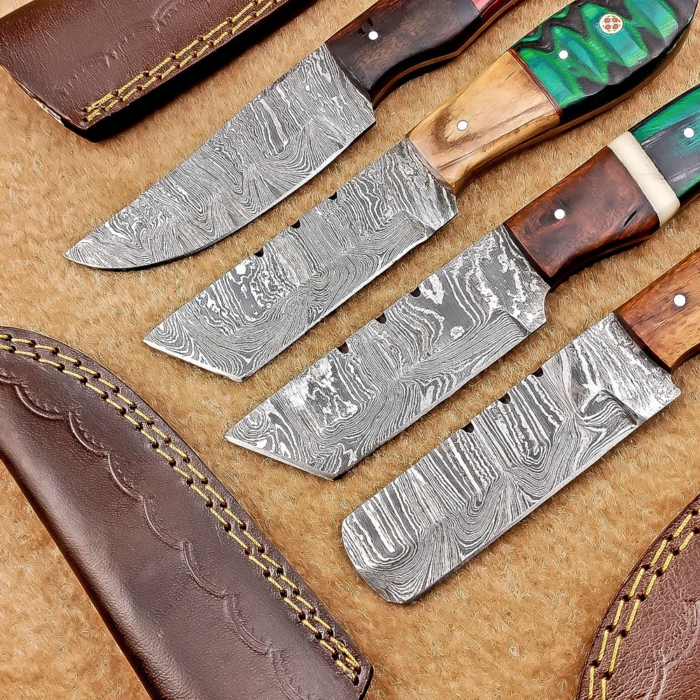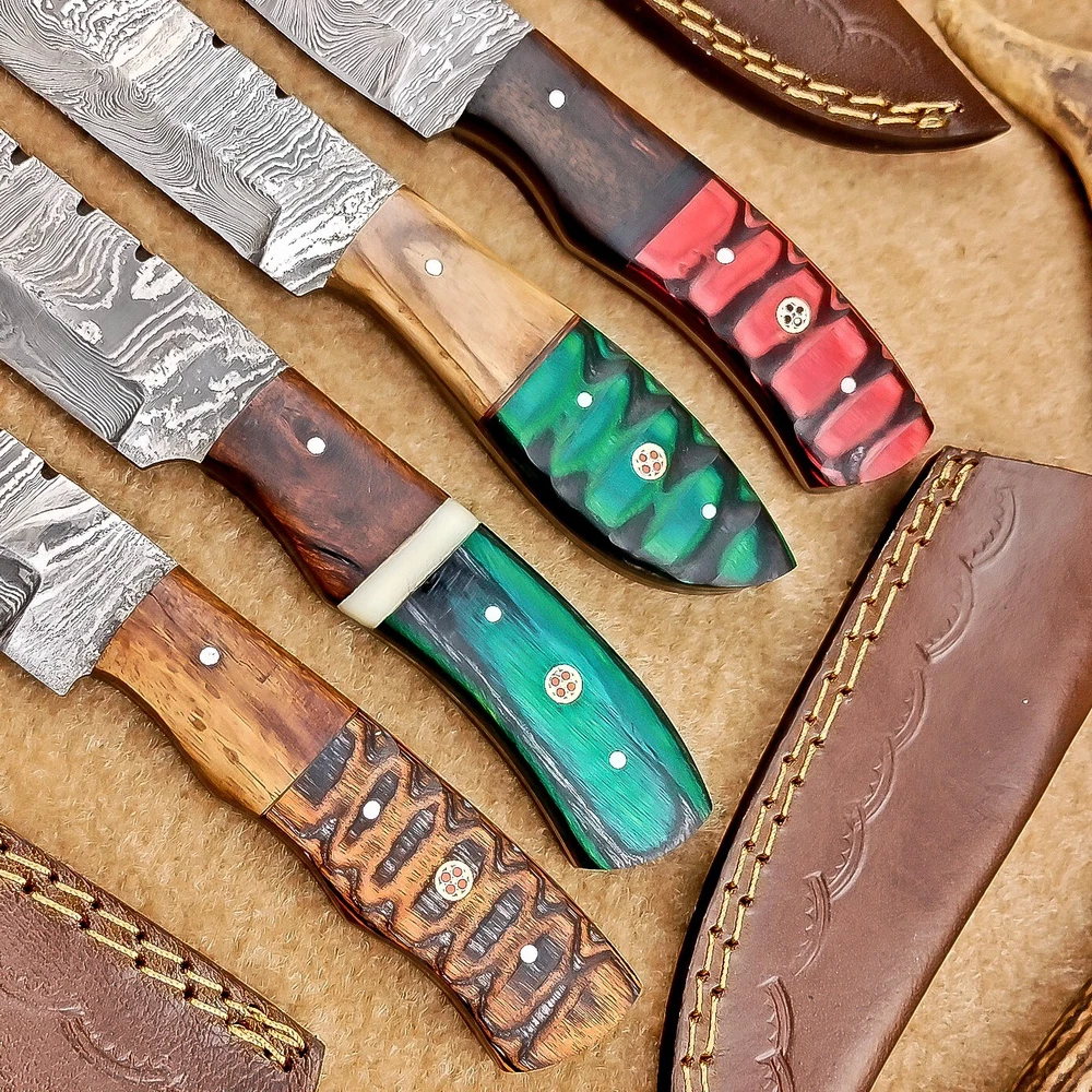LOT OF 4 PCS! Handmade Damascus Hunting Knives , Skinner Knives Specifications: Overall Length: 8.0" Blade Thickness: ~4 mm Blade Material: Damascus Steel Handle Material: Hard wood with brass pins mosaic pin Includes: Leather sheaths Blade Craftsmanship: Blades are made from 1095 & 15N20 High Carbon Tool Steel with over 256 layers and a hardness of 58-60 HRC for durability and sharpness. Spine of the blade tang has excellent fire work. Care Instructions: Sharpen with a Diamond Wet Stone at a 20-degree angle. Clean with soap and water, dry thoroughly, and apply gun oil. Store away from the sheath to prevent rust. Important Notes for Buyers: Verify your country’s import regulations before purchase. Customs duties, if any, are the buyer’s responsibility. Shipping & Returns: Free shipping included. 14-day return policy applies. Contact Us: Message us anytime. We respond within 24 hours.