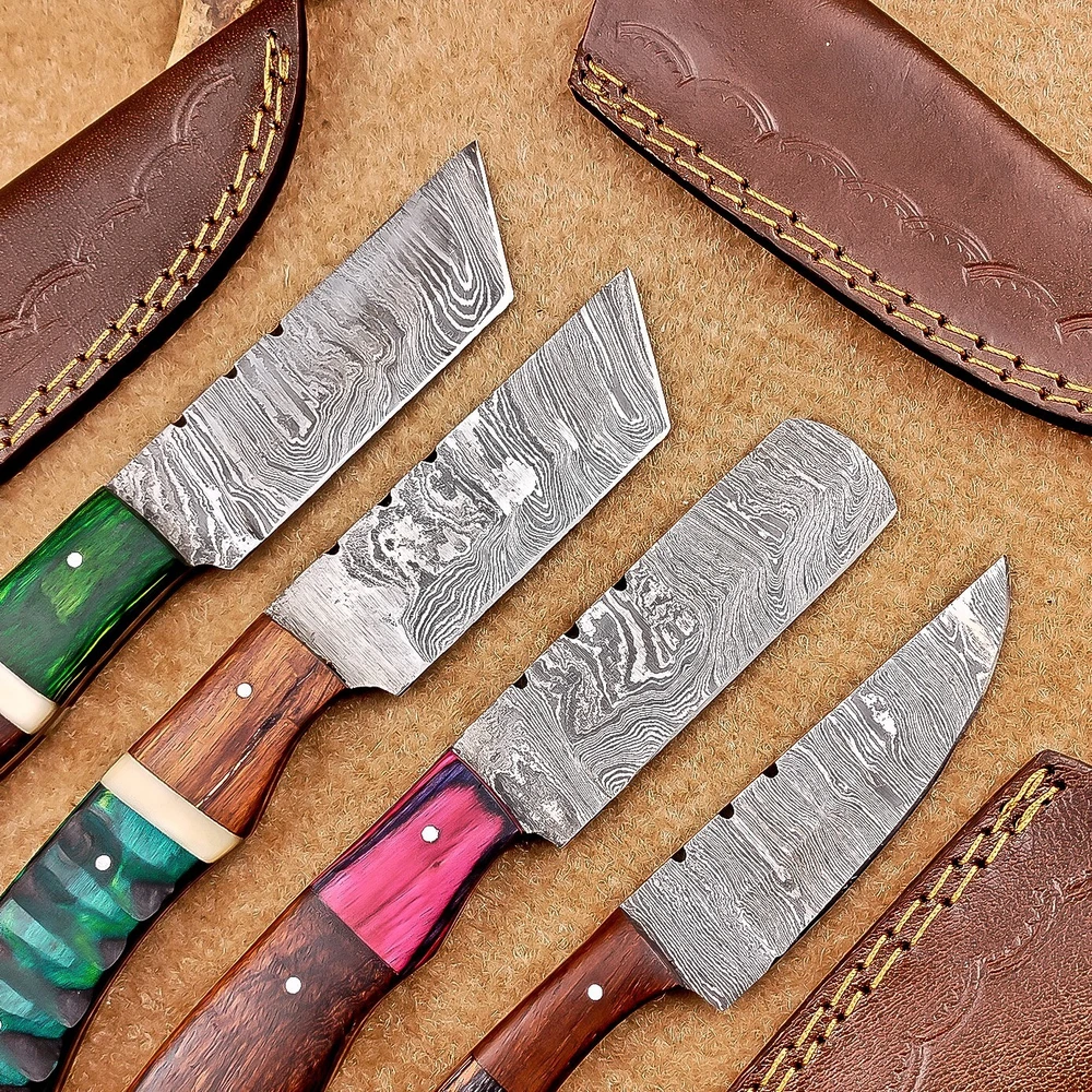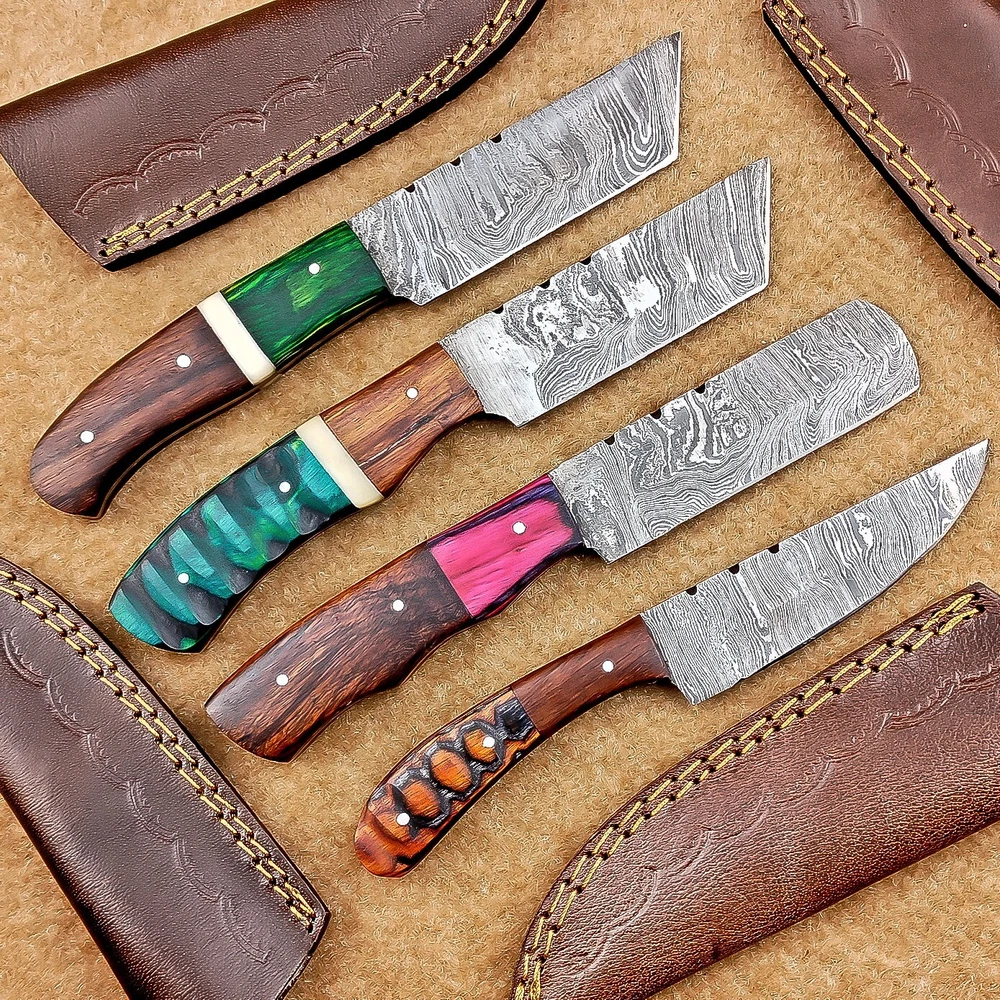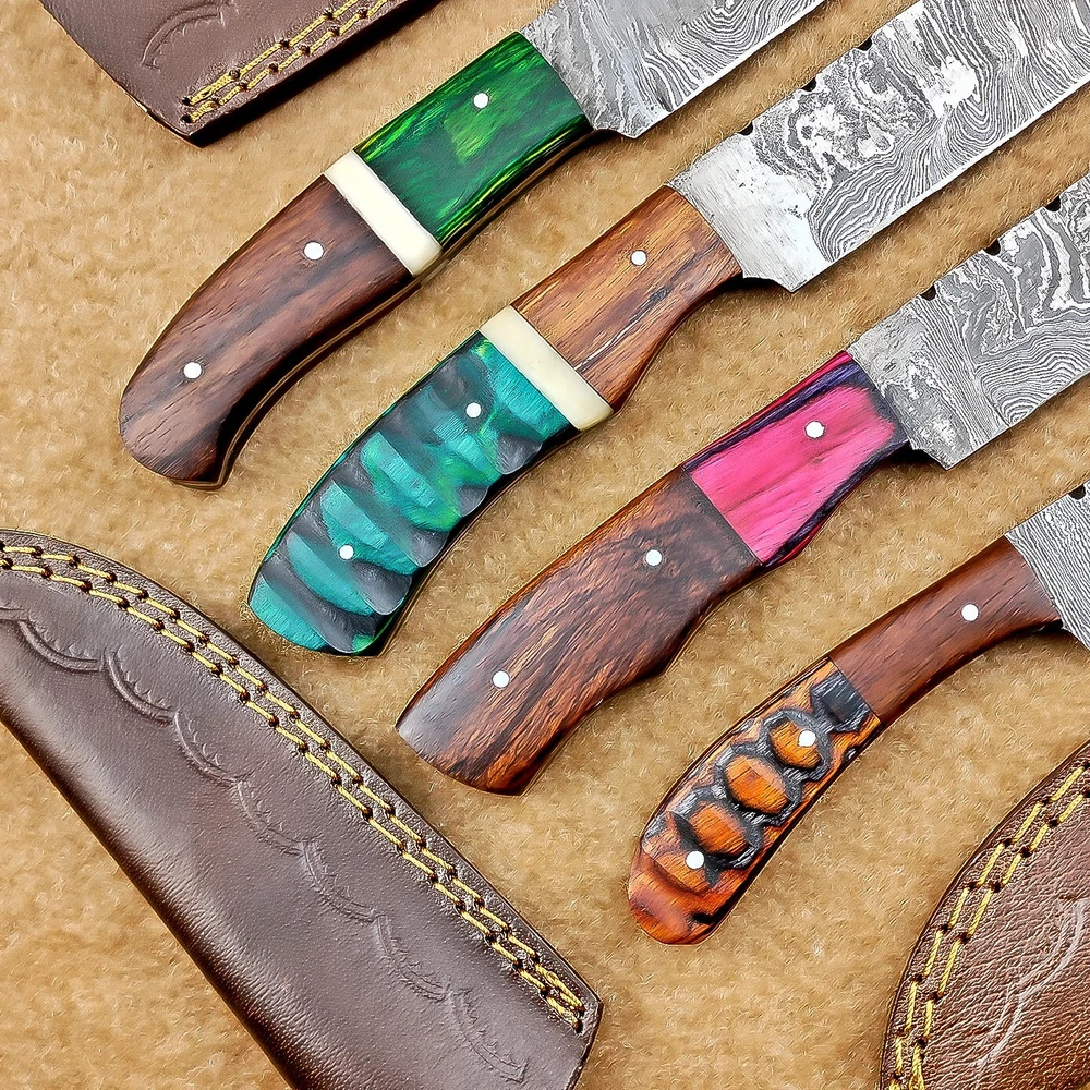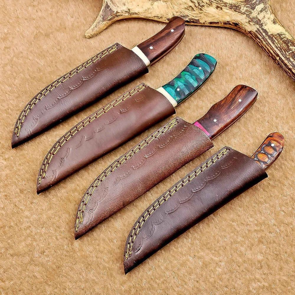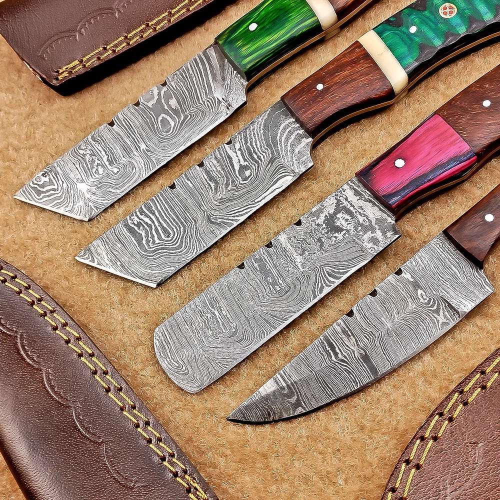 LOT OF 4 PCS! Handmade Damascus Hunting Knives , Skinner Knives Specifications: Overall Length: 8.0" Blade Thickness: ~4 mm Blade Material: Damascus Steel Handle Material: Hard wood with brass pins mosaic pin Includes: Leather sheaths Blade Craftsmanship: Blades are made from 1095 & 15N20 High Carbon Tool Steel with over 256 layers and a hardness of 58-60 HRC for durability and sharpness. Spine of the blade tang has excellent fire work. Care Instructions: Sharpen with a Diamond Wet Stone at a 20-degree angle. Clean with soap and water, dry thoroughly, and apply gun oil. Store away from the sheath to prevent rust. Important Notes for Buyers: Verify your country’s import regulations before purchase. Customs duties, if any, are the buyer’s responsibility. Shipping & Returns: Free shipping included. 14-day return policy applies. Contact Us: Message us anytime. We respond within 24 hours.
