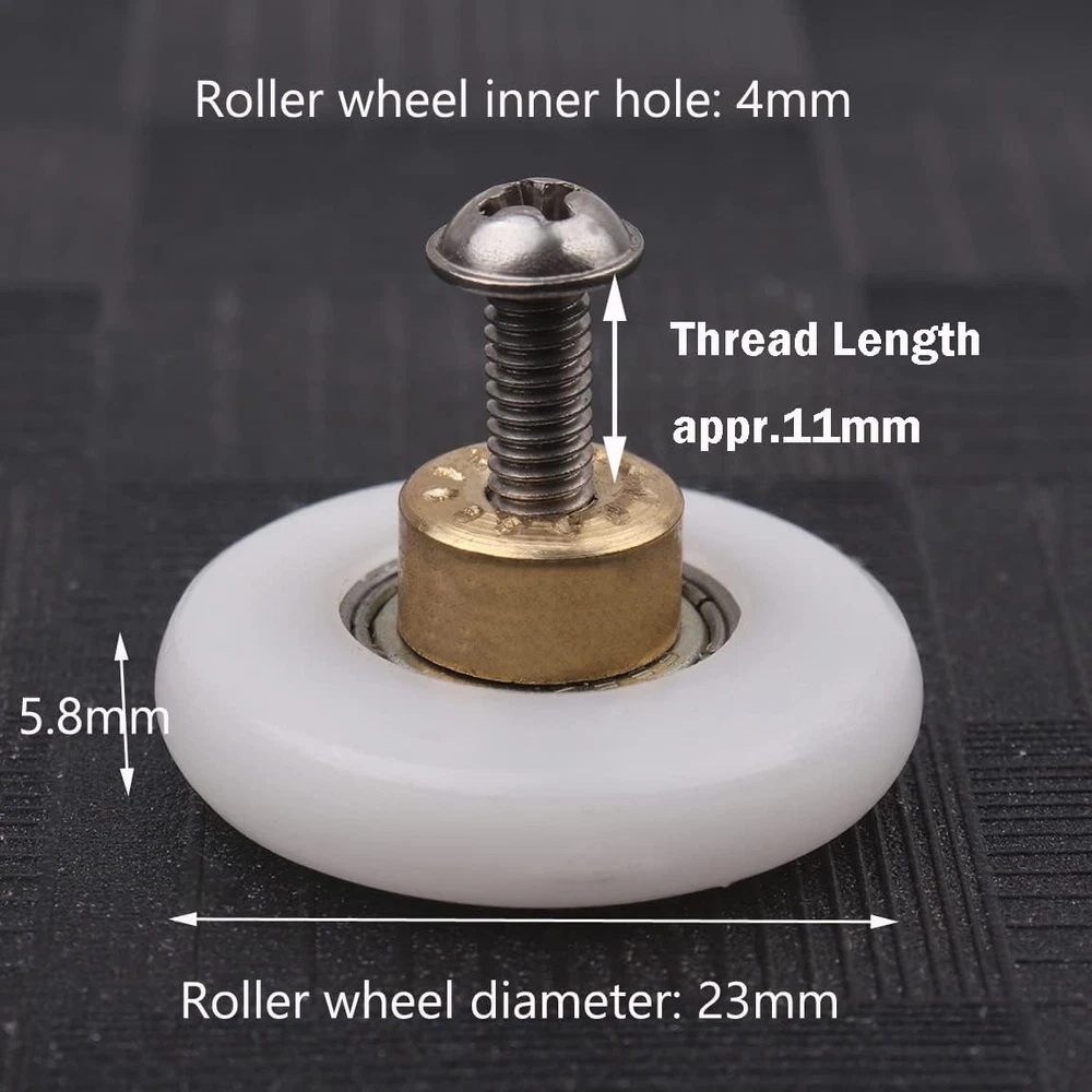 1. The Shower Door Rollers is made of copper and POM wheel, and the screw is made of stainless steel, which is corrosion-resistant, rust-proof and has good comprehensive performance. 2. The Shower Door Rollers has strong bearing capacity and good stability; the friction coefficient is small and the mute effect is good. 3. Easy to install, often used for bathroom glass sliding door pulleys/rails. Roller wheel diameter:23mm Comes with screws, suitable for 4-6mm thick shower doors. Roller wheel inner hole: 4mm, fixed with M4 screws. Roller wheel thickness: 5.8mm, Package included: 4 pcs Shower Door Rollers Runners Wheels (Note: Please measure the size you need before buying to choose the right size.) Product Description Note: Please measure the size you need before buying to choose the right size. Atoplee 4 pcs Shower Door Rollers Runners Wheels - Replacement Part Bathroom Glass Door Runner Sliding Shower Door Roller Wheel -Roller Diameter 23mm The Shower Door Rollers is made of copper + POM wheel, and the screw is made of stainless steel, which is corrosion-resistant, rust-proof and has good comprehensive performance. The Shower Door Rollers has strong bearing capacity and good stability; the friction coefficient is small and the mute effect is good. Easy to install, often used for bathroom glass sliding door pulleys/rails. Roller wheel diameter:23mm Comes with screws, suitable for 4-6mm thick shower doors. Roller wheel inner hole: 4mm, fixed with M4 screws. Roller wheel thickness: 5.8mm