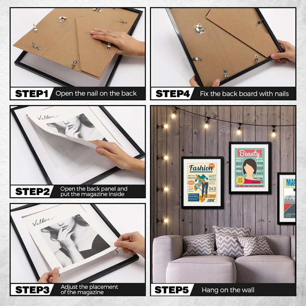 Store New Arrivals Add to Favorite View Feedback Contact 4 Pcs Sports Magazine Frame Fits Magazine Measuring 8.5 X 11.25 Inch Display Description Style Classic Number of Items 4 Theme Graduation Finish Types Matte Item Shape Rectangular Unit Count 4.0 Count Frame Material Polyvinyl Chloride Occasion Type Graduation Additional Features Foldable Finish Type Matte Frame Type as shown Target Audience Unisex-Adult Orientation Vertical Mounting Type Tabletop Color Black (White Mat) Cover Material Acrylic Shape Rectangular Back Material Type PVC Convenient Package: in the package, you receive 4 quality magazine frames; This is ideal for anyone eager to show off a series or a collection of their favorite magazines; Use them to make a coordinated display in hallways, living rooms, bedrooms, offices, or even in cafes and restaurants Suitable Sizing: these magazine frames for wall are designed with dimensions approximately at 11 x 14 inches, acute enough to occupy any space without looking out of place; They are ideally suited for magazines measuring around 8.5 x 11.25 inches; They do not take up unnecessary space while showcasing your favorite features, making them the ideal size for any wall or table display Clear and Engaging Display: thanks to the clear acrylic layer over the magazines, the picture frame represents your items vividly and life like, while also keeping them safe from dust and external breakage, which is safe to use as well; Be it photos, magazines, or certifications, this feature makes you appreciate and reminisce about the moments encapsulated in them better Easy Installation and Stylish Decoration: these picture frame holders come with handy install hangers, making them easy to mount on walls or place on the table, which can be hung vertically or horizontally; Metal picks on the back of the magazine frame that rotate for convenient magazine access; Showcase your style, creativity, and memories in these frames, enhancing your decorations Quality Material: when it comes to displaying your favorite digest, the frames for magazines do not disappoint; They are made of robust PVC material coupled with acrylic layers; These quality materials are known for their durability, ensuring you will be able to enjoy your magazine displays for the foreseeable future; With this material's protection, your magazine's integrity is ensured, preventing tearing, folding, or any other kinds of breakage Product Description Effortless display on desks, shelves, or any flat surface. Hassle-free magazine insertion and removal. Crafted with quality PVC frames and layered with crystal-clear acrylic for a polished and professional look. ABOUT US We offer the best prices around on high quality products. Our E-store includes media such as books, movies, music and games while offering electronics, toys, sporting apparel, clothing, tools, general home, garden items and more. SHIPPING We are always working hard to ensure your package arrives as soon as possible. Please understand that some factors like weather, high postal traffic, and the performance of shipping companies are outside of our control. We offer free shipping to the lower 48 states and ship within 2 business days of payment, usually sooner. We do not accept P.O. Boxes. Please provide a physical address. RETURNS We offer a 30-Day Return Policy on items which you are not completely satisfied with. You have the option for a full-refund or an exchange of the item. No returns are available on items shipped outside of the USA. PAYMENT We accept PayPal. CONTACT US This page content is yet to come Please ad us to your favorite seller and visit again later Thank You CUSTOMER SATISFACTION We try our very best to make sure every customer is completely satisfied. If there's a problem, message us! We're happy to help.