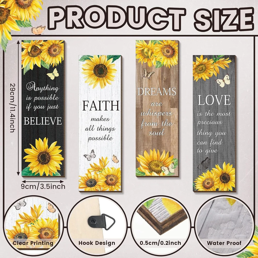 4 Pcs Sunflower Wall Decor Inspirational Kitchen Decors Multicolor Product Details Product Dimensions: 3.5 x 11.4 x 0.2 inches Item Weight: 9.1 ounces Manufacturer: Qunclay Country of Origin: China Item model number: WV-Qunclay-5246 Number of pieces: 4 Batteries required: No Valuable Package: there are 4 pieces of sunflower decorations for home in 4 different styles, 1 piece in each style, the adequate amounts and various styles can easily meet your daily use and replacement demands Inspirational Sunflower Themed Design: the sunflower wall decor is designed with yellow sunflowers, flying butterflies, inspirational words, and so on, vivid and lifelike, bright and delicate, and the words of [love], [faith], [believe], [dream] and more, can remind you to keep positive attitude to life Appropriate Size: the sunflower living room decor measures approx. 29 x 9 x 0.5 cm/ 11.4 x 3.5 x 0.2 inches, proper for use or storage, without taking up too much space, but can make your home look more colorful and energetic Quality Material for Long Time Use: the inspirational sunflower home decor is made of quality wood material, with clear and bright printings, sturdy and serviceable, which are reliable and reusable and not easy to fade, deform or break, offering you a long time decorating service Convenient to Hang: the sunflower kitchen decor with the matching hooks behind, can be hung, a good decoration for bathroom, bedroom, hallway, living room and dining room, without any requirement of auxiliary tool, pretty simple and easy to apply, creating retro and traditional atmosphere for your house