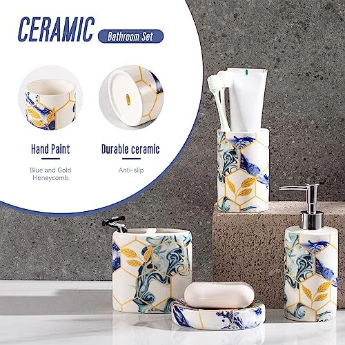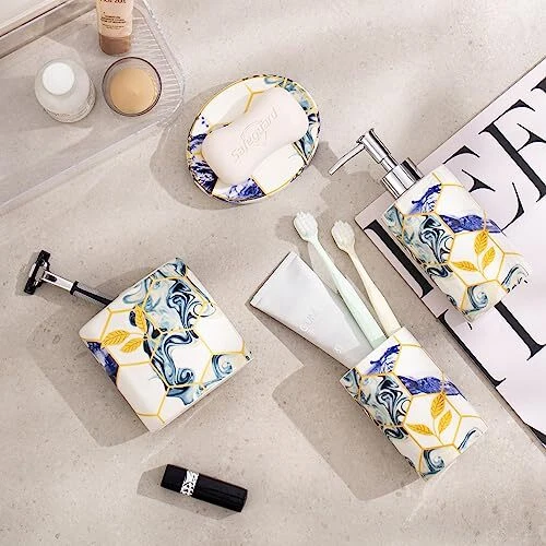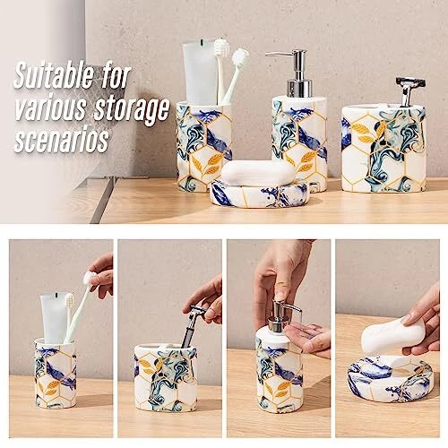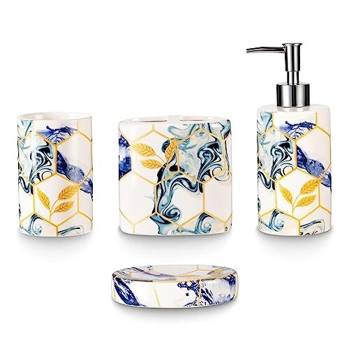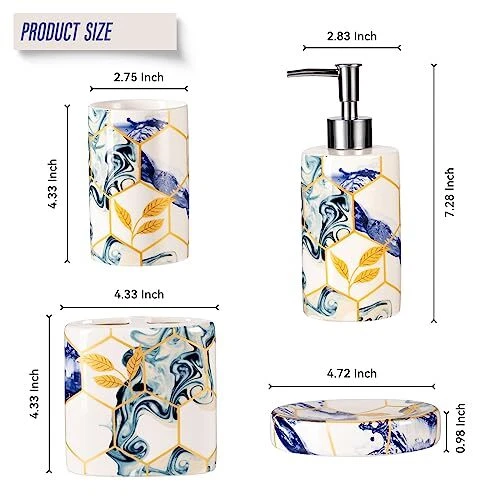 Return Policy Fast Delivery Trusted seller 4 Piece Sky Blue Geometric Bathroom Accessories Set with Navy Blue Abstract Art ,Bathroom Spa Sets Complete Bath Essential Toothbrush Holder Tumbler Soap Dispenser Soap Dish (Ceramic) Product Description Ceramic 【4pcs Bathroom Accessories Complete Set】: Include toothbrush holder, toothbrush cup, lotion dispenser, soap dish, meeting your daily cleaning, and washing needs. 【High-Quality Material】: High-quality ceramic, durable and easy-to-clean ceramic. High-quality ceramic bathroom accessories will be used for a long time, and their appearance will remain elegant and novel over time. 【Blue Bathroom Decor】: Use Sky blue and gold honeycomb marble design , put all the items together in your bathroom, dresses up your room nicely. Perfect for storing your toiletries and adding style to your bathroom counter. 【Functional】: Perfect accessories set for master bath, guest bath or kids bath. Also suitable for commercial use, looks good in hotels and restaurants. Make your bathroom desktop tidier. 【Perfect Gift Set】: This bathroom accessory set combines luxury and elegance. A great gift for family, friends, and coworkers that bring individuation and life to any bathroom. Shipping Returns Payment Shipping Shipping is FREE to all addresses other than APO/PO boxes in the lower 48 states. All our stock ships from US-based warehouses. Shipped via USPS or UPS (depending on location and package weight) Unless stated otherwise, all orders will ship within 24-72 hours of your payment being processed. Check our feedback to see the great reviews of FAST shipping we offer. Returns Seller does not accept returns Payment We currently accept payment via eBay managed payments only. Once payment is cleared, we will dispatch your shipment within 1-3 business days. Please refer to the "Shipping" tab for more information regarding shipping speed to your destination.
