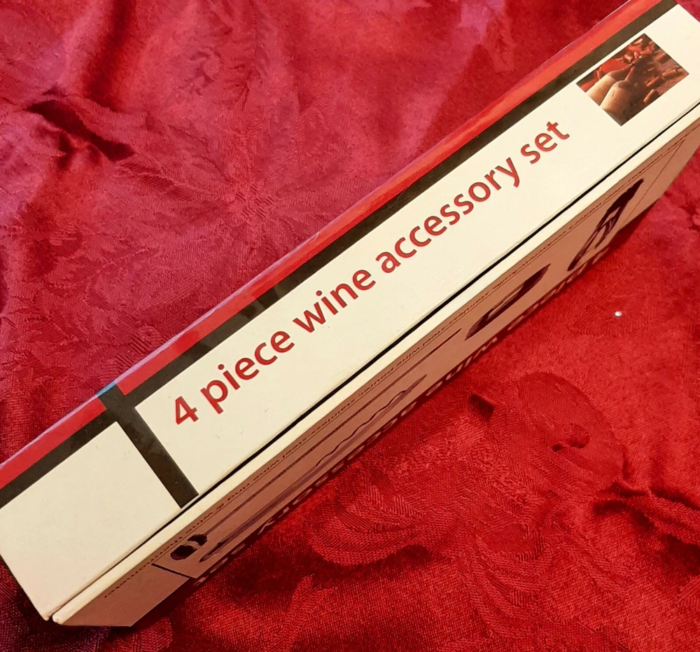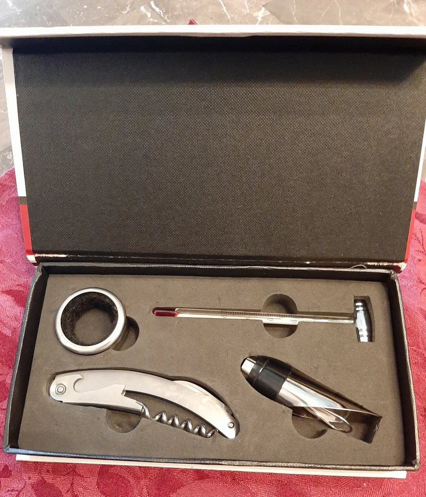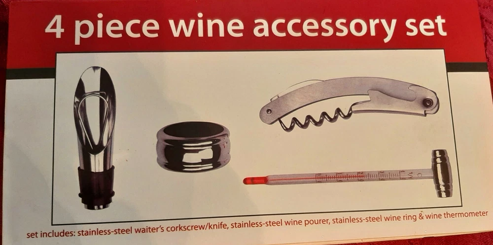 4 Piece Wine Accessory Set From Atico International USA. Stainless Steel. The boxed set includes: *Waiter's Corkscrew/Knife *Wine Pourer *Wine Ring *Wine Thermometer Shipping with USPS Priority Mail