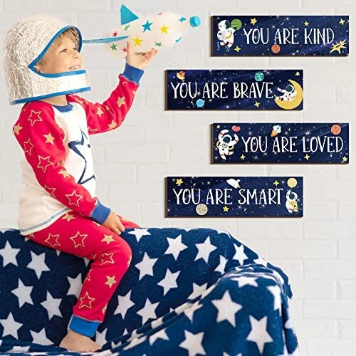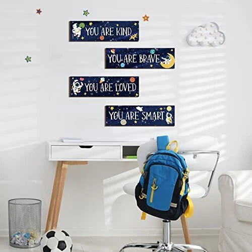 30 Days Return Policy Fast Delivery Trusted seller 4 Pieces Space Decor Boys Room Space Posters Boy Bedroom Wall Decor Spaceman Wood Sign Inspirational Space Wall Art Boys Bedroom Decor Space Motivational Quote for Baby Kids Classroom Nursery (You) Product Description Exquisite Outer Space Theme Room Decor: the package includes 4 pieces of solar system wall arts in various styles, equipped with hooks, allowing you to hang them on the wall or door without scratching the places, so you can install them with confidence Stylish Space Themed Design: the outer space bedroom decors are printed with many space themed patterns such as solar system, stars, moons, astronauts and more, vivid and lovely, which will be favored by most children especially for boys Suitable Occasions: the solar system room decors will catch the eyes of others quickly for classroom, living room, hallway, bedroom, study, nursery, dorm room, office and other rooms, showing you nice selection taste Hard to Break or Fade: the outer space kids room decors are made of quality wood and UV printed, sturdy and serviceable, well cut in shape and delicately printed in, not easy to break or fade and can accompany you for a long term Give You Courage: these motivational quote decors are meaningful and educational, designed with some uplifting and inspirational quotes, so they will not only help to make kids' rooms more interesting but also encourage your children to be braver and believe in themselves Shipping Returns Payment Shipping Shipping is FREE to all addresses other than APO/PO boxes in the lower 48 states. All our stock ships from US-based warehouses. Shipped via USPS or UPS (depending on location and package weight) Unless stated otherwise, all orders will ship within 24-72 hours of your payment being processed. Check our feedback to see the great reviews of FAST shipping we offer. Returns As our valued customer, we will do our best to make sure the product you receive arrives to you on time and as expected. If you are not satisfied with your purchase, please contact us within 30 days of receiving your order to process a return. Payment We currently accept payment via eBay managed payments only. Once payment is cleared, we will dispatch your shipment within 1-3 business days. Please refer to the "Shipping" tab for more information regarding shipping speed to your destination.