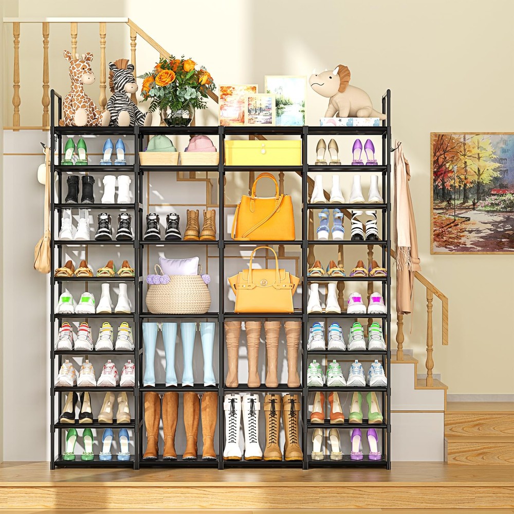 shoe rack shoe shelf shoe storage shoe organzier closet large shoe rack, boot storage 10 tier 72 pair metal shoe shelf black entryway shelves durable large big stackable cabinet free standing row sturdy LARGE CAPACITY 9 TIERS SHOE RACK --- Size: 68x 12x 66.5 Inches. Heightened and widened design make this large shoe rack stores up to 72-80 pairs adult shoes, won't wobble or topple. The height of this shoe storage rack can be freely assembled according to the needs of the shoes in different heights, such as Martin boots, women's boots, snow boot, high heels, sneakers, slippers, kid shoes, roller skate etc. EXPANDABLE & DIVIDABLE SHOE RACK--- You can DIY this big shoe rack according to your family storage needs. Split one big shoe rack into two or more storage racks, you can place the small shoe rack in closet, the other rack in your entryway, bedroom or living room. In any case, a sturdy organizer rack can keep your shoes or toys, tools well organized. DIY shoes racks, great solution to keep your entryway, closet, dormitory, garage... away from mess. STURDY COMPACT CONSTRUCTION ---large shoe organizer rack applied high quality PP as connectors and 13mm diameter sturdy smooth powder-coated corrosion-resistant metal pipes, good stability and prevent rusting, enables this shoe rack load much heavier duty and more durable while using. with 2 rows versatile hooks(10 hooks), 8 PP thick waterproof PP cover sheets, waterproof and easy to clean. DISASSEMBLED & ASSEMBLED FREELY---With hammer, the simple structure, numbered parts and detailed instructions, Let you can spend less time assembling. Please refer to the installation manual of the free standing shoe racks. DIY the shape you need (some shape show on product details picture). 100% SATISFACTION - offer LIFETIME professional customer service. If you have any question with our shoe rack, please let me know, we will full replacement ASAP! Tips: Use Warm water to soak the plastic part before use and use the Wooden Hammer provided for more Smoother installation.