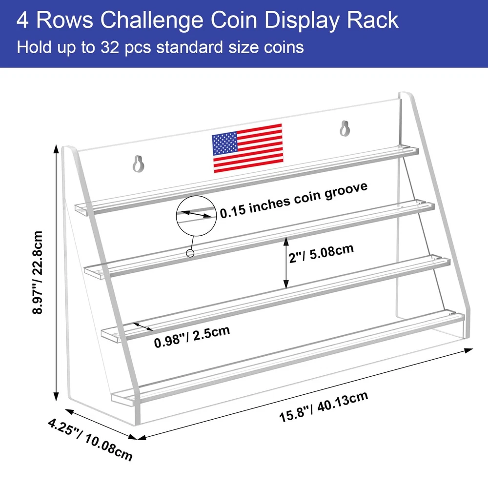 Coin Case Construction: Modern 4-tier challenge coin rake is made of sturdy & durable acrylic material. Premium quality, waterproof, don't worry about deformation, cracking and fading. Comes with one piece, no assembly required. Dimensions: 15.8"W X 9"H X 4.25”D. Coin Collection Holder Capacity: Ample storage to display, this challenge coin display stand can hold up to 32 Standard size challenge coins (Challenge coin not included). Built-in grooves on each shelf to secure the coins from sliding. Groove width is 0.15 inch, too thickness Coins would be not suitable. Coin Shelf Multipurpose Design: Stable triangle design, free standing-working perfectly on any desktop, tabletop or shelf. It can also be hung on the wall décor using the 2 pre-drilled holes (screws included). So you can choose different mode according to your needs and placed anywhere you want to display. Unique Memorial Gift: Designed for variety of any challenge coin like navy challenge coins, firefighter challenge coin, military coin, police challenge coins, medals, casino poker chips and equivalent sized collectibles. As a perfect choice for coin collectors, veterans, army as a housewarming, birthday, graduation, retirement, memorial, military gift. Honors should be treated with preciousness, the display case is particularly important. Quality guarantee and customer Service: highly value customers' satisfaction and tolerate zero quality issue. If you're not thrilled with its performance, please feel free contact us and let us know.
