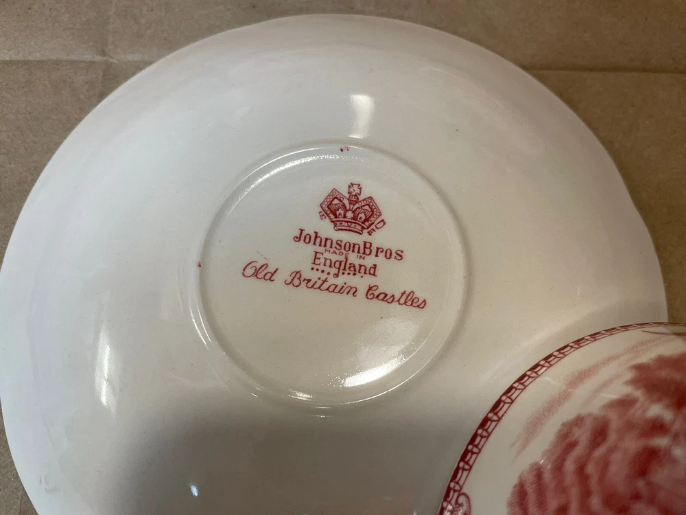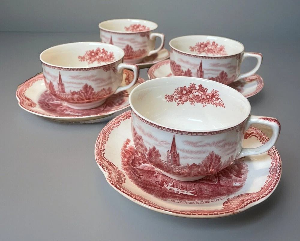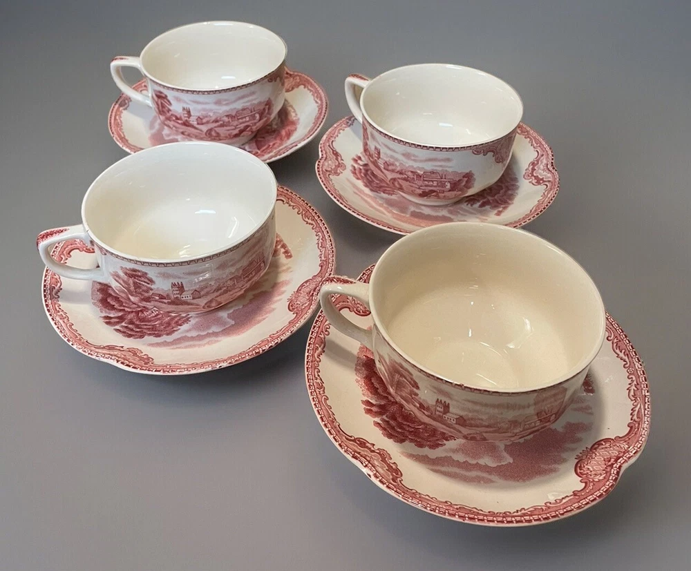 Add a touch of elegance to your tea time with this set of four Crown Mark Johnson Brothers' Old Britain Castles cups and saucers. The porcelain material and beautiful pink and red color combination make these cups and saucers a perfect addition to your collection. The set includes cups and saucers, and is an original piece made in the United Kingdom. Impress your guests with these stunning cups and saucers, perfect for any occasion. No stains (shadows). More available