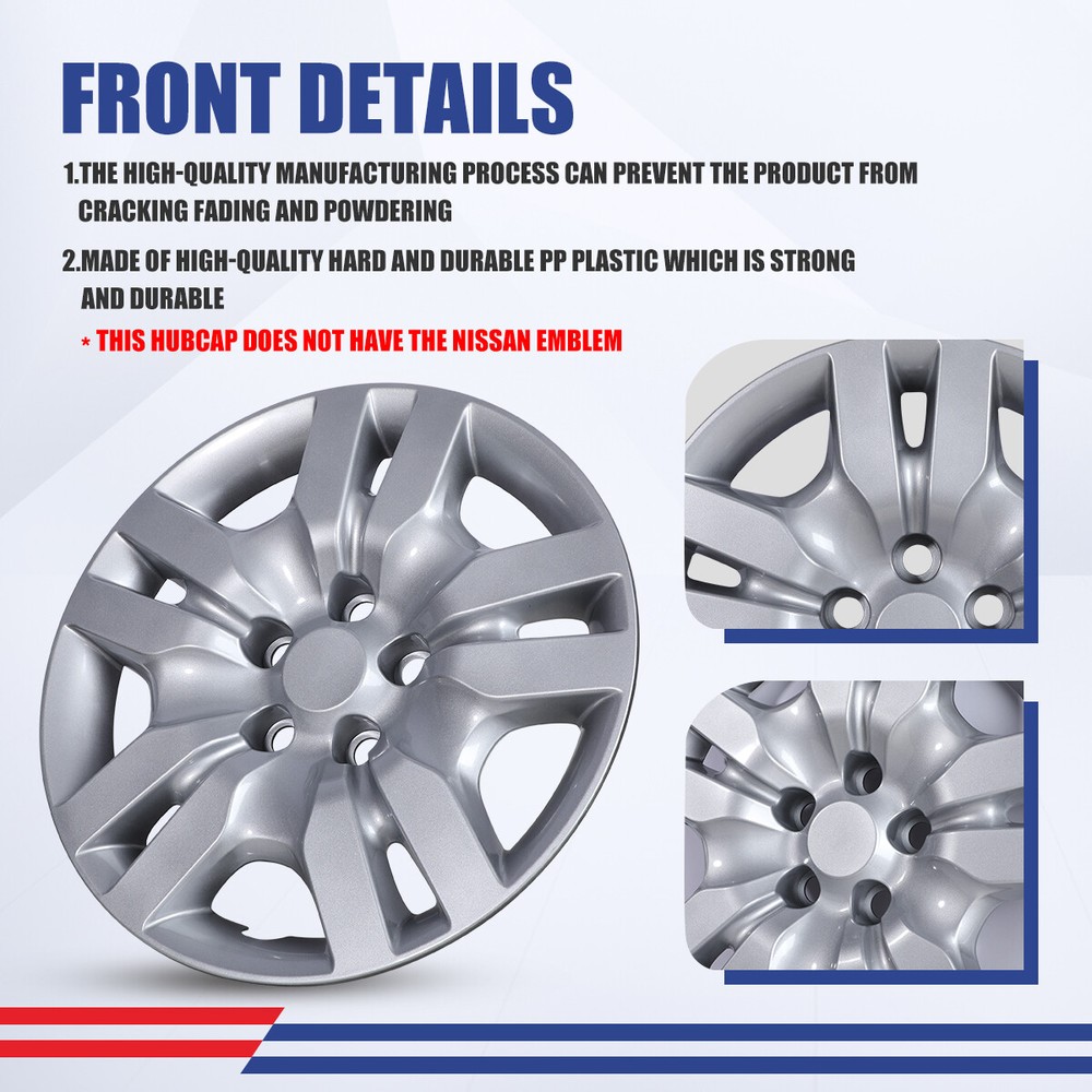 4x 16" Wheel Rim Cover for 2007-2012 Nissan Altima/2008-2009 Nissan Altima Coupe Fitement: For 2007-2012 Nissan Altima/2008-2009 Nissan Altima Coupe Description: π Fits: For 2007-2012 Nissan Altima/2008-2009 Nissan Altima Coupe π Seamless OEM Fit: Precision-engineered to match the exact specifications of your vehicle's original hubcaps, ensuring a flawless fit that seamlessly integrates with your car's design. π Durable Construction: Crafted from high-quality materials for enhanced durability, our replacement hubcaps are built to withstand daily wear and tear, providing long-lasting performance and protection. π Enhanced Aesthetics: Restore the sleek, factory-fresh look of your vehicle with our OEM replacement hubcaps, designed to maintain the aesthetic appeal of your car while covering unsightly wheel components. π Cost-Effective Solution: Save on dealership prices without compromising on quality. Our hubcaps offer a budget-friendly alternative to OEM parts, giving you a reliable and affordable replacement option. Specification: Quantity: 4 PCS Material: ABS Color: Silver Wheel Size: 16 inch Finish: Glossy Placement on VehicleοΌFront/Left/Rear/Right Package Included: 1 Set Hubcaps οΌ4Pcs/SetοΌ Payment Delivery details Terms of sales About us Contact us Payment π We accept PayPal (Recommended), credit card, VISA, Google Pay & Discover etc. π Please submit your payment within 7 days after your purchase. π If not, eBay will automatically open an Unpaid Item Dispute on our behalf if the item(s) are not paid within 7 days. Delivery details π Please double check your delivery address and contact information. π All items will be shipped within 1 business days after payment received. π Tracking numbers will be easily accessible ASAP they are created and processed. Terms of sales π Free 30 days Return, we will cover the return post fee. π If a defective product was received, please do not hesitate to message us via eBay message. π We will response in 24 hours in business to resolve the problem π We stand behind our products. Items can be returned for exchange or full refund within 30 days from the date you receive. About us π Wolfstorm has a huge warehouse and office located in the United States. π All US domestic 48 states customers are able to benefit from the FREE SHIPPING services. π Our experienced, professional customer service representatives offers prompt and courteous service. π Best quality products, outstanding services and professional experience keep our customers. Contact us π Please feel free to contact us if you have any problems. π Emails will be replied within 24 hours in working days. π After hours emails will be replied on the next business day. On Jun 3, 2025 at 00:20:47 PDT, seller added the following information: