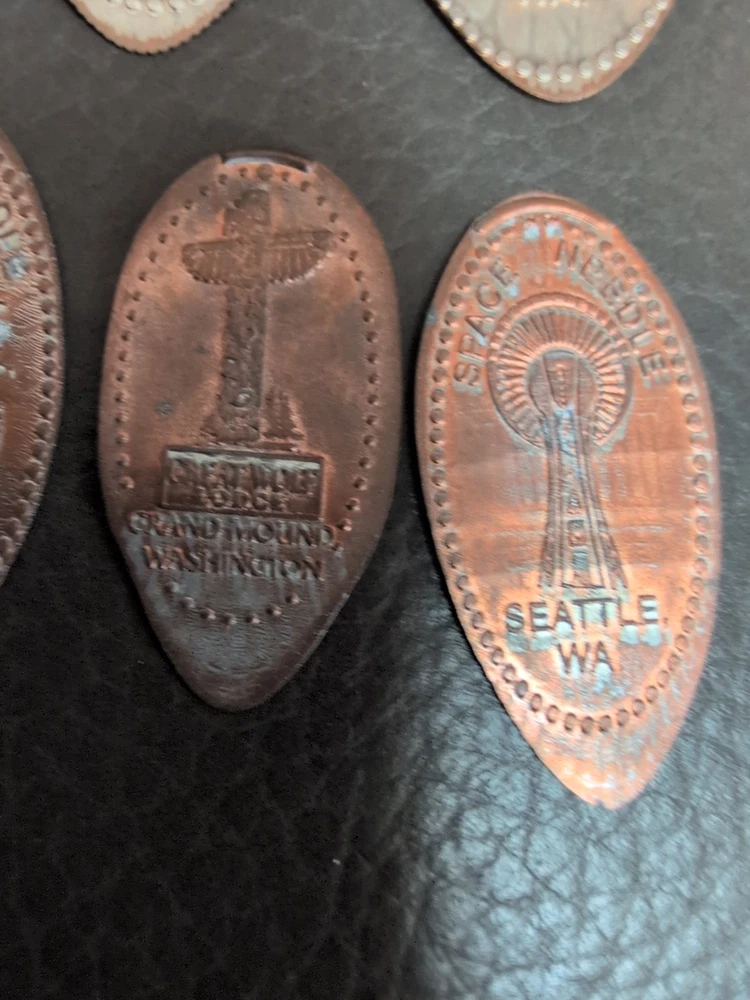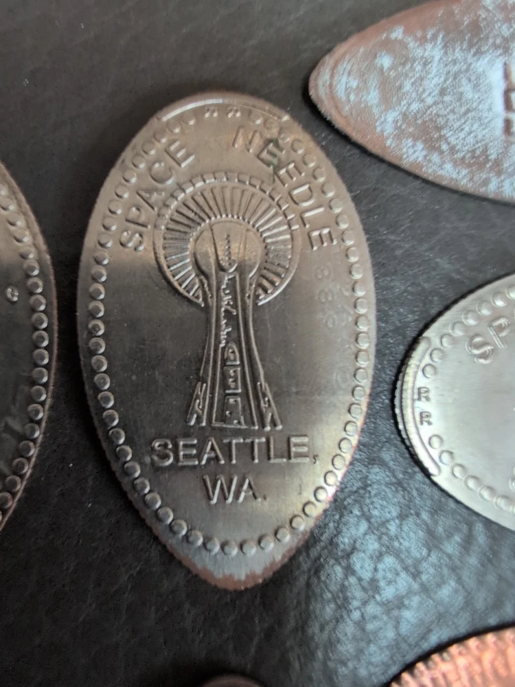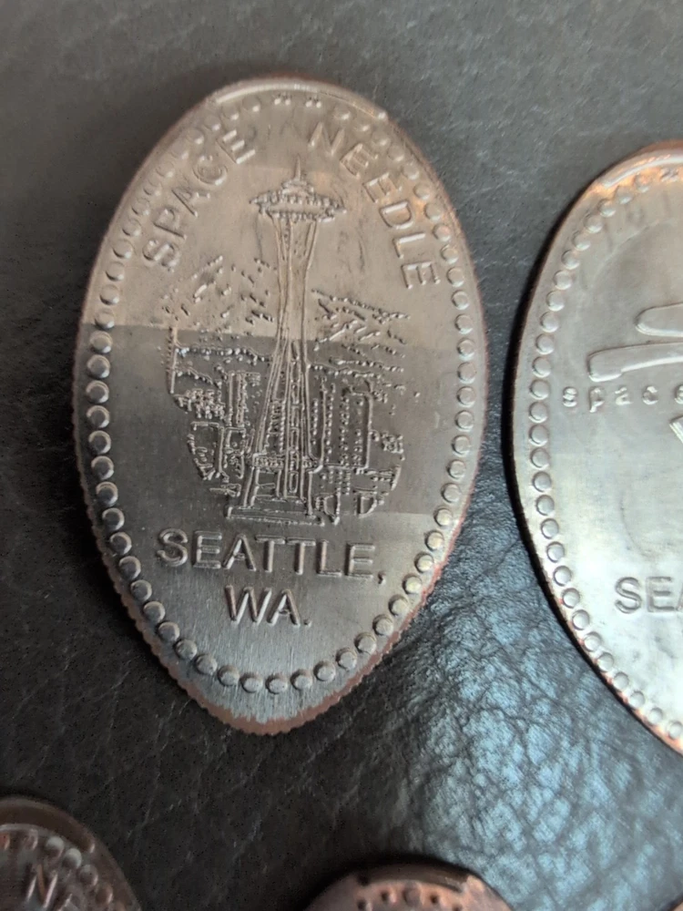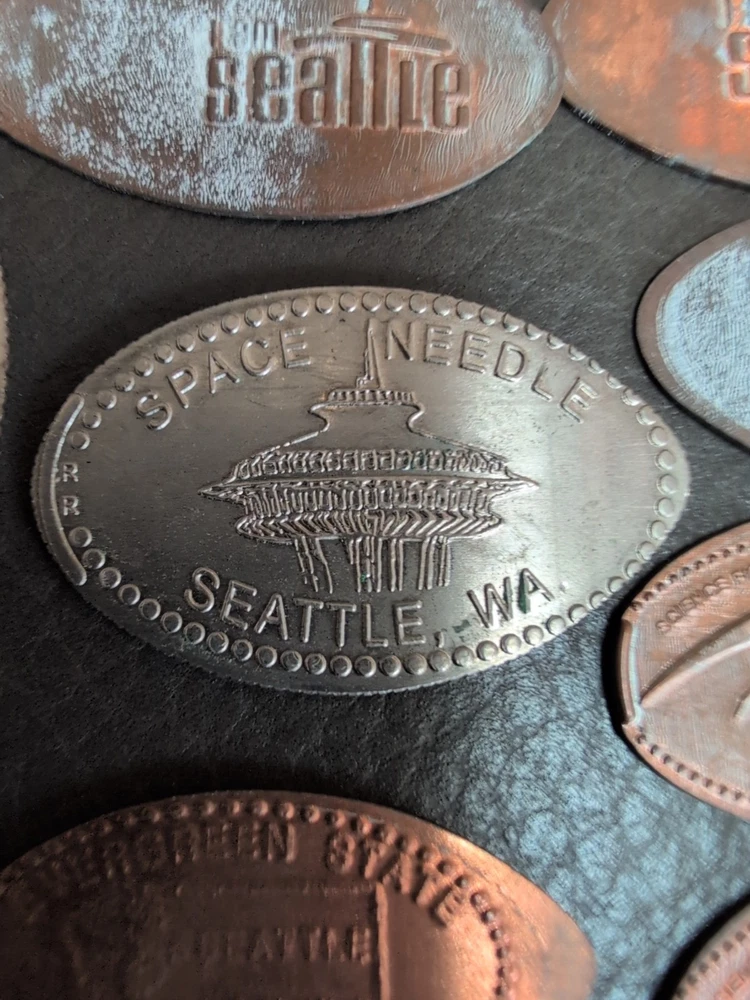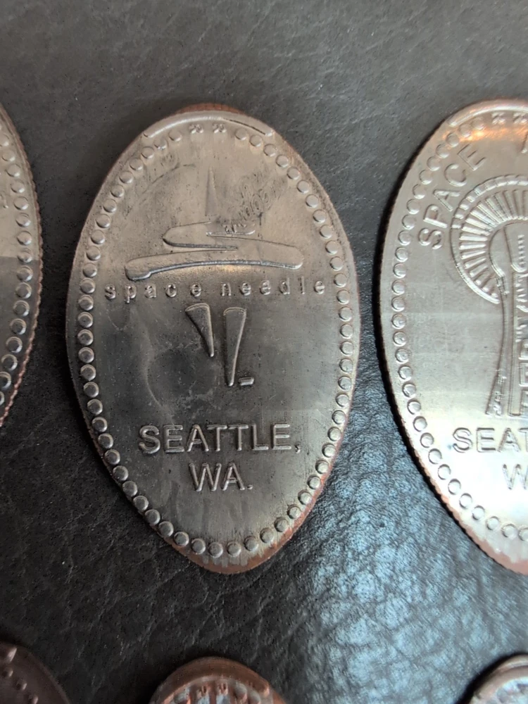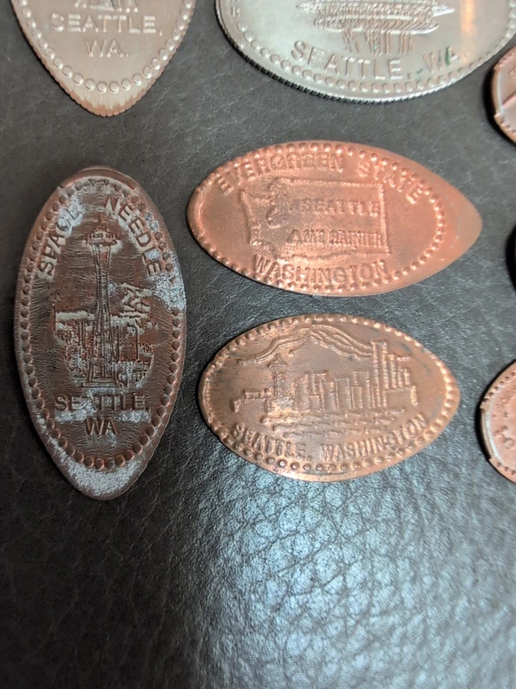 The product is a unique set of 4 Space Needle Seattle WA pressed smashed quarters and 16 pressed pennies. These elongated coins were modified by being pressed with various designs and images of the Space Needle from Seattle, Washington. The coins are from the United States and are circulated, making them a special and customized addition to any coin collection. Perfect for collectors of exonumia or those interested in unique and novelty coins. See pictures for details.
