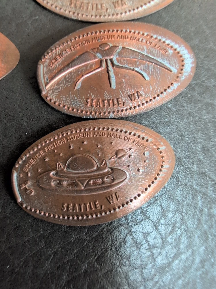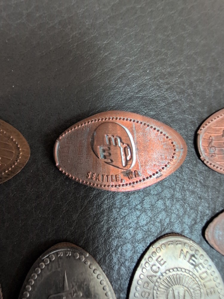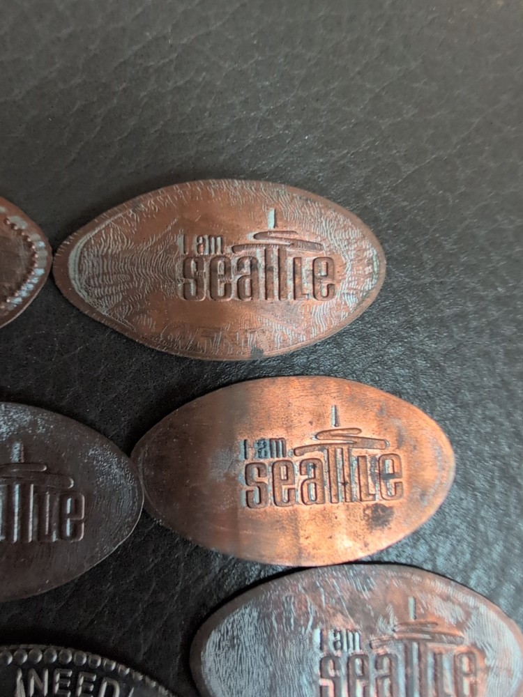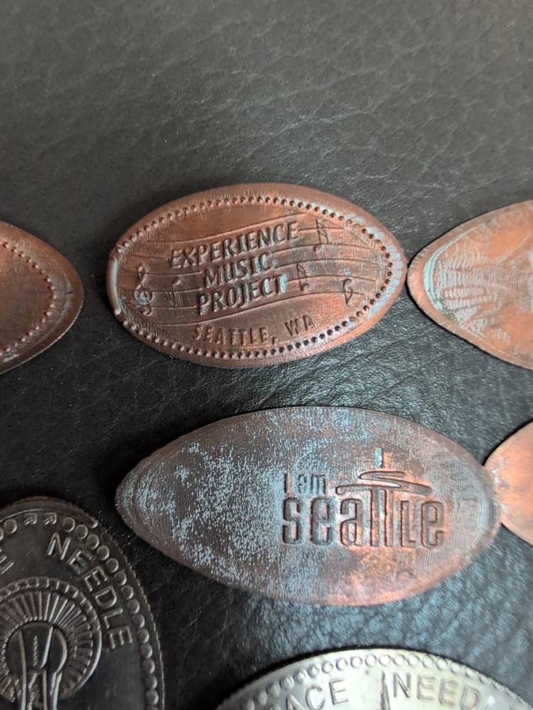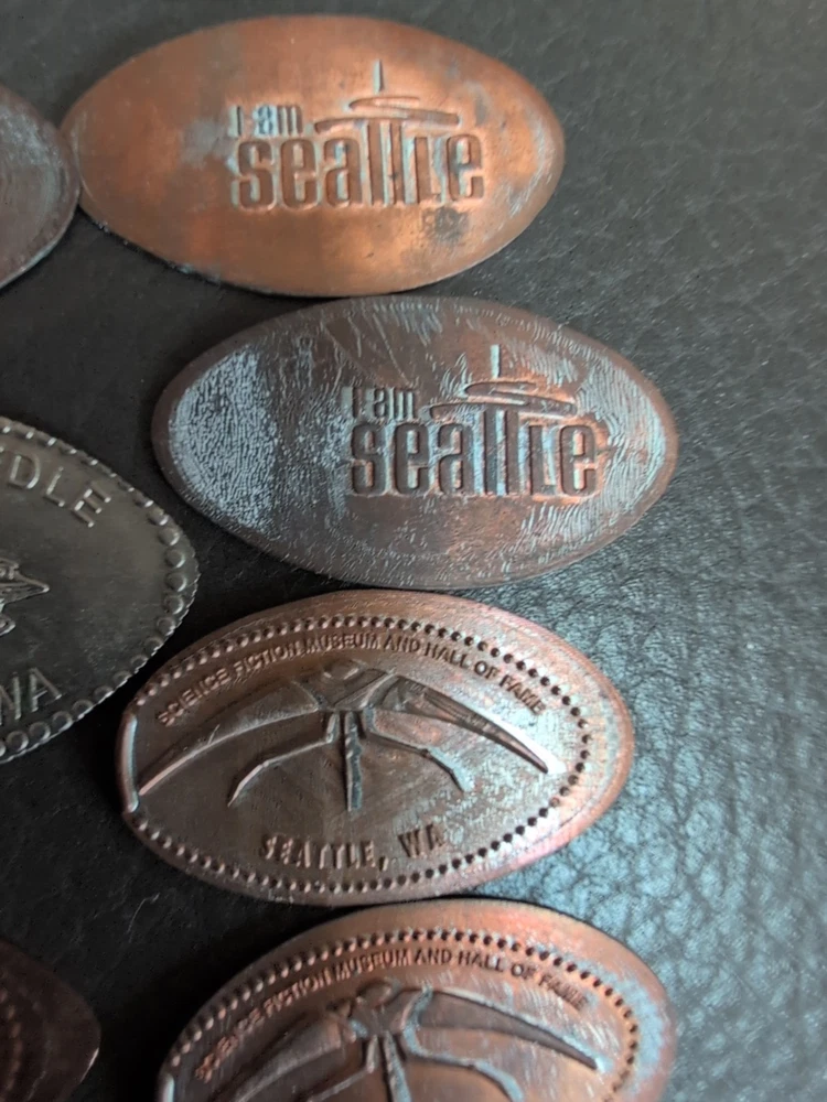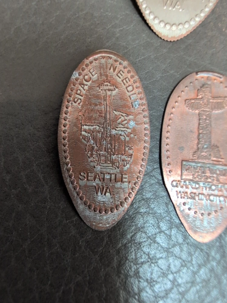 The product is a unique set of 4 Space Needle Seattle WA pressed smashed quarters and 16 pressed pennies. These elongated coins were modified by being pressed with various designs and images of the Space Needle from Seattle, Washington. The coins are from the United States and are circulated, making them a special and customized addition to any coin collection. Perfect for collectors of exonumia or those interested in unique and novelty coins. See pictures for details.