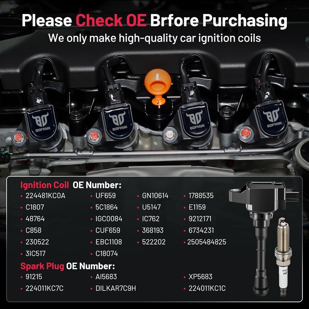 4pcs Ignition Coils + 4pcs Spark Plugs For Nissan Juke 1.6L L4 11-17 UF659 91215 Note: Please check eBay's compatibility table, Item specifics as well as the product description to ensure this is the correct part for the correct application Introduction A faulty ignition coil & spark plug may result in engine misfire, rough engine idle, decrease in power, poor fuel economy etc. Every component either matches or improves on the OE design to ensure fast and easy installation with superior performance and reliability, to provide superior cold-start performance and a smoother running engine. Fitment (for reference only) For Nissan Juke 1.6L L4 2011-2017 OEM/ Part Number Ignition Coil: UF659, UF-659, 224481KC0A, 22448-1KC0A, 48764, GN10614, C1807 Spark Plug: 91215, DILKAR7C9H Features - Each product is tested to perform as well as the original units and in many cases to exceed the manufactures specification. - High-impact housing material ensures superior to epoxy for longer life in all operating conditions. - Copper wires using higher insulation grade ensure heat resistanceand prevent high voltage breakdown. - Isolator manufactured using high voltage-resistant thermoplastics to prevent premature coil failure. Package included 4PCS Ignition Coils + 4PCS Iridium Spark Plugs(Showing as the picture) Specification * Terminal Type: Blade * Mounting Hardware Included: No * Connector Type: Plug In * Mount Type: Bolt On * 1 year warranty for any manufacturing defect * Increased Ignition Performance --- High voltage output and spark energy * Improved combustion * Improved throttle response and smoothness * No spark blowout at higher boost * Direct fit for factory mountings * 100% Performance Testing * 100% New Premium Component * Meet or Exceed OEM Specifications * Terminal Quantity: 3 * Terminal Type: Blade * Voltage: 12V * Spark Plug Material: Iridium Notice: - This is aftermarket replacement item but not OEM. - No instruction included; professional suggested. - Please double confirm the fitment details before purchasing. - Please make sure the replacement part number matches the part you are replacing. - Please feel free to contact us for whatever we can help for you. Payment Delivery details Terms of sales About us Contact us Payment 1.We only accept PayPal. PayPal is the only online payment method we accept. Please make sure you have a valid/confirmed PayPal account prior bidding. 2.All Paypal Payments must be Confirmed. Payment must be made within 48hrs of the auction end time. Non-Paying bidders will be reported. 3.When you get your package,maybe you will pay some charges, it's taxes for local customs,not pay to us, and the fees are depends on the customs, all buyer are same. Delivery details 1.Items will be shipped within 2 business days after payment is received. 2.We ship to your eBay address. Please make sure your eBay address is correct. Buyer takes responsibility if eBay address is wrong. 3.Import duties, taxes and charges are not included in the item price or shipping charges. Please check with your country customs office for these additional charges. 4.We shipping using UPS or USPS from our nearest warehouse to you. Tracking numbers will be emailed upon shipment. Terms of sales 1.Please feel free to email us if you have any question. 2.We appreciate you contact us via eBay message when you are not satisfied rather than open case or leave negative feedback directly. We'll try our best to solve the issue. 3.Refund will be issued once we receive your returned items. Buyer is responsible for all return shipping charges. 4.Please contact us for return process before you return the item. 5.All items for exchange or refund must be returned in "as new" condition. About us We are the responsible seller ,always provide high-quality products and best service .If you have any questions, please contact us, and will try our best to help you. Please contact us by eBay Message, and we will reply you within 24 hours. Thank you very much! Contact us We are the professional auto parts manufacturer , and provide line lock, AN hose end fittings , fuel line , fuel filter , fuel regulator , exhaust cutout , exhaust tips , exhaust muffler and so on .The quality of the product to be secured. If you have any questions or any needs , please contact us , and will try our best to help you.