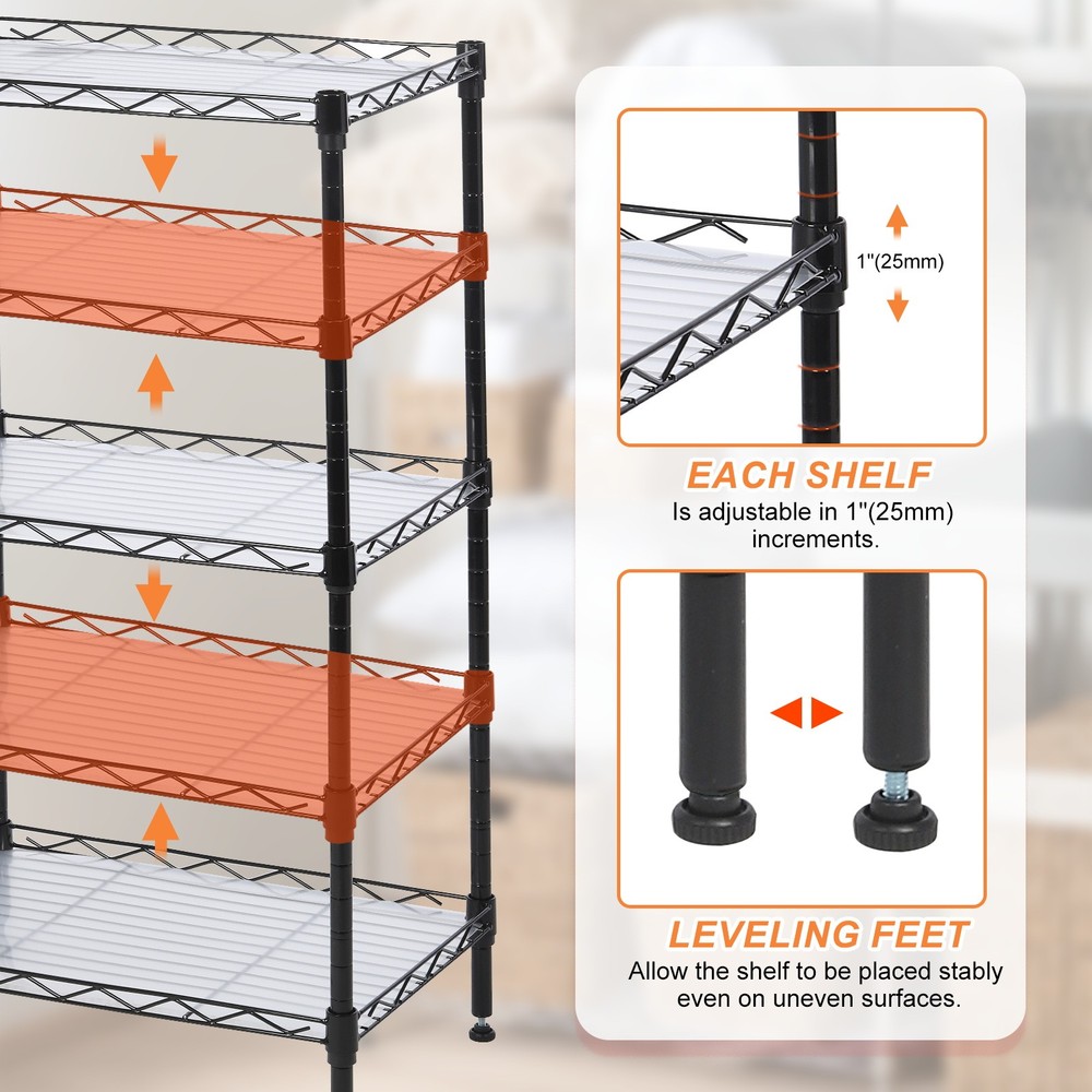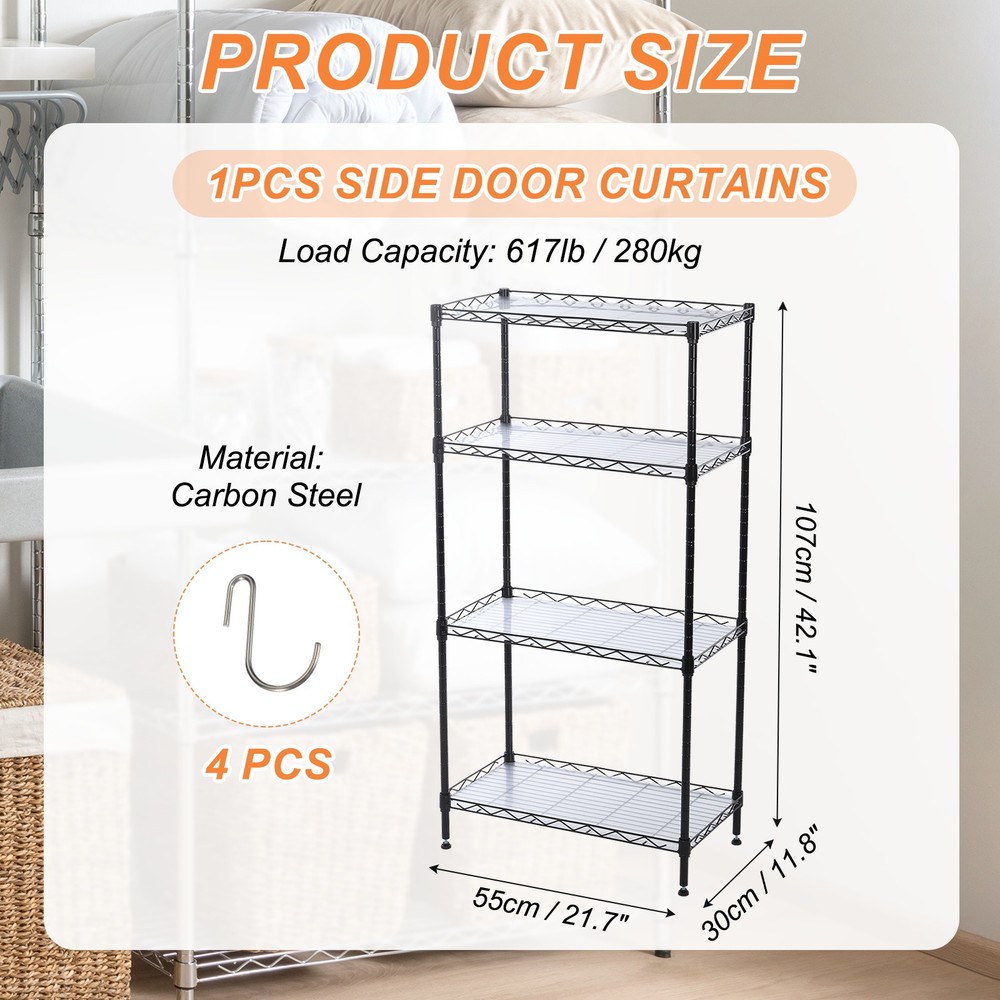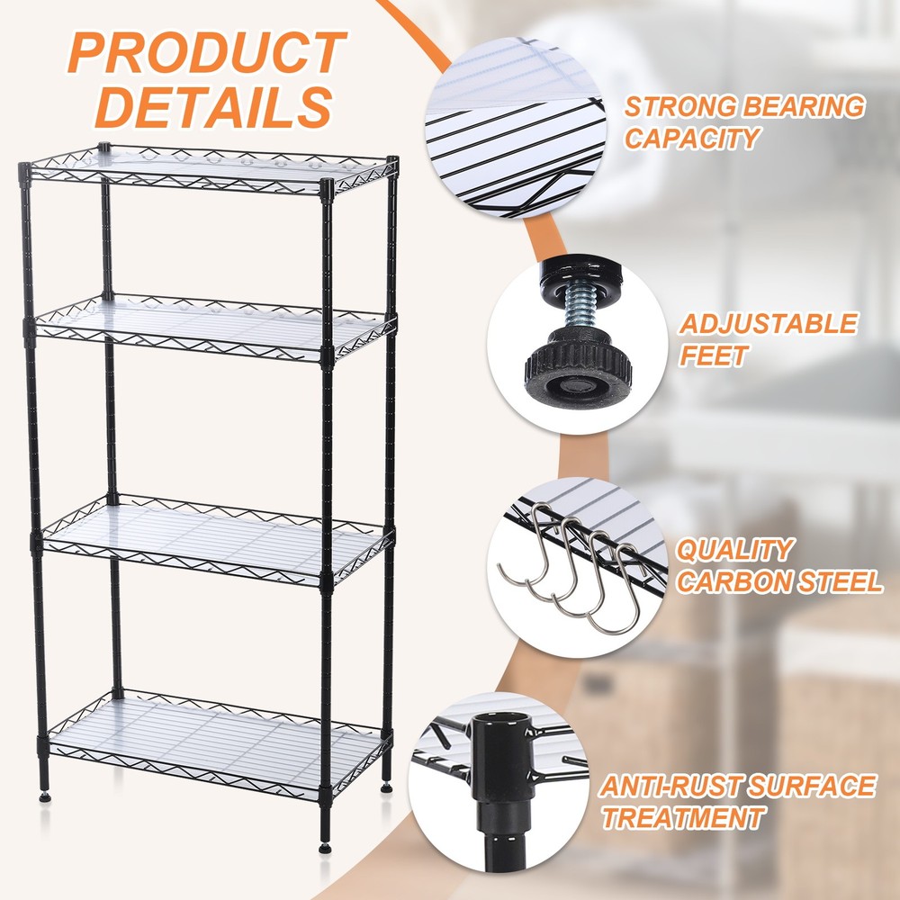 Document What is this?The 4-layer shelf provides large storage space, suitable for places with limited space but large storage space is required. The organizer wire rack can be used in garages, laundry rooms, kitchens, bathrooms, doorways, offices, storage rooms, etc.What will I get?Color: BlackMaterial: Carbon SteelOverall Size: 55 x 30 x 107 cm / 21.7" x 11.8" x 42.1" (L*W*H)Load Capacity: 617lb / 280kgPacking List: 1Pcs x Adjustable Storage ShelfIs there any advantages of the product?1. Made of thickened carbon steel, adjustable rack organizer is strong, durable, stable, oxidation-resistant, rust-proof, and has a strong load-bearing capacity. The total load-bearing capacity after assembly can reach 617lb(280kg).2. Designed with leveling feet, the storage rack can be placed stably even on uneven ground, making storage safer. Equipped with foot pads to increase stability and avoid scratching the floor during movement.3. The wire mesh sheets are encrypted to ensure more stable storage and stronger load-bearing capacity. Equipped with pads for placing on the mesh, small items can also be placed safely.4. The wire shelving unit adopts an adjustable design, and the height of each layer can be adjusted according to the size of the stored items to meet different storage needs.How to use it?No screws are required for installation. Just press lightly with your hands to easily assemble this wire rack. The required accessories and installation manual are provided to help with installation.What should I notice?Please do not overload it to avoid structural damage that may cause items to fall or be damaged. 4 Tier Adjustable Storage Shelf 21.7"L x 11.8"W x 42.1"H Organizer Rack, Black What is this? The 4-layer shelf provides large storage space, suitable for places with limited space but large storage space is required. The organizer wire rack can be used in garages, laundry rooms, kitchens, bathrooms, doorways, offices, storage rooms, etc. What will I get? Color: Black Material: Carbon Steel Overall Size: 55 x 30 x 107 cm / 21.7" x 11.8" x 42.1" (L*W*H) Load Capacity: 617lb / 280kg Packing List: 1Pcs x Adjustable Storage Shelf Is there any advantages of the product? 1. Made of thickened carbon steel, adjustable rack organizer is strong, durable, stable, oxidation-resistant, rust-proof, and has a strong load-bearing capacity. The total load-bearing capacity after assembly can reach 617lb(280kg). 2. Designed with leveling feet, the storage rack can be placed stably even on uneven ground, making storage safer. Equipped with foot pads to increase stability and avoid scratching the floor during movement. 3. The wire mesh sheets are encrypted to ensure more stable storage and stronger load-bearing capacity. Equipped with pads for placing on the mesh, small items can also be placed safely. 4. The wire shelving unit adopts an adjustable design, and the height of each layer can be adjusted according to the size of the stored items to meet different storage needs. How to use it? No screws are required for installation. Just press lightly with your hands to easily assemble this wire rack. The required accessories and installation manual are provided to help with installation. What should I notice? Please do not overload it to avoid structural damage that may cause items to fall or be damaged. Hot Item Payment 1.We accept eBay payment . 2.Payment must be received within 7 business days of auction closing. Shipping 1.We ship to your eBay or Paypal address. Please make sure your eBay and Paypal address is correct before you pay. 2.Items will be shipped within 1-3 business day when we received payment. 3.Delivery time depends on destination and other factors. Description Policy 4 Tier Adjustable Storage Shelf 21.7"L x 11.8"W x 42.1"H Organizer Rack, Black What is this? The 4-layer shelf provides large storage space, suitable for places with limited space but large storage space is required. The organizer wire rack can be used in garages, laundry rooms, kitchens, bathrooms, doorways, offices, storage rooms, etc. What will I get? Color: Black Material: Carbon Steel Overall Size: 55 x 30 x 107 cm / 21.7" x 11.8" x 42.1" (L*W*H) Load Capacity: 617lb / 280kg Packing List: 1Pcs x Adjustable Storage Shelf Is there any advantages of the product? 1. Made of thickened carbon steel, adjustable rack organizer is strong, durable, stable, oxidation-resistant, rust-proof, and has a strong load-bearing capacity. The total load-bearing capacity after assembly can reach 617lb(280kg). 2. Designed with leveling feet, the storage rack can be placed stably even on uneven ground, making storage safer. Equipped with foot pads to increase stability and avoid scratching the floor during movement. 3. The wire mesh sheets are encrypted to ensure more stable storage and stronger load-bearing capacity. Equipped with pads for placing on the mesh, small items can also be placed safely. 4. The wire shelving unit adopts an adjustable design, and the height of each layer can be adjusted according to the size of the stored items to meet different storage needs. How to use it? No screws are required for installation. Just press lightly with your hands to easily assemble this wire rack. The required accessories and installation manual are provided to help with installation. What should I notice? Please do not overload it to avoid structural damage that may cause items to fall or be damaged. Hot Item Payment 1.We accept eBay payment . 2.Payment must be received within 7 business days of auction closing. Shipping 1.We ship to your eBay or Paypal address. Please make sure your eBay and Paypal address is correct before you pay. 2.Items will be shipped within 1-3 business day when we received payment. 3.Delivery time depends on destination and other factors.
