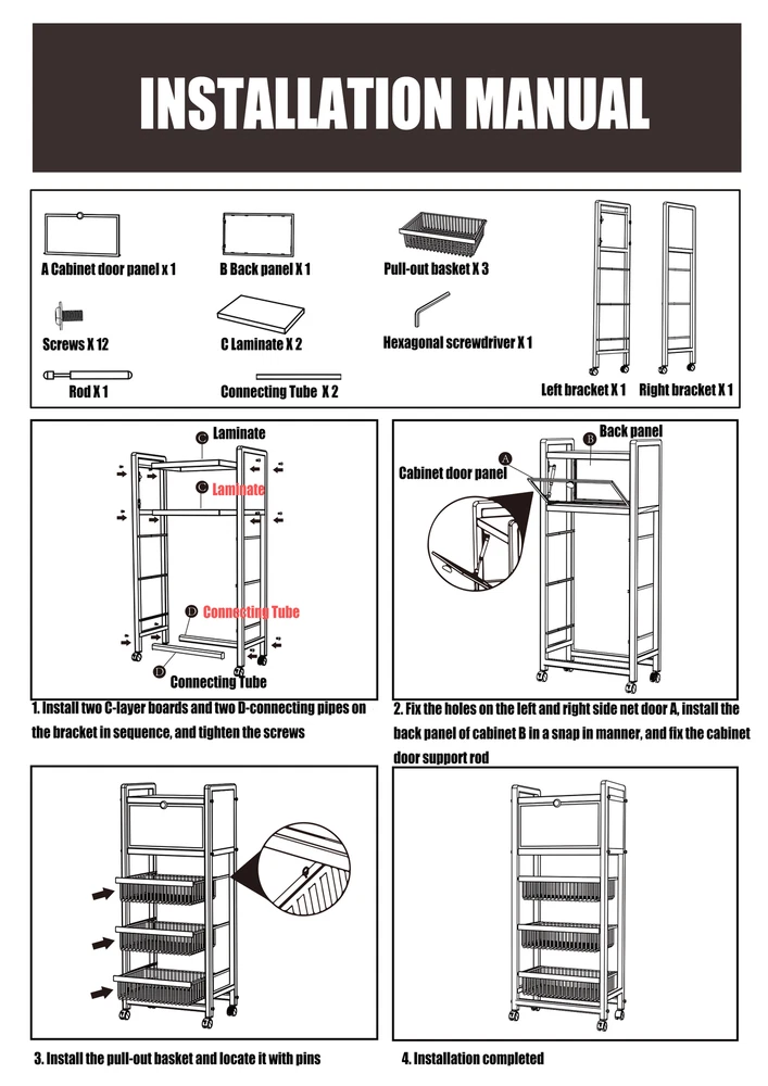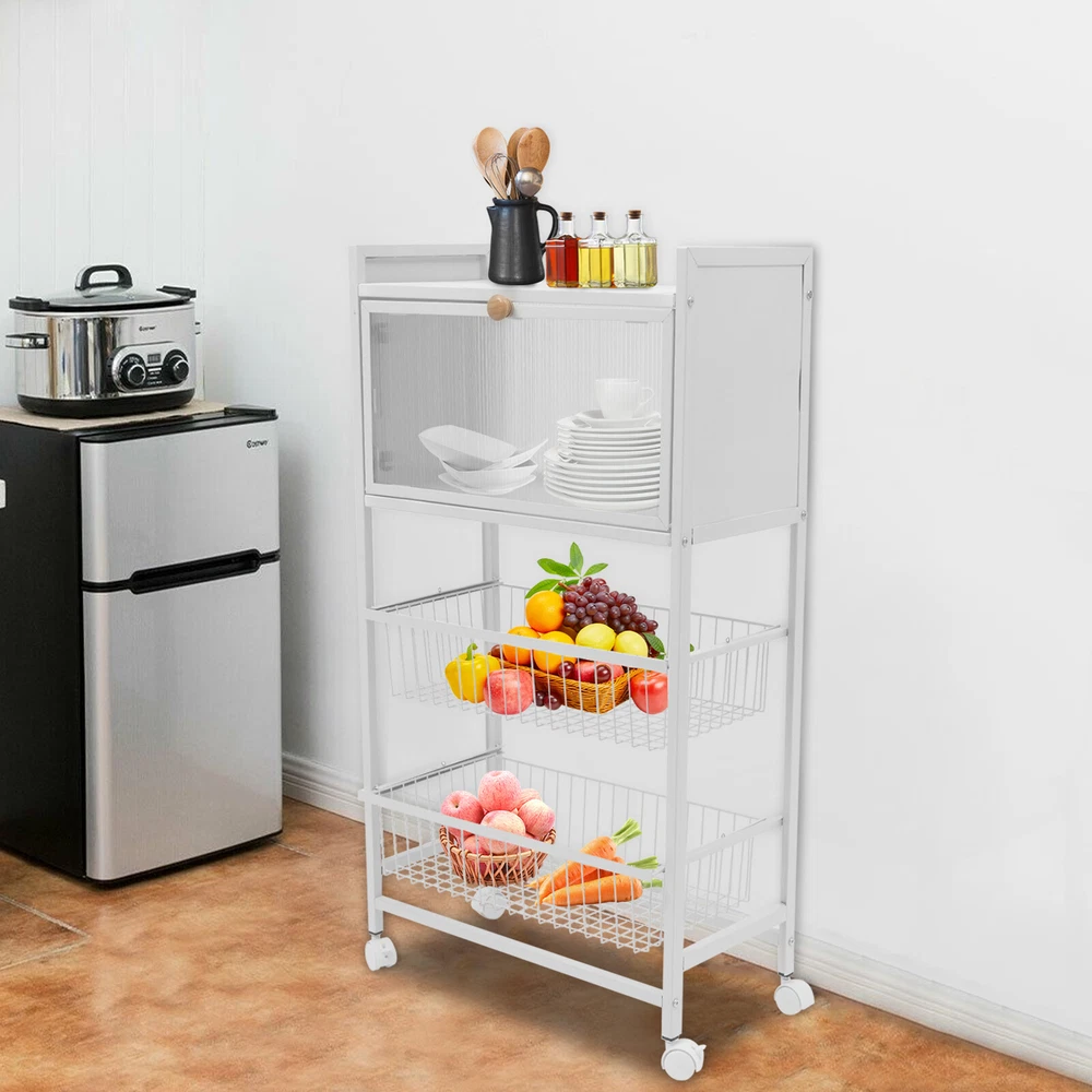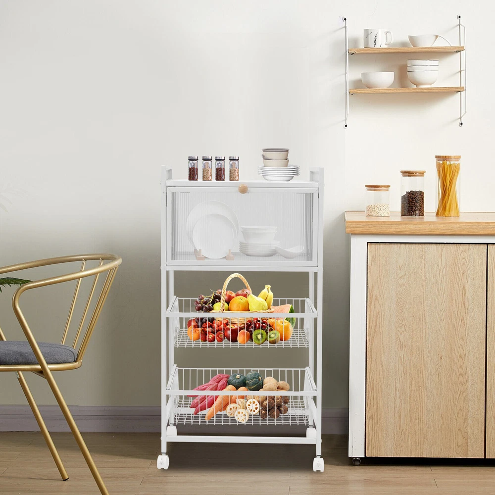 Description Multi-tier shelves can help you easily enhance the storage space in your kitchen, living room, and other places. A high-quality four-tier carbon steel storage rack with a cabinet door is hard, strong, and durable. You can rotate it 360° for more convenient use and cleaning. The multi-tier design allows you to categorize items and keep a tidy space. WELCOME Description Multi-tier Shelves Can Help You Easily Enhance the Storage Space in Your Kitchen, Living Room, and Other Places. a High-quality Four-tier Carbon Steel Storage Rack with a Cabinet Door Is Hard, Strong, and Durable. You Can Rotate It 360° for More Convenient Use and Cleaning. the Multi-tier Design Allows You to Categorize Items and Keep a Tidy Space. Key Features Sturdy and Durable: High-quality Carbon Steel Material and Paint Baking Process Make It Strong and Wear-resistant , Not Easy to Rust and Deform, Which Can Provide You with Stable Performance for a Long Time. Large Storage Space: a Large Size of 21.6*10.8*38inch with Four Shelves Provides You with Enough Sorted Space for Fruits and Vegetables and Other Items. High Load-bearing Capacity: the Rectangular Frame and High-quality Materials Allow Each Layer of the Basket to Bear up to 33 Pounds. You Can Put All Kinds of Items with Confidence. Thoughtful Design: the Drawer Design Allows Each Basket to Pull out Smoothly, Resulting in Easy Storage and Access to Items. the Higher Cut-out Basket Does Not Allow Items to Fall out and Facilitates Ventilation. the Sealed Translucent Door Not Only Protects Items from Mosquitoes and Insects, but Also Lets You See What's Inside at a Glance. Freely Movable: It Comes with Four Universal Plastic Wheels (2 with Brakes) , Allowing You to Move and Secure It from the Kitchen to the Living Room or Elsewhere As You Wish. Easy to Assemble: the Simple Construction and Complete Set of Mounting Parts Enable You to Complete the Installation Quickly and Accurately. Beautiful Appearance: the Baking Paint Process Makes It Full of Color. the Overall Appearance of Classic White Can Add Elegance to Your Kitchen, Living Room, Etc. Strict Package: the Clear Plastic Bag Can Prevent Dust, and the Foam Can Protect the Product from Being Bumped During Transport. Details Carbon Crystal Air Support: It Can Play a Role in Supporting the Cabinet Door Not to Fall, but Also Allows You to Open and Close the Cabinet Door Smoothly and Noiselessly . Card Nail: Each Tier of Shelving Baskets Comes with a Carabiner Peg That Secures the Baskets in Place, Thus Preventing Pull-offs, Mis-pulls, and Allowing for Safer Use. Guardrail: the 1.97 Inches Guardrail at the Top Prevents Items from Falling and Provides Peace of Mind When Placing Items. Handle: the Rounded Woodgrain Handles Are Thick and Durable, Making It Easier to Pull the Cabinet Doors Without Hurting Your Hands. Elevated Cabinet Base: the Elevated Base (2.76inch) Makes It Ventilated, Moisture-resistant , and Easy to Clean. Application It Is Suitable for the Kitchen, Living Room, and Other Places Used to Place Vegetables, Fruits, Small Rice Cookers, Toasters, Spices, Storage Jars, Snacks, and so on. It's Great As Your Sideboard, Cabinet, Microwave Rack, Coffee bar Cabinet, Baker's Rack, Spice Rack, Organizer, and Office Storage Rack to Support Your Various Supplies. Specification Color: White Style: Modern Martial: Carbon Steel, Pc, Plastic Shape: Rectangular Top Guardrail Height: 5cm/1.97in Load Capacity of Single Tier: 15kg/33.07lbs Mounting Type: Floor Mount Shelf Type: Tiered Shelf Number of Tiers: 4 Process: Baking Varnish Assembly Required: Yes Product Size: 55*27.5*96.5cm/21.6*10.8*38inch F irst Tier Height: 26cm/10.2in Second & Third Tier Height: 26.5cm/10.4in Bottom Height: 7cm/2.76inch Package Included 1*4-Tier Storage Rack 4* Universal Wheels(2 with Brakes) All Accessories for Assembly Notes Please Clean with a Damp Cloth and Dry with a Dry Cloth When Cleaning. Please Regularly Check Whether All Assembly Accessories Are Tightened, and If Necessary, Retighten Them. Please Allow the Slight Color Difference Caused by the Shooting Light and the 1-3cm Error Due to Manual Measurement, and Make Sure You Do Not Mind Before Ordering. Payment Delivery details Terms of sales About us Contact us Payment We accept ebay payment 。 Fees such as import duties, taxes are not included in the item price or shipping costs. These charges are the buyer's responsibility. Delivery details Shipping: 2-9 working days to: USA Terms of sales We maintain high standards of excellence and strive for hundred percent customer satisfaction. Feedback is very important to us. We hope that you contact us immediately before you give neutral or negative feedback, so that we can address your concerns. It is impossible to address issues if we do not know about them! About us Your satis faction is our ultimate goal. We work hard to earn your trust and future business. Our certified technicians have tested each item before shipping. The unit comes with 1 year limited warranty on all manufacturing defects. a) If you receive a defective item, you may return it or ask for a discount. Please contact us within 14 days after you receive the package. b) What you returned must be intact and in its original packaging as re? u. Customer is responsible for shipping costs of the returned item. c) We will cover the cost of shipping back t with the shipping rate indicated in the registration page. We will send you a new unit or refund the full payment you paid. Thank you. Contact us Business Hour Business Hour: Monday To Friday: 8:30 AM to 5:00 PM (Beijing China time) Due to time zones, our reply to your questions may not be immediately. But within above working time, we will reply your email within 24 hours. If it's non-workdays, please kindly be patient and wait till Monday. Please contact us with ebay message. Please feel free to contact us if you have any questions. Monday To Friday: 8:30 AM to 5:00 PM (Beijing China time) Due to time zones, our