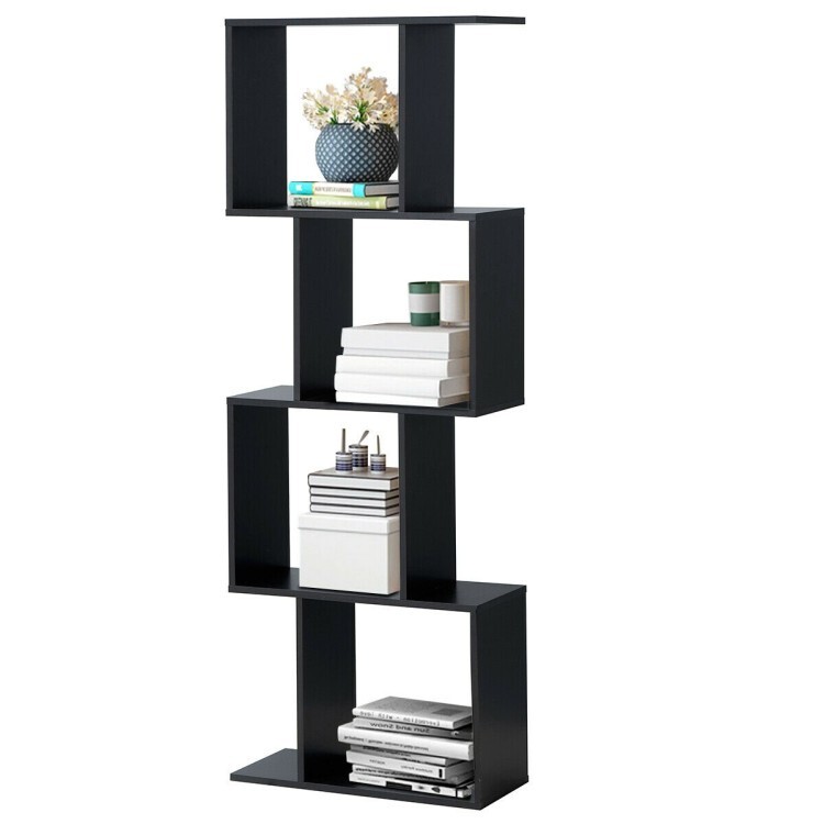 4 Tier Wooden S-Shaped Bookcase Living Room Office Storage Organizer Bookshelves ● Ample Storage Space for Space-Saving: 4-tier shelves provide spacious and classified space for displaying normal stuff like books, potted plants and significant collections. Adopting the vertical design, this freestanding bookshelf will optimize the space to the maximum capacity of items of its size. ● Sturdy and Durable Craftsmanship: Crafted from the P2 standard particle board and MDF material, this display rack is durable and stable enough for a long lifespan and strong weight capacity. The surface is waterproof and scratch-resistant and reliable partitions create a sense of security for heavy items. ● Stable Design for Safety: Equipped with tilting prevention device, this 4-tier bookcase can be tightly fixed on the wall and won't wobble because of the huge bearing, making it more stable and safer than other units of its kind that is merely against the wall. Our bookshelf is perfect for families with little kids. ● Modern and Stylish Bookshelf: Designed with concise and stylish concept, our black bookshelf adopts an S-shaped design to present an aesthetic feeling. The bookcase matches well with different styles of decoration in your house and it can be used as a storage shelf, flower stand or display rack in the bedroom, living room or even in cafes. ● Easy Installation and Clean: Complete accessories are included and specific assembly steps are shown in graphic and text form which is easily understood. You won’t get stuck with the hard assembly jobs for the bookcase. And with its smooth surface, this excellent bookshelf is easy to clean and won’t be an encumbrance in your daily cleaning-up. Color: Black Material: Particle board, MDF board Overall dimension of 4-tier one: 23.5" x 10.5" x 65.5" (L x W x H) Net weight of 4-tier one: 37 lbs Weight capacity: 22 lbs