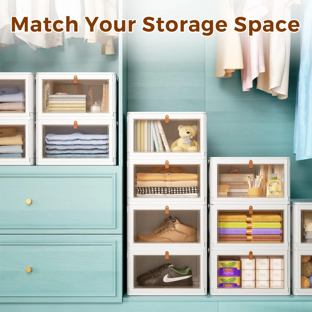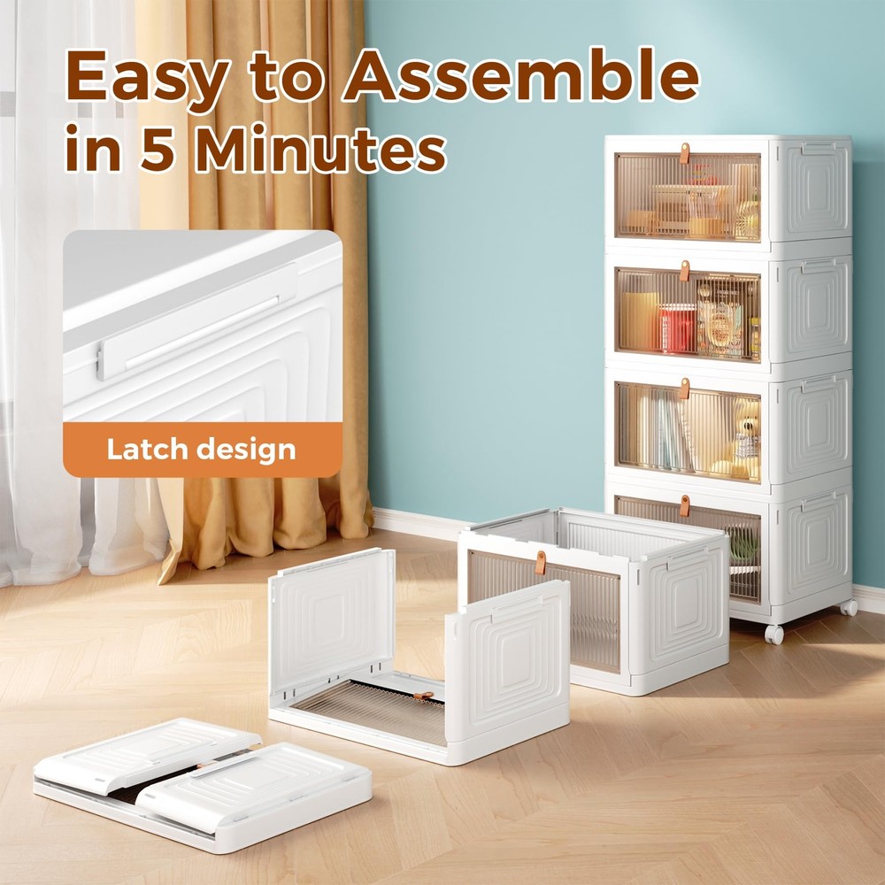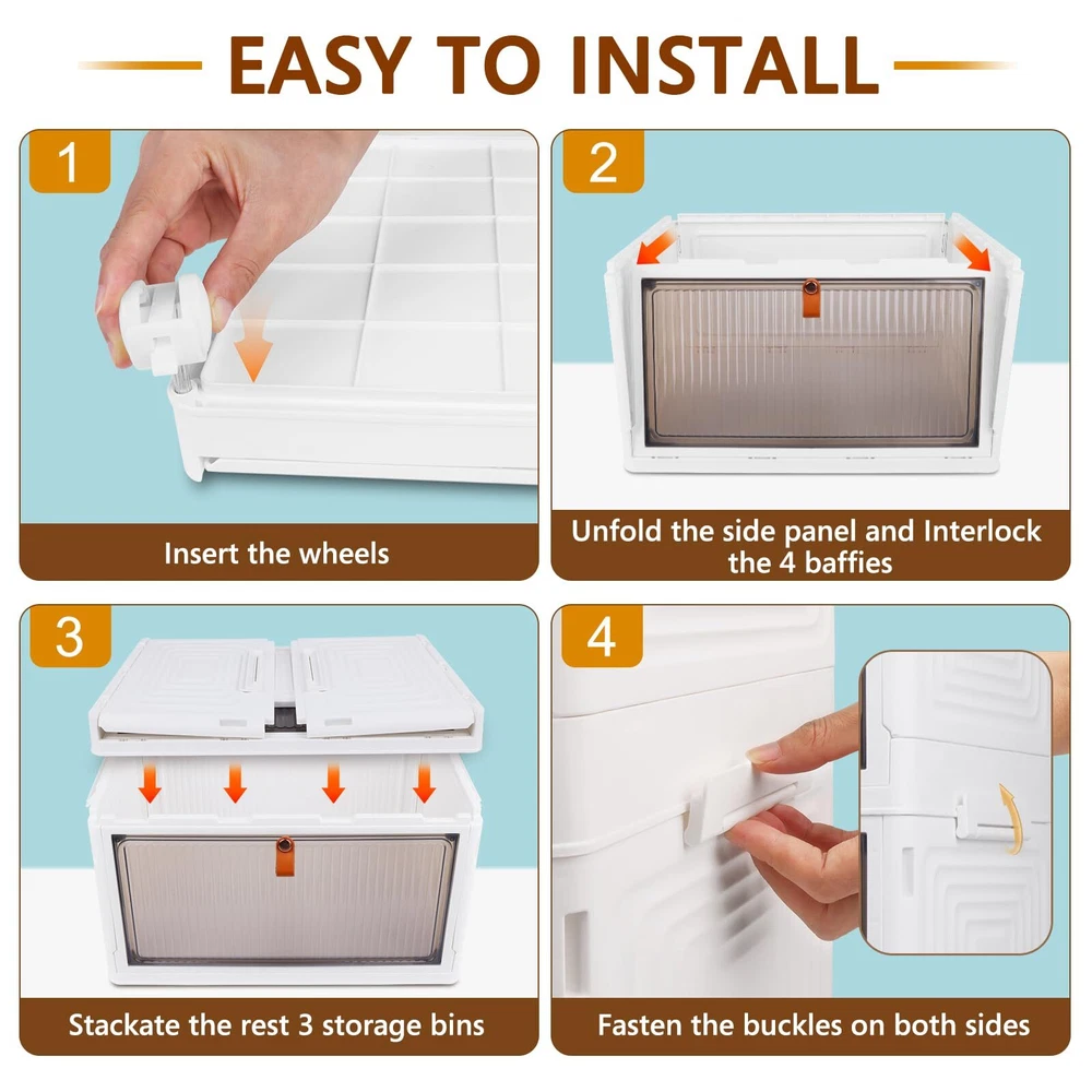Large Capacity & Upgraded Material - The storage bins measure 14.76 x 11 x 8.27 inches(23 QT capacity) on each floor, and the 4-layer stacked as a whole measures 15.35 x 11 x 32.68 in (height included wheels), with a total capacity of 92 QT. Our storage containers with lids are made of high-quality PP materials for long service life. Easy to Use and Foldable - The plastic storage bins are easy to assemble without tools, you can stack storage boxes and assemble them into a bedding organization, clothes organizer or shoe storage cabinet etc. When not in use, the storage boxes can be folded to take up little space in your home or cars. Stackable & Removable - The storage organizer bins are stackable and mobility. Each layer has matching grooves and clasps on both sides of the top to securely lock the clear storage bins. There are four rotating wheels at the bottom, which makes it easy for you to move. In addition, 2 wheels of the storage shelves have clasps that hold the locker in place to prevent it from moving. Multifunctional Storage Bins - These drawer organizer can be used for both indoor and outdoor storage. Such as closet organizers and storage, laundry room organization, bathroom organizers and storage, kitchen organizers and storage, dog food storage container, dresser for bedroom, book shelf, car organizer, etc. Clearly Doors with Magnetic - The front door of the storage drawers has a built-in magnetic buckle to ensure that the door does not open on its own. The front cover of each plastic drawer storage is translucent, you can clearly see the items stored inside, and it is easy to identify the items stored inside, which is a good assistant to our family.