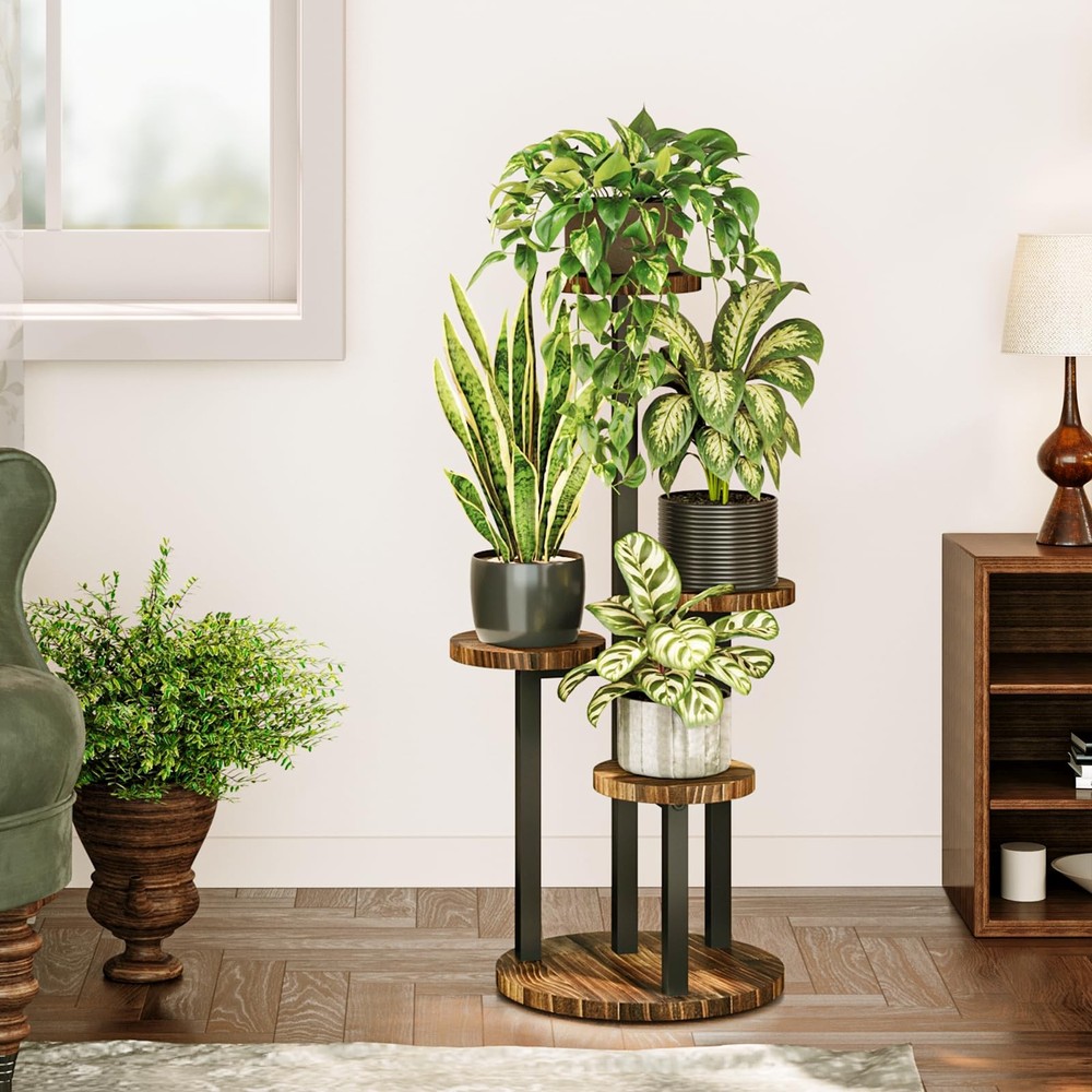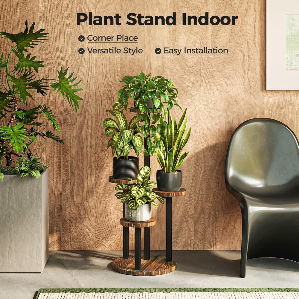 is a young brand, full of energy. Our mission is to change lives with green plants. This product adopts a layered design for tiered plant stand indoor, which not only saves space for more green plants, but also ensures that your plants get sufficient sunlight.Metal plant stand & wood plant stand.We offer 3 tier,5 tier plant shelf flower display stand.We provide a variety of layer options to meet everyone's different needs for quantity. Stylish Versatility: Crafted with industrial-chic iron pipes and warm wooden trays, this space-saving corner shelf effortlessly complements modern farmhouse, bohemian, or minimalist décors. Its compact 31.5" vertical design maximizes floor space while the widened base tray (12.9"x12.9") ensures sturdy grounding for displaying potted herbs, decorative greenery. Flexible Decor Solution: Transform any sunlit nook into a botanical showcase - perfect for brightening sunrooms, enhancing coffee bar corners, or adding organic texture to entryways. Water-resistant wood trays adapt to humid environments like covered patios or laundry rooms (Note: Not recommended for direct outdoor exposure). Weight-Optimized Design: Reinforced steel joints support up to 20 lbs per shelf . Layer petite 7.1"x7.1" trays with succulents . Non-slip rubber feet protect hardwood floors. Sunlit Display Central: Position this tiered organizer near east-facing windows to help foliage soak up morning rays. The open-frame construction allows 360° light circulation, ideal for sun-loving ferns, pothos, or air plants needing indirect brightness. Quick-Tool Assembly: Engineered with pre-drilled components and color-coded instructions for tool-free setup. Most customers complete assembly during a coffee break (under 10 minutes) using only the included hex key.
