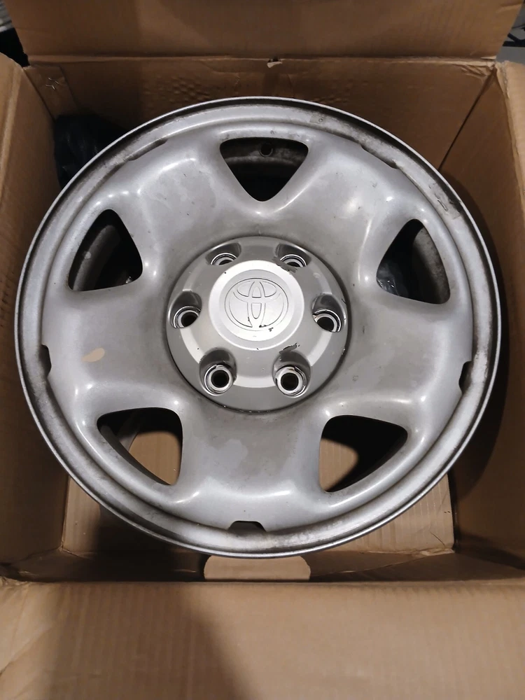 Elevate your vehicle's aesthetics and performance with this set of four authentic Toyota Tacoma steel wheels, complete with lug caps. These 16-inch rims feature a classic 5-spoke design, a durable one-piece cast construction, and a sleek silver painted finish that complements any exterior color. The wheels have a rim diameter of 16 inches and a width of 7 inches, ensuring a perfect fit for your Tacoma or any compatible model.With a bolt pattern of 6x139.7mm (6 x 5.5 inches) and a hub bore of 106 mm, these rims are designed for a seamless integration with your vehicle. The set includes wheel center caps to keep your wheels looking sharp and protected. Note that these wheels are factory original OEM parts, not replicas, and they come without a manufacturer warranty.