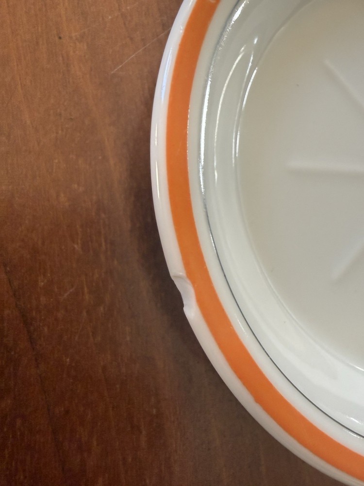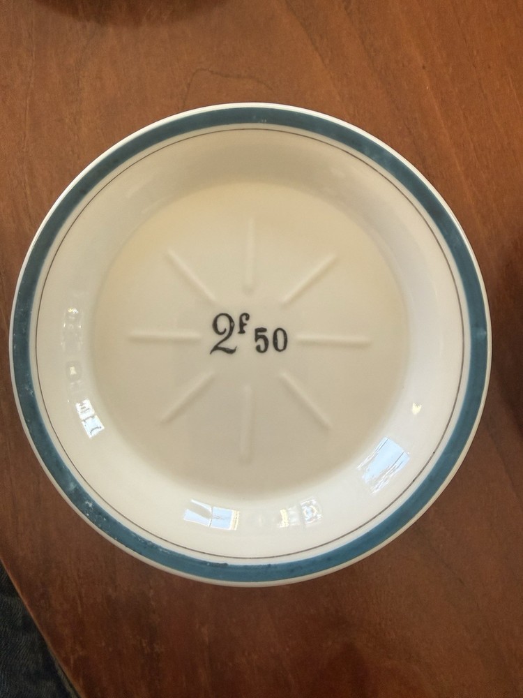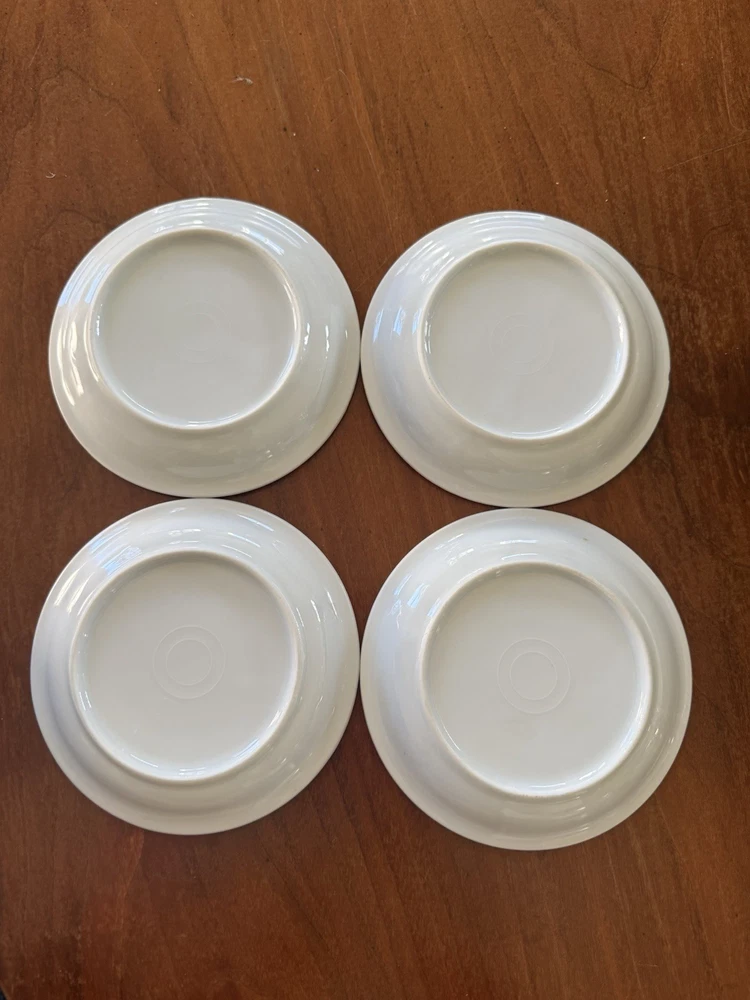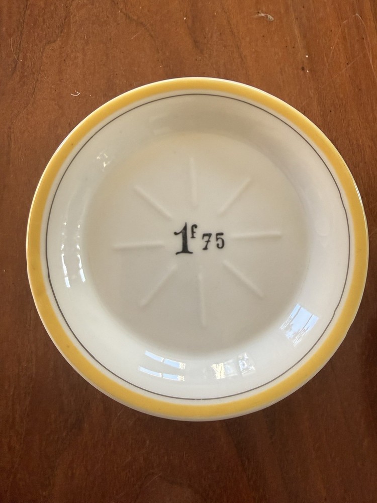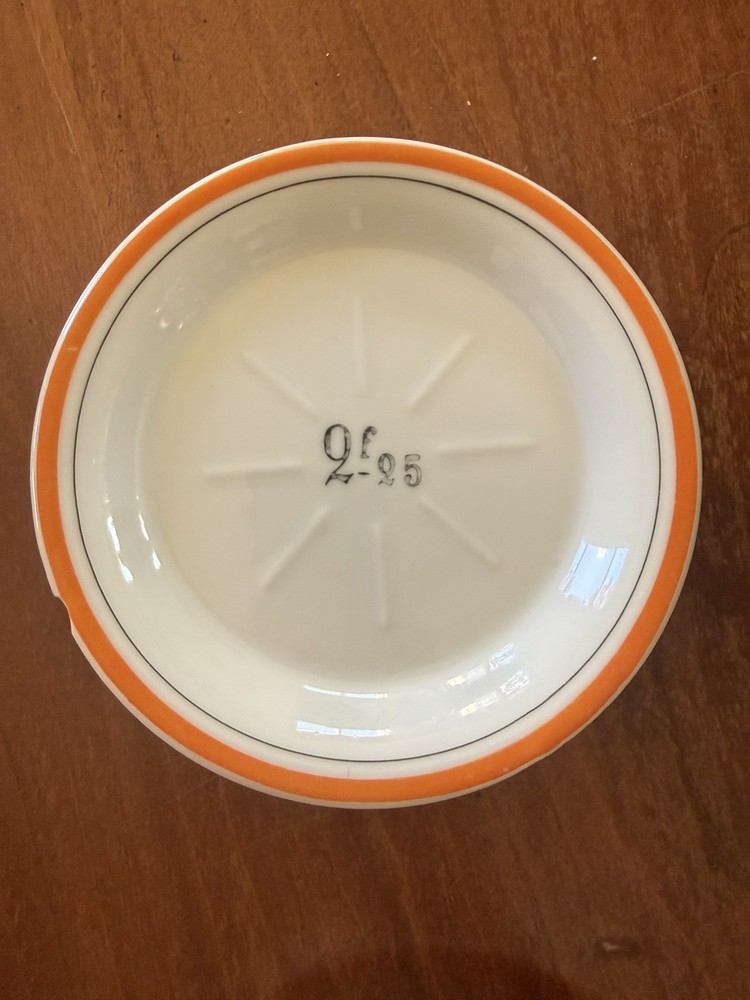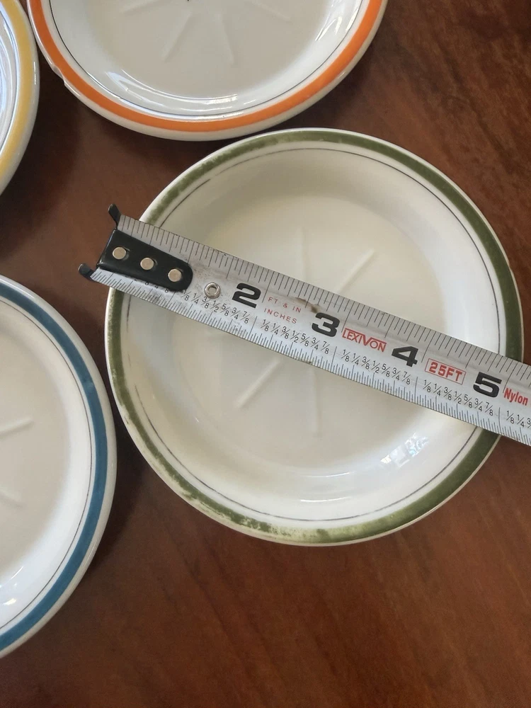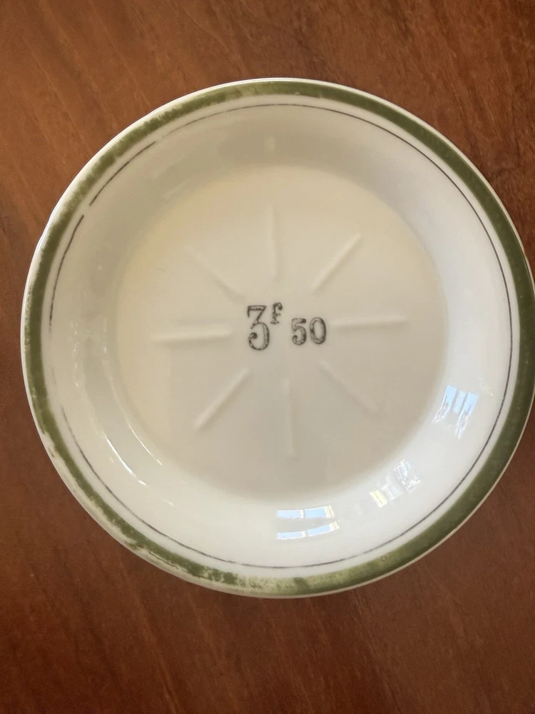 4 Vintage French Bistro Absinthe Saucer Hotel Tip 5” Plates Set Coasters Bar Green saucer shows wear as to be expected from vintage items. Orange saucer has a small chip on it, I tried to show in pictures. Please ask if you have further questions.
