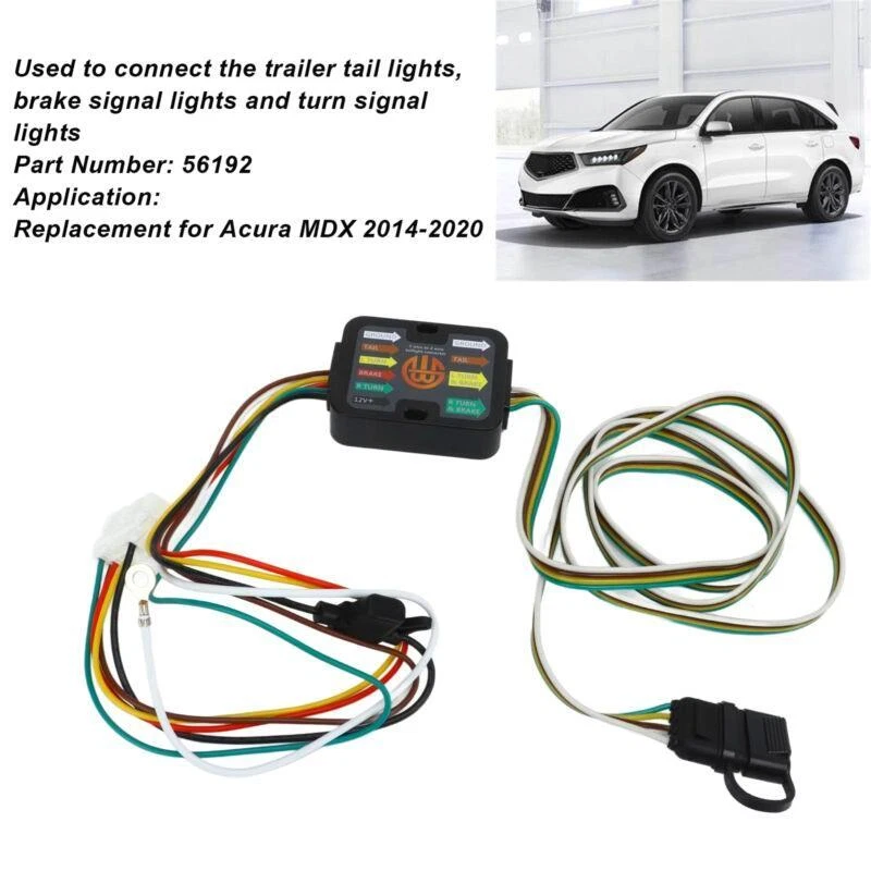 Feature: 1. Fitment: Trailer wiring harness is replacement for MDX 2014‑2020, which is made according to the prototype model. 2. Part Number: Trailer wiring harness kit replace part number is 56192. Please check the part numbers whether it suits your vehicle before purchasing. 3. Application: 4 pin trailer wire harness can be used to connect the trailer tail lights, brake signal lights and turn signal lights. 4. Excellent Performance: Fast, easy and secure connections, professional manufacturing and stable performance, flexible and sensitive. 5. Simple Installation: The installation is simple, direct replacement, no modification is required, convenient for using, save your efforts. Specification: Item Type: Trailer Wiring Harness Material: ABS and wiring harness Part Number: 56192 Product Description: If your vehicle is not equipped with wiring for towing trailers, this wiring harness is the ideal solution. The custom wiring harness (also known as a T connector) is a simple plug and play electrical device that plugs into the vehicle's electrical system and provides a standard universal trailer wiring connection. This is accomplished by plugging into the taillight assembly using two or more vehicle specific OEM compatible connectors, eliminating the need for cutting, splicing and soldering during installation. The custom wiring harnesses are vehicle specific and while they do not apply to all vehicles, they do provide one of the fastest, easiest and safest methods for towing vehicles. This special plug in harness provides a 4 way flat connector socket and is designed to customize the harness to fit certain years replacement for MDX (factory towing kit required; to verify your vehicle's compatibility, see application information). It comes with all the necessary wiring components to create a trailer wiring connection, as well as a dust cover to keep the connector clean when not in use. You have a picture in your mind of your next destination, maybe a boat landing at your favorite fishing spot, a campground overlooking one of nature's masterpieces, or maybe the next big construction site. However, turning that dream into reality takes more than just daydreaming. It requires strong connections and the right amount of power. The wiring uses the industry's most advanced technology for easy installation and provides a electrical connection for your tow hookup setup. Application: Replacement for MDX 2014‑2020 Package List: 1 x Trailer Wiring Harness 5 x Strap 1 x Screw 3 x Accessories Note: 1.Please double check the part number of your item, matching information is for reference only. 2.If you are unsure of the item, please contact us before buying to avoid unnecessary return, thanks!