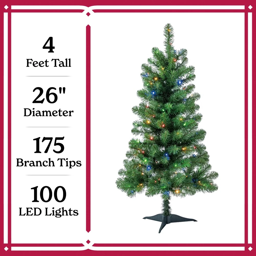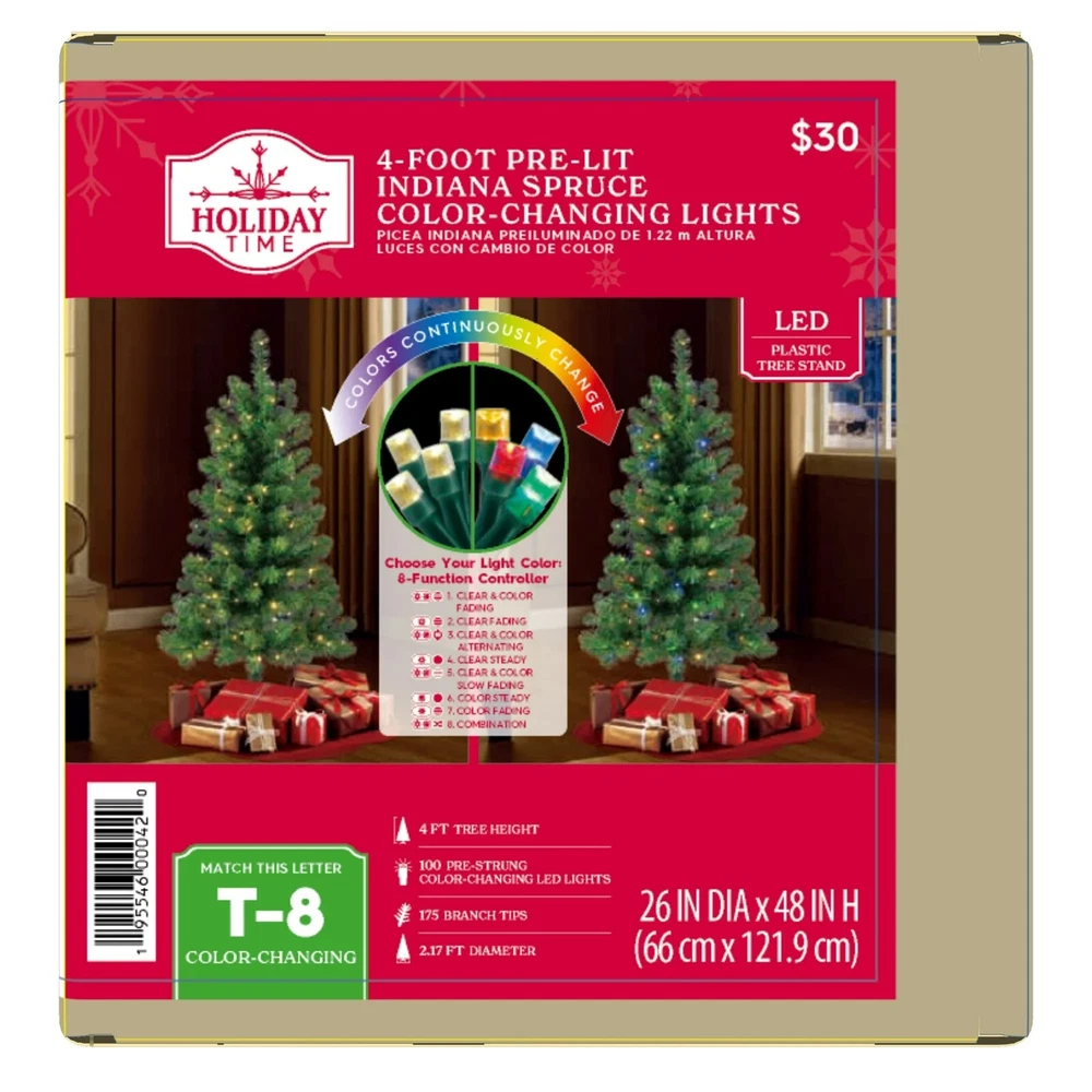 4 ft Pre-Lit Indiana Spruce Artificial Christmas Tree with Color-Changing LED Lights, by Holiday Time Warehouse in USA and Free Shipping in USA Product details The Holiday Time 4ft Pre-lit Indiana Spruce artificial Christmas tree is the perfect choice to deck your home with festive splendor. Featuring 100 color-changing LED lights, pre-strung for your convenience, your space will be brightened heartily with Christmas cheer. These LED lights have 8 different light effects for an amazing display. Set up this artificial spruce easily with pre-attached hinged branches by sliding the tree sections together. Once the tree is assembled, your treasured ornaments will have a suitable showcase as you hang them on the lush, green 175 branch tips. Verdant and full, this artificial spruce tree also has a sturdy top branch where the tree topper of your choice will sit securely and look beautiful to onlookers. To help your Christmas tree stand firmly all season, a plastic stand is included, so there is no danger of the tree toppling over. Rustic and lifelike, the Holiday Time 4ft Pre-lit Indiana Spruce artificial Christmas tree adds wonder to your festivities. Holiday Time 4' Pre-Lit Indiana Spruce Artificial Christmas Tree, Color-Changing LED Lights 175 branch tips 100 pre-strung color-changing LED lights Tree stand included Easy setup - slide the tree sections together for quick display Pre-attached hinged branches for easy setup 8 function light controller Extra sturdy top branch for your tree topper For indoor use only Flame-retardant Color: Green 2.17ft diameter Product Dimensions: 26" W x 26" D x 4' H Model #: TG40FH321D01 Specifications Brand Holiday Time Christmas Tree Type Artificial Christmas Trees Christmas Tree Shape Triangular Prelit Y Number of Lights 1 Light Bulb Type LED Light Bulb Color Clear Light Functions Color Changing Theme Christmas Material PVC;IRON WIRE; COPPER; PP;GPPS Color Green Recommended Location Indoor Power Type Corded Electric Cord Length 1.9 m Assembled Product Weight 3.86 lb Manufacturer Part Number TG40FH321D01 Assembled Product Dimensions (L x W x H) 30.00 x 30.00 x 7.50 Inches Warranty Warranty information 2-YEAR LI Thank you for choosing my store and hope all the best things will come to you!