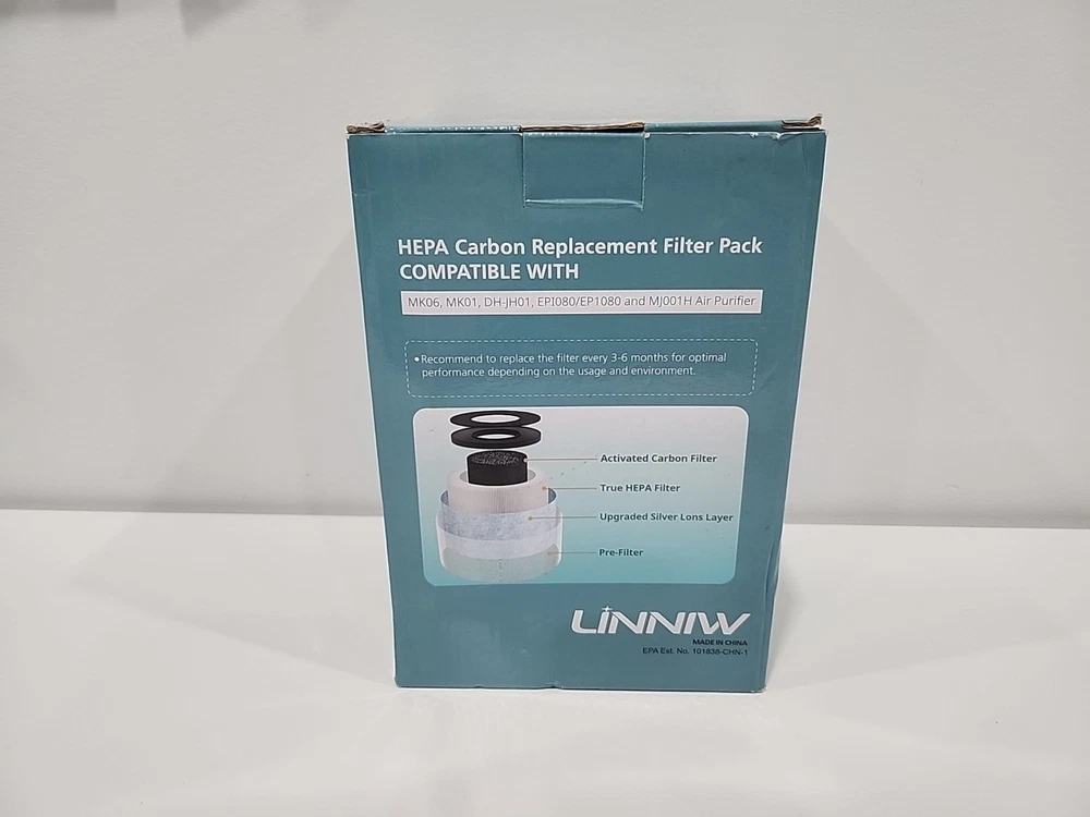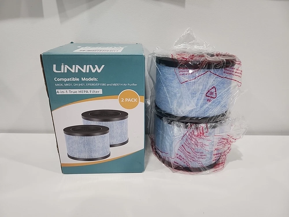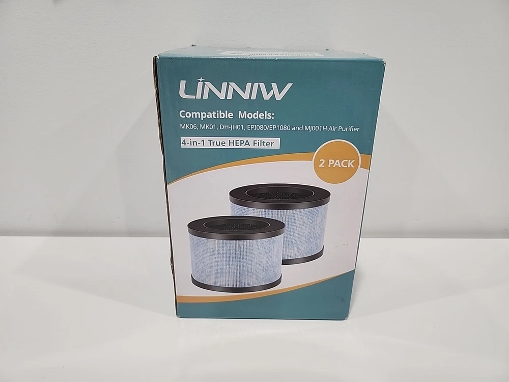The 4 in 1 Linniw True HEPA Replacement Filter 2 pack is designed for use in air purifiers such as MK06, MK01, and MJ001H models. With a filter life of 6 months, this pack contains two filters that effectively capture and remove airborne particles, providing cleaner and fresher air in your home. The True HEPA filtration technology ensures high-quality performance, making it an essential accessory for maintaining indoor air quality and promoting a healthier living environment.