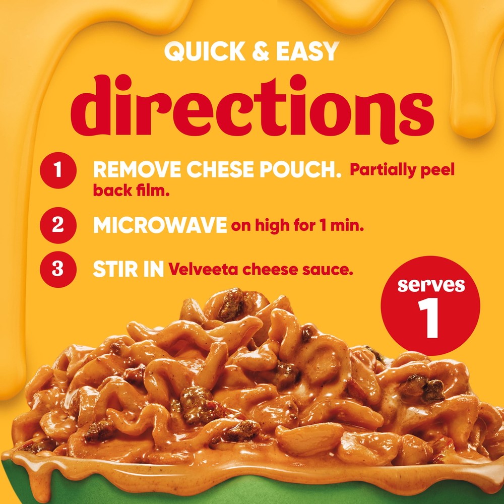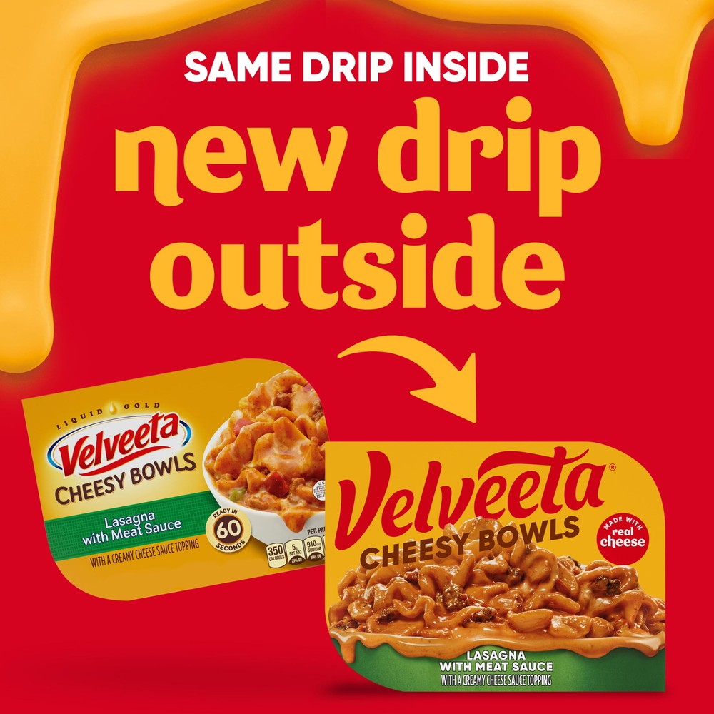 One 9 oz box of Velveeta Cheesy Bowls Lasagna with Meat Sauce Microwave MealVelveeta melts the creamiestSatisfy your cravings with unrestrained pleasure One 9 oz box of Velveeta Cheesy Bowls Lasagna with Meat Sauce Microwave Meal Velveeta melts the creamiest Satisfy your cravings with unrestrained pleasure Unapologetically go all-in for the cheesy, melty goodness you love best An outrageously delicious taste experience Velveeta Cheesy Bowls Lasagna features noodles with meat sauce in a creamy cheese sauce Our single-serving mac and cheese bowl is ready in just 60 seconds To prepare, remove cheese pouch, partially peel back film from top of tray, microwave on high for one minute and stir in cheese sauce SNAP & EBT eligible food item