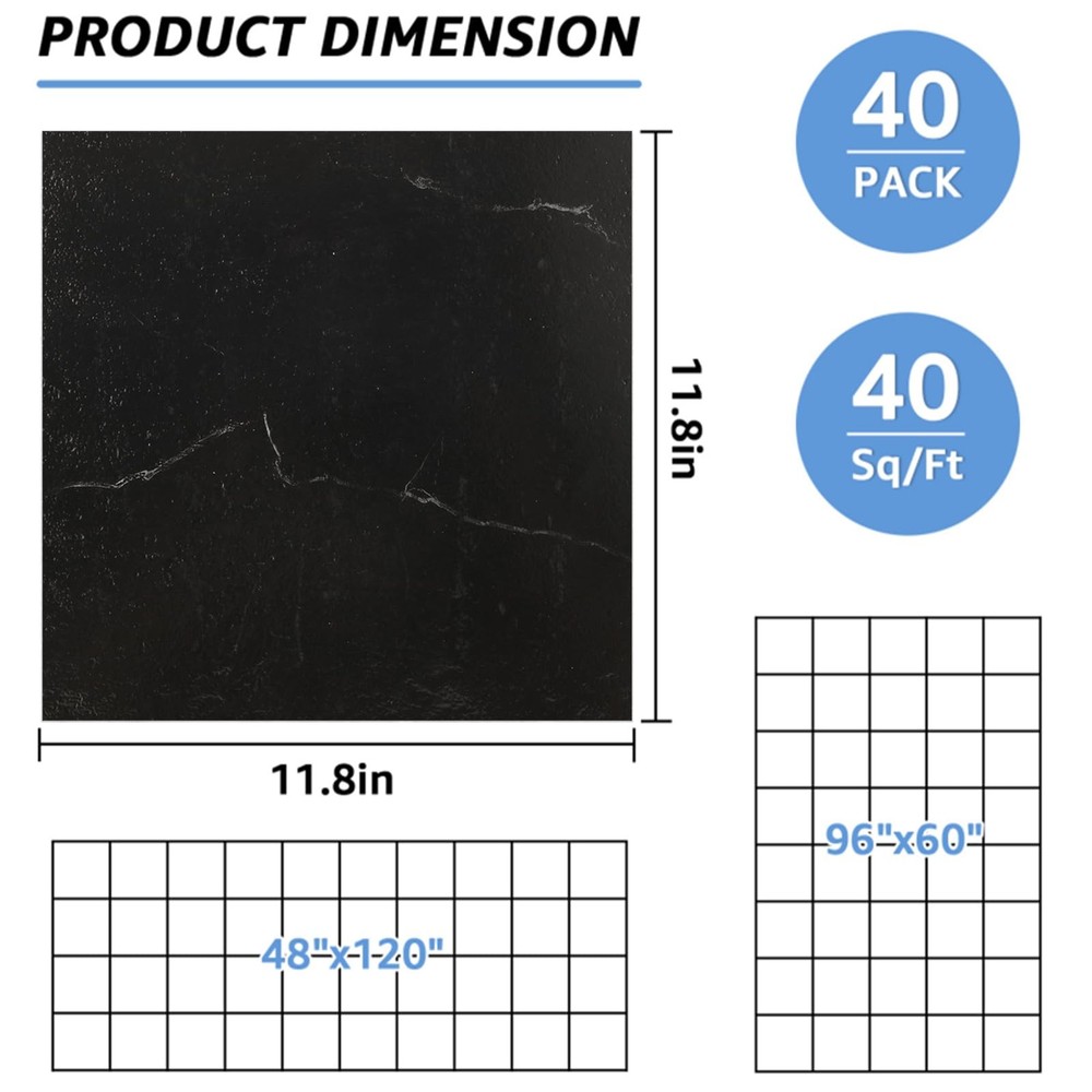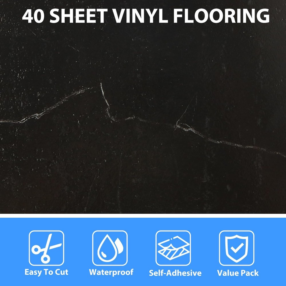 40 Pack Stick on Floor Tiles Marble Black, 12x12 Peel and Stick Vinyl Flooring, Self Adhesive Vinyl Floor Tiles Clearance, RV Laminate Vinyl Sheet Flooring, Waterproof Flooring for Bathroom, Kitchen, Basement, Office Note: Please carefully check 【Gentle Reminder】 before purchasing. Features: 1. Elevate your space with 40 pack wood grain floor tile. 2. Affordable and easy-to-install vinyl flooring solution. 3. Waterproof and fire-resistant for long-lasting protection. 4. Convenient peel and stick design for hassle-free application. 5. Versatile grain pattern for a stylish touch in various rooms. Specifications: Material: Vinyl Sizes: L*W: 11.8x11.8 Inch Thickness: 0.05in / 1.3mm Color: Black Marble Grain【1】 Package includes: 40 Pack Vinyl Flooring Sizes & Package: You will receive 40 sheet Vinyl Flooring, which measuring 11.8x11.8 inch each, with a thickness of 0.05inch / 1.3mm. Cover around 40 square feet with this value package. Gentle Reminder: 1. Please confirm again before purchasing that the size (especially thickness) can meet your needs to avoid an unpleasant shopping experience. 2. There may be slight color differences between different batches of laminate flooring. 3. Please clean the floor before use and ensure that the floor is always flat and dry. 4. Please kindly keep off the new floor for 48 hours after tile adhesive sets. Economical & Practical: 's Floor Tile series offers a budget-friendly way to decorate floors quickly and easily without hassle of using adhesives or hiring professionals. Easy to peel and stick, and the detachable design will not damage the floor's original appearance. Customize sizes and patterns as your needed with a utility knife for a fresh space. Superior Material: Made from quality vinyl material, lightweight yet durable Tile Flooring have certain fire and water resistance, protecting floors from scratches, dents and stains, ensuring long-term use. With a pressure-sensitive adhesive backing, the stickiness improves with use without leaving residue upon removal. Wide Application: Vinyl Floor Tiles are ideal alternative to expensive flooring, suitable for various settings like bathrooms, kitchens, basements, offices, laundry rooms, bedrooms, living rooms, rental properties, kids' playrooms, hallways, entryways and more.
