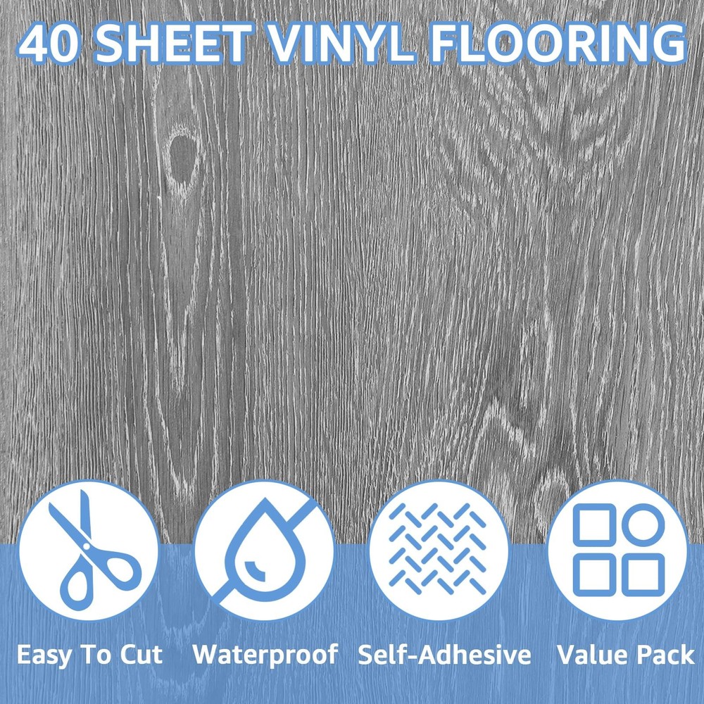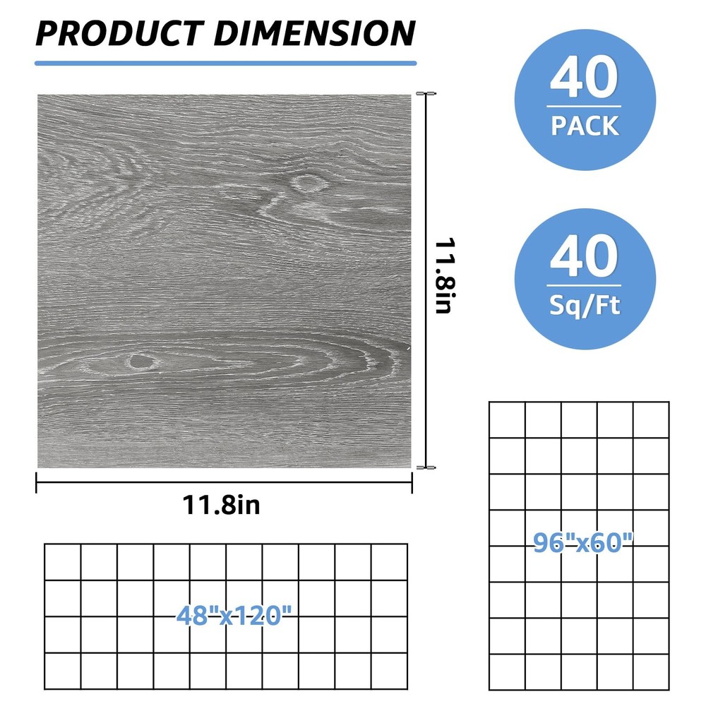 40 Pack Stick on Floor Tiles Wood Grey, 12x12 Peel and Stick Vinyl Flooring, Self Adhesive Vinyl Floor Tiles Clearance, RV Laminate Vinyl Sheet Flooring, Waterproof Flooring for Bathroom, Kitchen, Basement, Office Note: Please carefully check 【Gentle Reminder】 before purchasing. Features: 1. Elevate your space with 40 pack wood grain floor tile. 2. Affordable and easy-to-install vinyl flooring solution. 3. Waterproof and fire-resistant for long-lasting protection. 4. Convenient peel and stick design for hassle-free application. 5. Versatile grain pattern for a stylish touch in various rooms. Specifications: Material: Vinyl Sizes: L*W: 11.8x11.8 Inch Thickness: 0.05in / 1.3mm Color: Grey Wood Grain【1】 Package includes: 40 Pack Vinyl Flooring Sizes & Package: You will receive 40 sheet Vinyl Flooring, which measuring 11.8x11.8 inch each, with a thickness of 0.05inch / 1.3mm. Cover around 40 square feet with this value package. Gentle Reminder: 1. Please confirm again before purchasing that the size (especially thickness) can meet your needs to avoid an unpleasant shopping experience. 2. There may be slight color differences between different batches of laminate flooring. 3. Please clean the floor before use and ensure that the floor is always flat and dry. 4. Please kindly keep off the new floor for 48 hours after tile adhesive sets. Economical & Practical: 's Floor Tile series offers a budget-friendly way to decorate floors quickly and easily without hassle of using adhesives or hiring professionals. Easy to peel and stick, and the detachable design will not damage the floor's original appearance. Customize sizes and patterns as your needed with a utility knife for a fresh space. Superior Material: Made from quality vinyl material, lightweight yet durable Tile Flooring have certain fire and water resistance, protecting floors from scratches, dents and stains, ensuring long-term use. With a pressure-sensitive adhesive backing, the stickiness improves with use without leaving residue upon removal. Wide Application: Vinyl Floor Tiles are ideal alternative to expensive flooring, suitable for various settings like bathrooms, kitchens, basements, offices, laundry rooms, bedrooms, living rooms, rental properties, kids' playrooms, hallways, entryways and more.