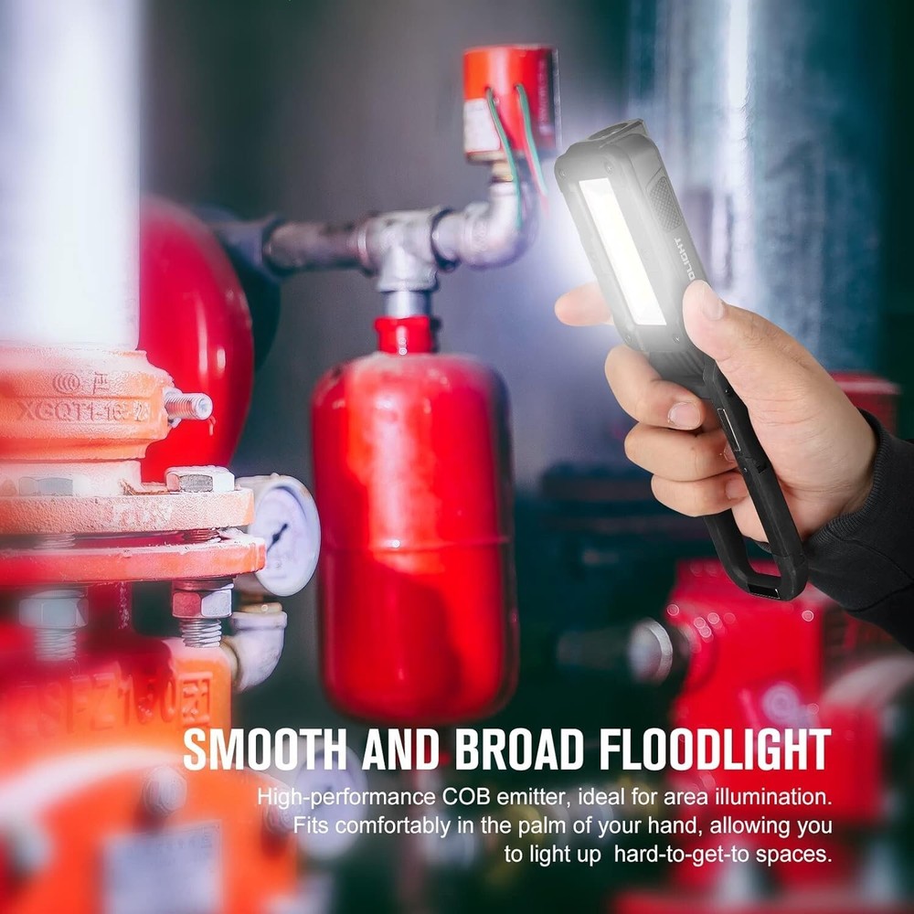 OLIGHT Swivel 400 Lumens LED Compact Rechargeable Magnetic COB Work Light, Adjustable Stand with Magnetic Base and Hanging Hook, 90 Hours Lasting Power, Job Site Lighting for Camping (Black) [Super Bright COB Light] Max 400 Lumens COB LED magnetic work light with built-in battery [Heavy-grip Magnetic Base] Three strong magnets inside the stand can firmly attach onto any iron surfaces [Rechargeable and Max Runtime] Built-in rechargeable battery, can be fully charged in 3.7 hours via a Type-C port, and ensuring a max runtime of 90 hours [Reveal itself in the Darkness] Glow-in-the-dark Strip around the panel, allows you to quickly locate the swivel in the dark [Hard and Waterproof] Sturdy ABS body with IPX4 waterproof, withstands corrosion, heat, impact and water splash easily