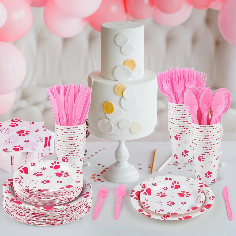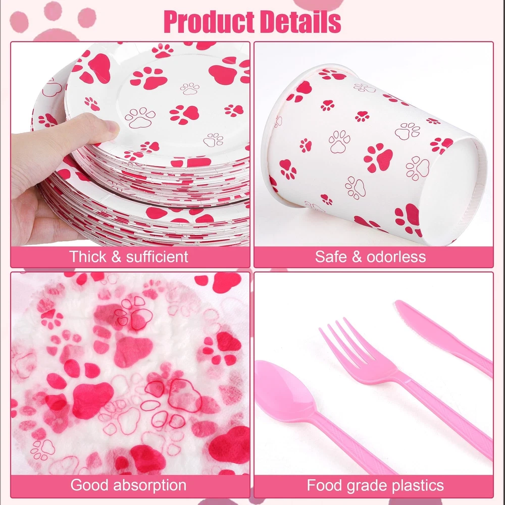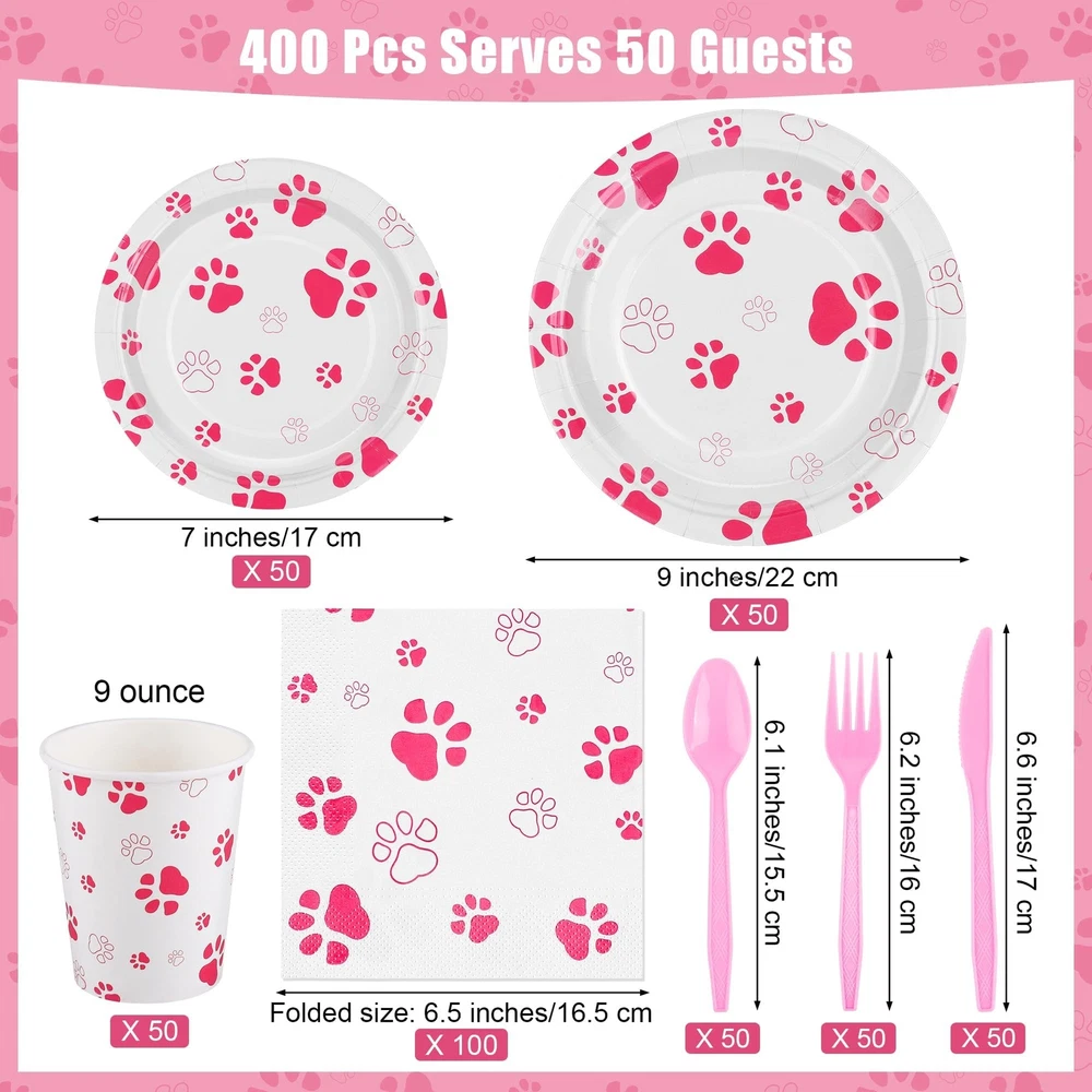 Specifications: Material: paper, plastic Size: as shown in the pictures Color: as shown in the pictures Quantity: 400 Package includes: 50 x 7-inch paper plates 50 x 9-inch paper plates 50 x 9-ounce paper cups 50 x forks 50 x knives 50 x spoons 100 x napkins Sufficient package: our set contains a total of 400 pink paw party supplies, including 50 pieces of 7-inch/17 cm plates, 50 pieces of 9-inch/22 cm plates, 100 pieces of napkins, 50 pieces of 9-ounce paper cups, 50 sets of knives, forks and spoons, sufficient to meet your party use and Premium material: our puppy paw print theme tableware is made of quality thick paper, safe and sturdy, not easy to break or leak; the paper napkins are soft and absorbent, the disposable forks, knives and spoons are made of reliable plastic; our smooth and waterproof utensils can serve you for a long time Unique design: our dog party decorations are well designed with pink dog paw elements, delicate and eye-catching; the vivid design and vibrant colors will create a nice visual enjoyment and add more energy to your puppy party Wide applications: the pink paw party supplies are great choices for various parties, such as birthday parties, pet themed parties, dog showers, picnics, home parties, camping, barbecues and more Practical gift: the plates, cups, napkins and cutlery are disposable, you can throw the puppy party supplies away directly after use without worrying about the mess or spending a lot of time on cleaning, so you can give the paw patrol plates as a practical gift to your friends or family