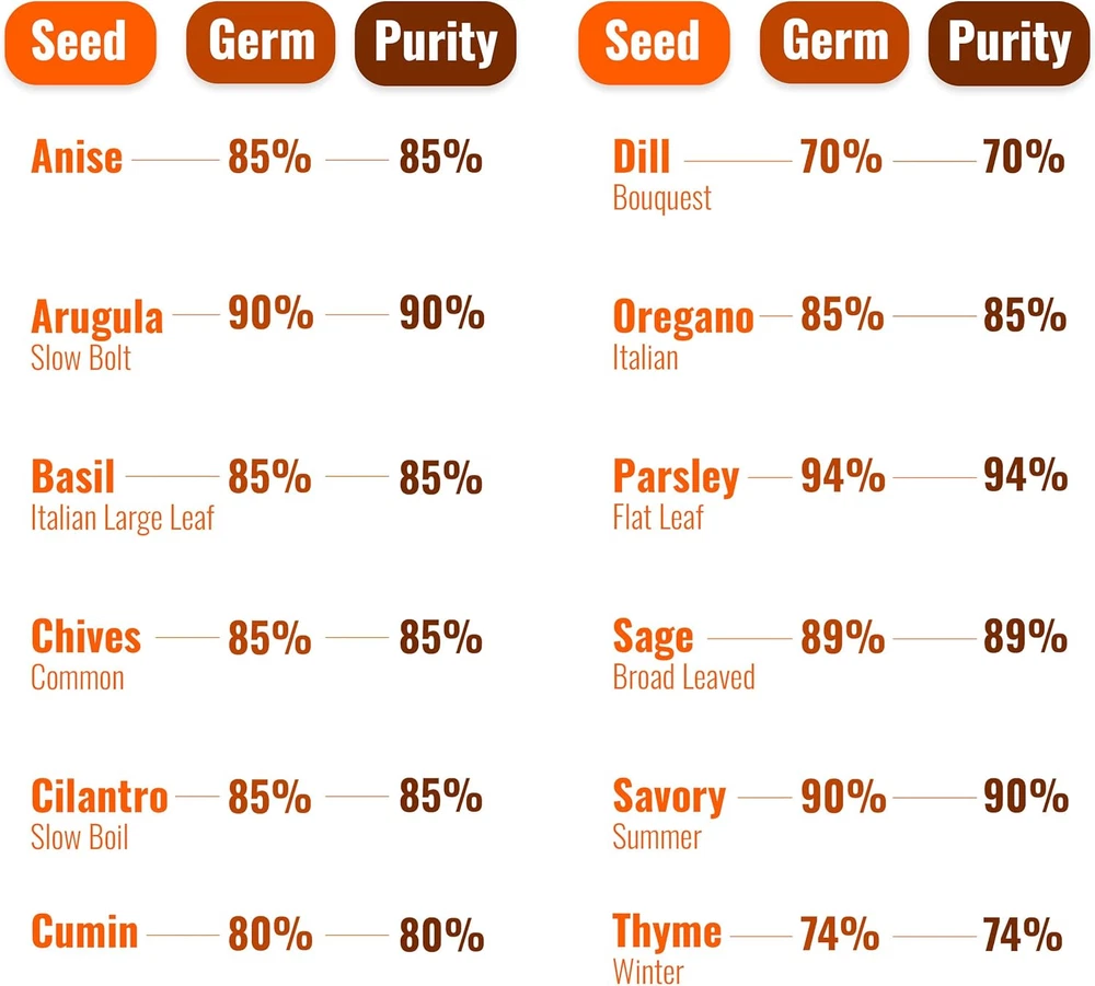 Heirloom, Non-Hybrid Seeds: Includes seeds for herbs and spices such as basil, oregano, cilantro, and more; non-GMO and chemically untreated, ensuring natural growth without any harmful additives For Survival and Emergency: These herb seeds are essential planting seeds for survival situations like hurricanes, floods, and droughts; perfect for prepper kits, bug out bags, and gardening supplies Multiple Herbs: Plant and harvest dill, parsley, cumin, thyme, oregano seeds with high germination rates; each variety pack includes up to 500 seeds, providing a reliable source of fresh herbs for you Step-by-Step Growing Guide: Our 14-page guide offers detailed instructions for growing and saving seeds, ensuring you can cultivate your bulk herbs effectively, from planting to harvesting Long-Term Storage: Packaged in airtight, moisture-proof resealable bags, our seeds maintain high germination rates and 99% purity, providing long-term food and gardening supplies for the future EACH PACK CONTAINS THE FOLLOWING 12 SEED PACKETS: 1. Basil Italian ≈ 200 mg 2. Anise ≈ 250 mg 3. Sage Broad leaved ≈ 200mg 4. Chives Common ≈ 200 mg 5. Cilantro Slow Bolt ≈ 500 mg 6. Cumin ≈ 500 mg 7. Dill Bouquet ≈ 250 mg 8. Oregano Italian ≈ 200 mg 9. Thyme Winter ≈ 200 mg 10. Parsley Flat Leaf ≈ 350 mg 11. Summer Savory ≈ 250 mg 12.. Arugula Slow Bolt ≈ 400mg 13. 14-Page Growing and Seed Saving Guide 15. 12 Seed Starting Peat Pellets)