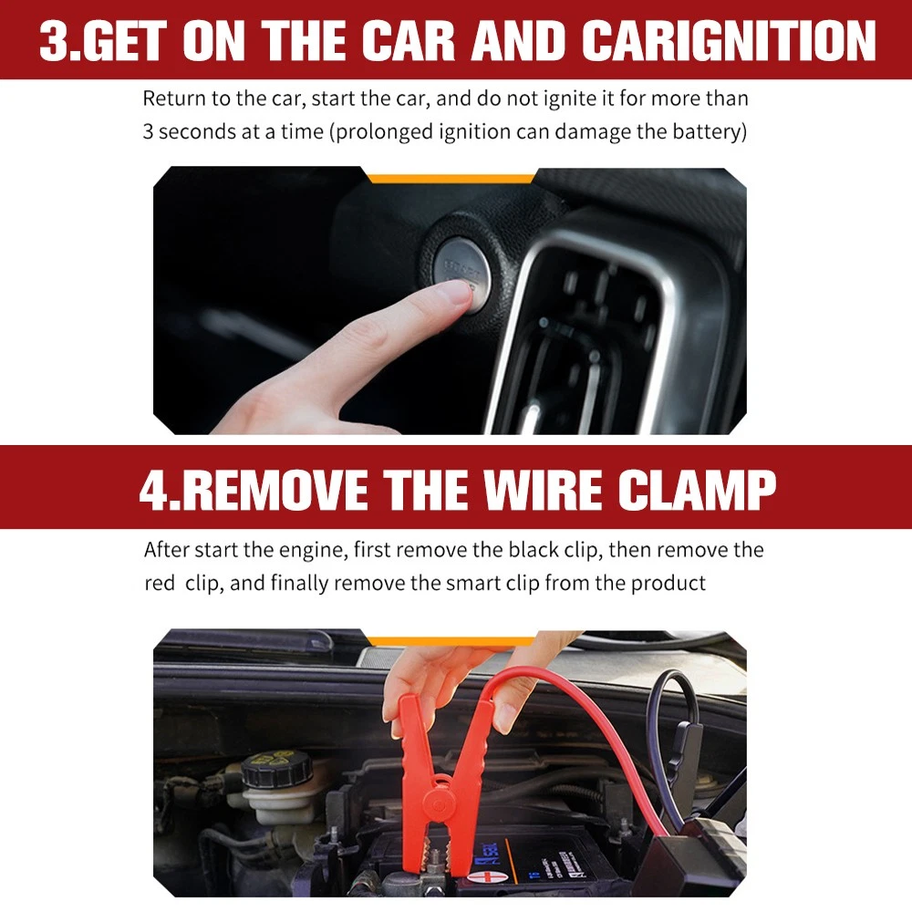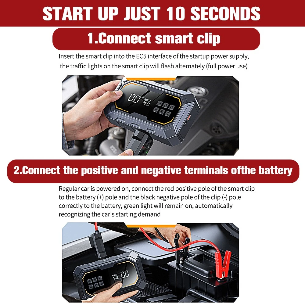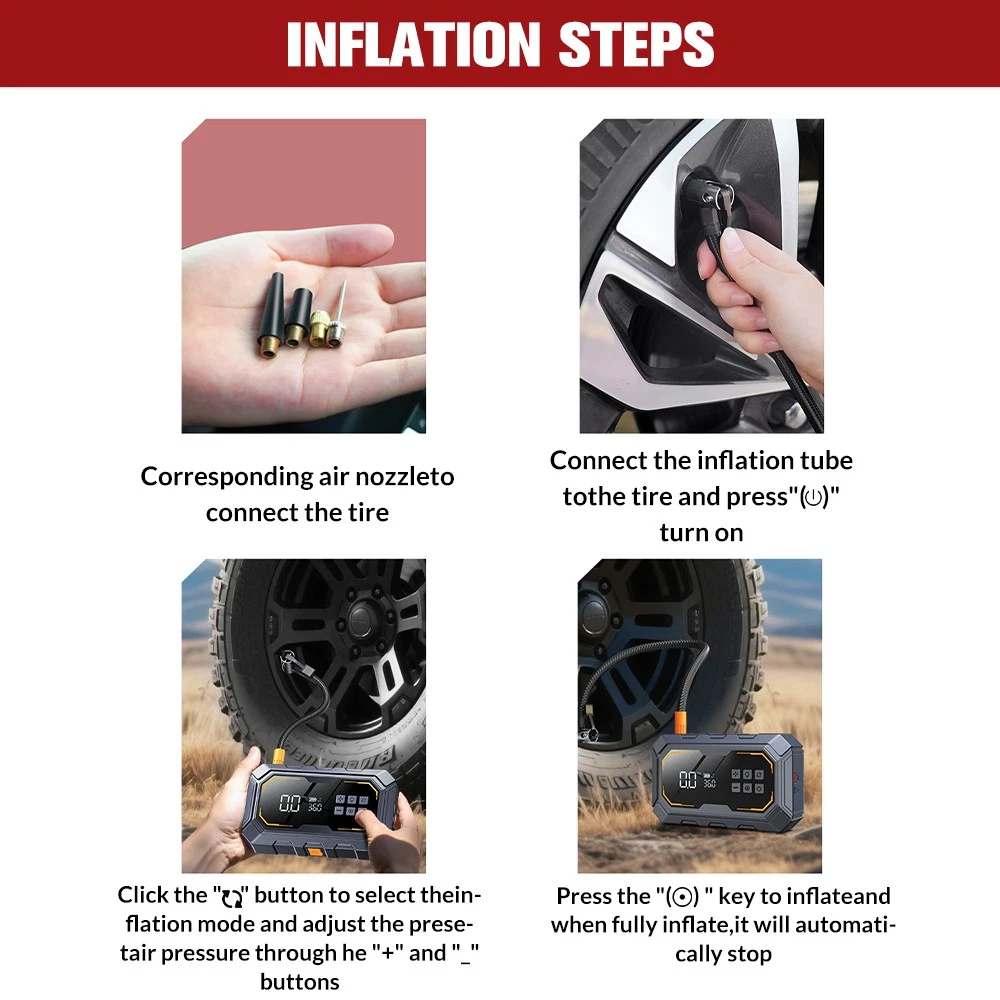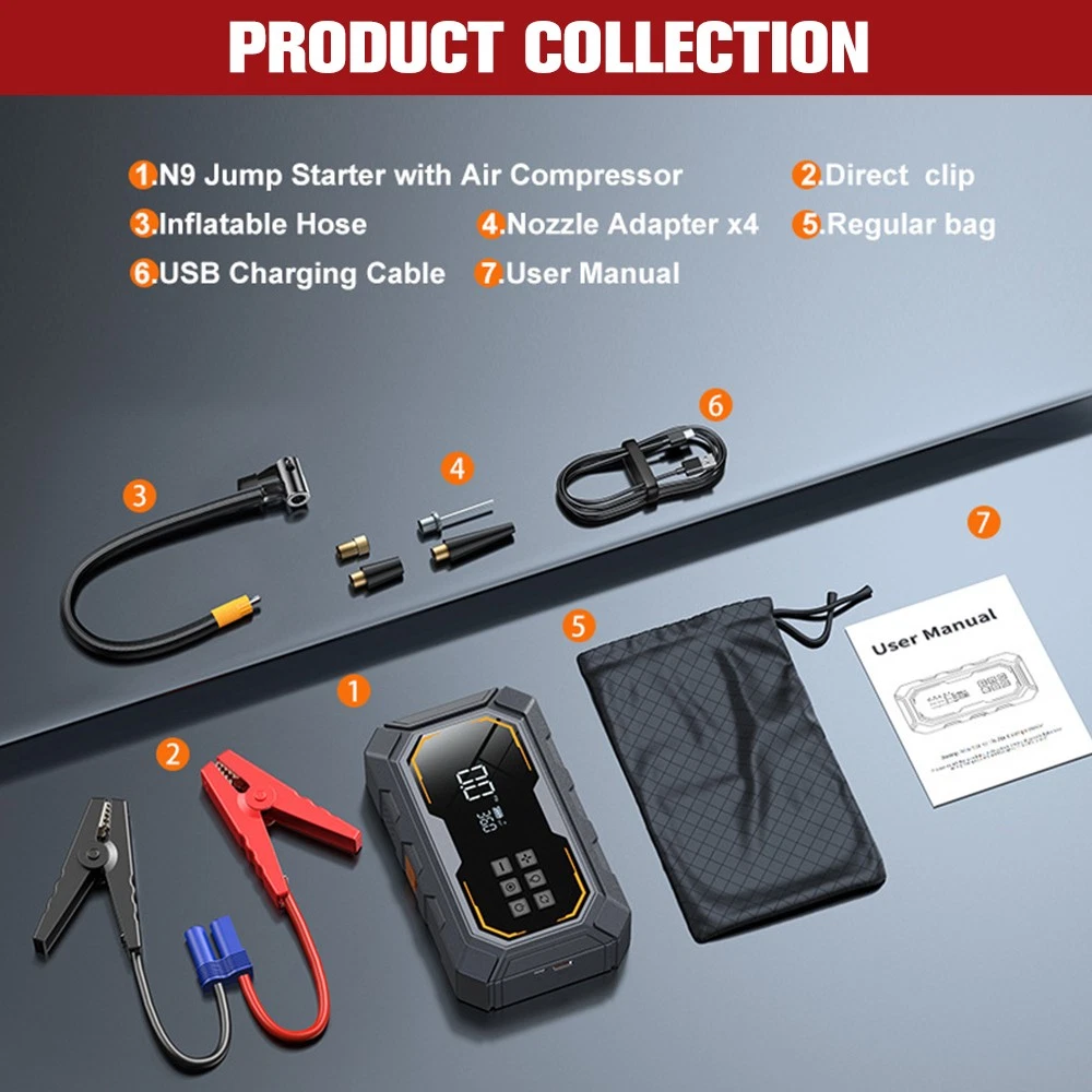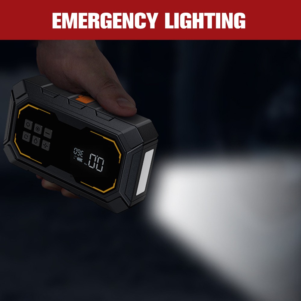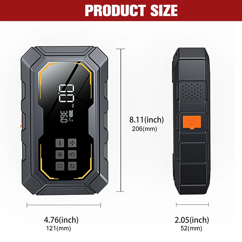 6000A Car Jump Starter with Air Compressor 150PSI&12V, Car Jump Box LED Display About this item: 【POWERFUL - JUMP STARTER WITH AIR COMPRESSOR】-This car battery jump starter device combines a jumpers and air compressors, which greatly saves space. Equipped with a powerful battery with a capacity of 10000mAh,with a peak current of 6000A,a built-in maximum pressure of 150psi,and an air flow of 35L/Min, the portable car jump starter can safely restore a 12V low voltage and fully drained car battery in seconds 【CAR BATTERY JUMP STARTER WITH HD LCD】:The HD digital LCD display of this car battery skip box displays real-time pressure and preset values (accuracy +/-1 PSI) for easy reading and observation of all status indicators, with intelligent presets,pressure detection and automatic shutdown without repeated adjustments and checks. Long press the power button to turn on the device, unique turbocharged 35L/Min (150PSI), which can last for about 25 minutes, 5 inflation modes 【600 FLOW LIGHT & MULTI-PURPOSE POWER BANK】:The portable car jumper starter has 12 bright bulbs built in - equipped with large caliber, up to 600 lumens - equipped with a powerful LED flashlight, including SOS,strobe and high beam modes, and also acts as a warning triangle, perfect for nighttime emergencies or outdoor adventures. In addition,it comes with 2 USB outputs (9V/2A and 5V/2.1A) to power phones, tablets and other mobile devices at any time, and in case of an emergency 【MULTIPLE PROTECTION - ADVANCED SECURITY SYSTEM 】 : on-car jumper starter portable with integrated and intelligent clamp design,even at 4 °F to 140 °F extreme environment,also can rapid safely start the car battery has run out, the surface is made of high quality fire protection materials,to ensure product quality and safety,with 10 security protection technology (reverse polarity,fire protection, short circuit,overcharge,over current 【YOU GET THE JUMP PACK FOR CAR BATTERY】:Jump pack(1* jump starter with air compressor, 1* heavy-duty jumper cable,1* type-C charging cable, 1* user manual,1* air pump hose, 1* portable EVA suitcase,4* air nozzle)