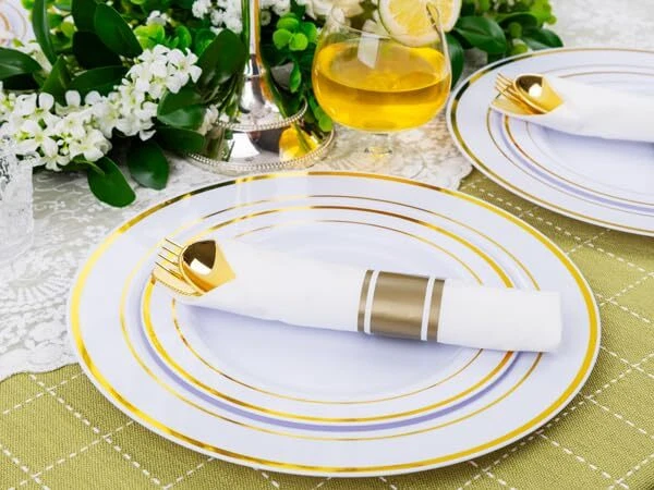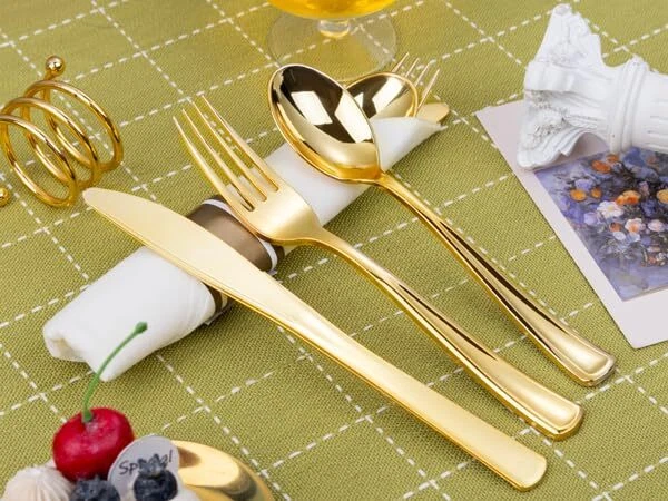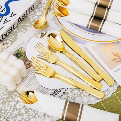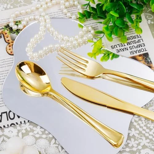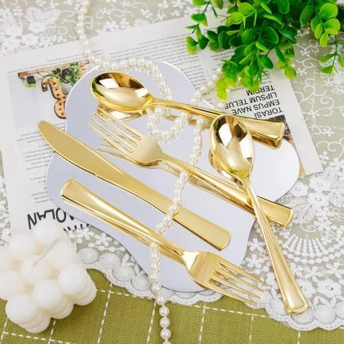 Non-Toxic: The pre rolled gold plastic silverware sets are made of 100% food grade plastic, BPA free and no-toxic. Our gold plastic cutlery are heavy duty plastic utensil, they are durable and sturdy. Elegant and Convenient: The Gold disposable cutlery feel smooth and shiny, maintaining the standard of luxury you want. The wrapped disposable silverware set are very clear and Convenient for you dinners. You can throw them away afterwards without having to wash them. Value Packaging: This is a large capacity packaging of gold plastic flatware. The 100 pack includes 100 forks, 100 knives, 100 spoons, and 100 wrapped napkins. This plastic silverware is perfect for large parties or weddings. Suitable for All Occasions: You can use this heavyweight gold plastic silverware in any occasions. Classic design whether it is a business meeting or a birthday party, including all formal and informal events. Such as anniversaries, tea parties, wine tastings, wedding receptions, engagement and graduation parties, fancy restaurants, big lunches, etc. Soft Napkins - We've made sure these napkins are the softest, plushest most absorbent napkins available. By the way, We have 24 hours online after-sales service.