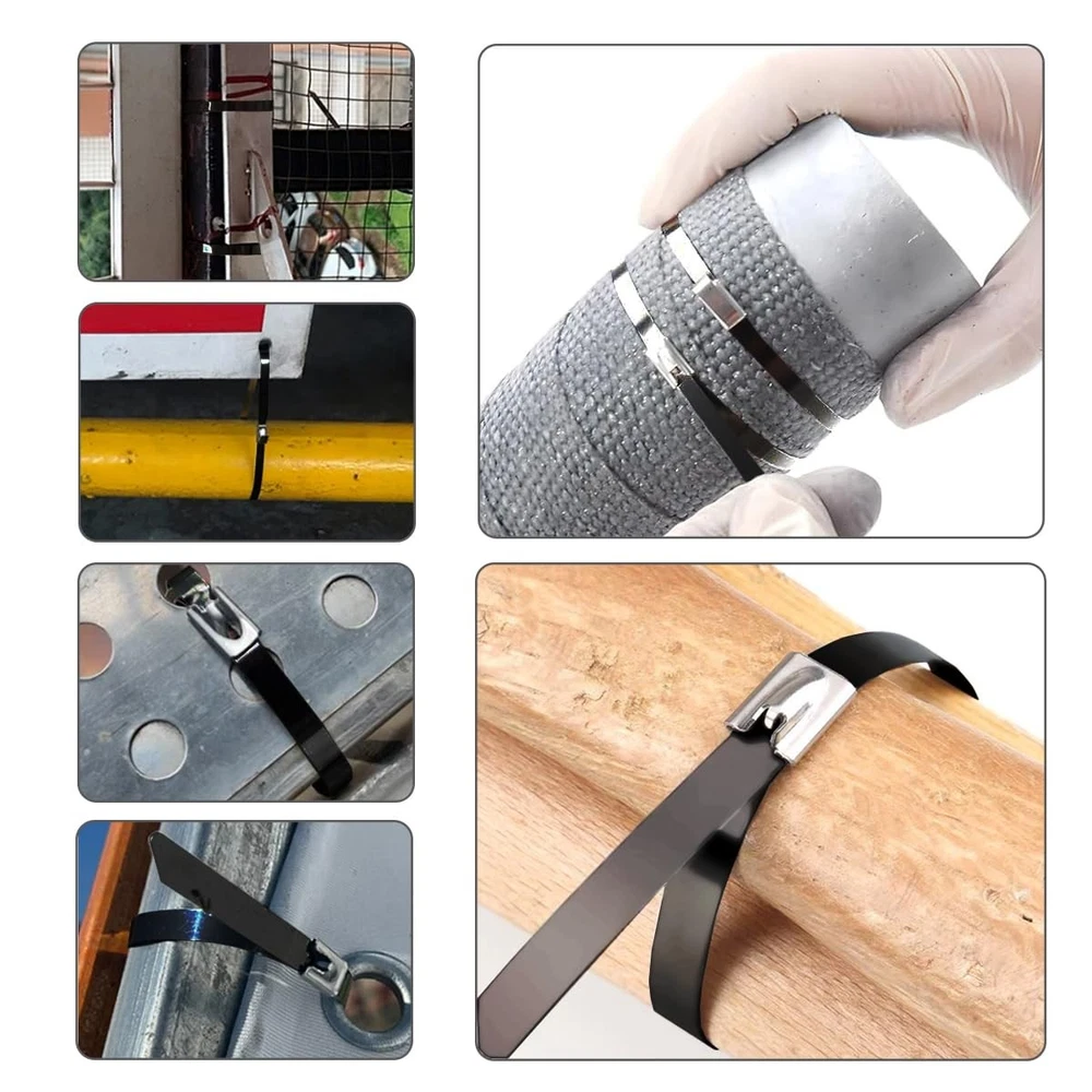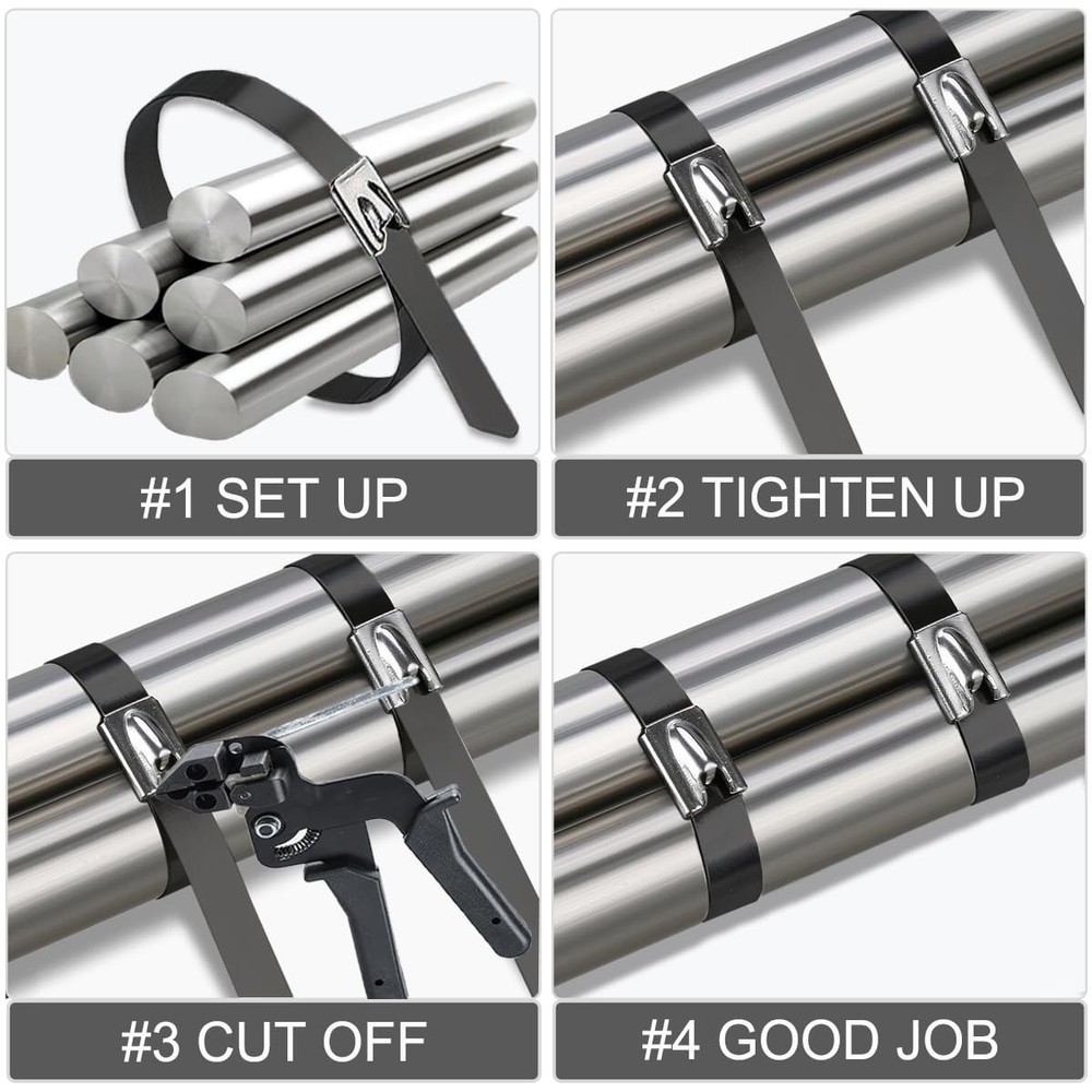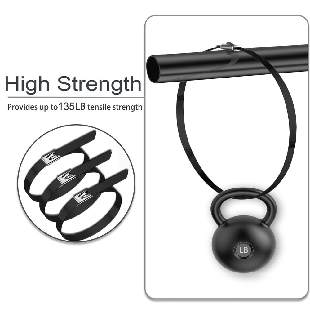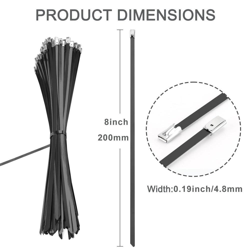 Introducing our Heavy Duty Metal Zip Ties, designed to withstand the toughest outdoor conditions. With a maximum bundle diameter of 2.5 inches, these black epoxy coated zip ties offer superior durability and reliability. The self-locking design ensures a secure hold, while the high temperature and cold resistance make them suitable for any environment.Crafted from 304 stainless steel, these zip ties are built to last. They are rust and corrosion-resistant, making them perfect for various applications such as home improvement, machinery, vehicles, farms, cables, pipes, exhaust wrap, chain link fences, wire fence rolls, and poultry fencing.With an impressive max supporting weight of 135 pounds, these heavy-duty zip ties provide exceptional strength and stability. Whether you need to secure fence parts, manage wires, or fasten industrial equipment, these zip ties are up to the task.Operating in temperatures ranging from -40 to 200℃ (-104℉ to +392℉), these metal zip ties are engineered to withstand extreme conditions. Their versatility and reliability make them a must-have for any outdoor project or application.Each pack includes 400 black 8-inch zip ties, providing you with an ample supply for your various needs. So say goodbye to flimsy and unreliable zip ties and choose our Heavy Duty Metal Zip Ties for superior performance and durability. 【High Quality Material】Our Metal zipper with black epoxy resin coating process, high temperature, cold, rust and corrosion resistance, stainless steel cable ties antioxidant, UV resistance, easy to operate, sturdy and , can bear up to 135 pounds tensile strength. 【Self-locking Design】Featuring a self-locking design, our zip ties are effortless to use. Simply insert the tail into the head and pull tight for a secure and reliable hold. 【Features】The cable ties can be used from -60℃ to +180℃ (-76℉ to +356℉), which is more practical than ordinary traditional nylon cable ties. (exceeding the operating temperature will cause the color layer to fall off, but does not affect the strength) . 【Size and Design】Advanced cold rolling technology makes the product more compact. Each zip tie is 8 inches long, 0.19 inches wide. This pack includes 400 pieces of 304 stainless steel zip ties, offering ample quantity for various projects and tasks. 【Versatile Applications】our metal cable ties provide a good solution for you to fix objects for a long time; They are ideal for your machinery, vehicles, farms, gardens, cables, pipes, roofs and basements and are applied for ships, mines, power and oil industries.