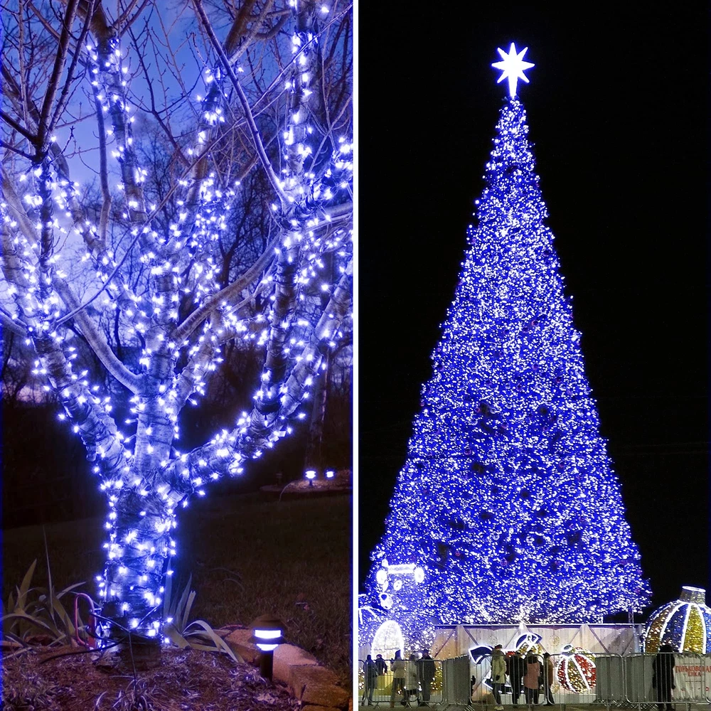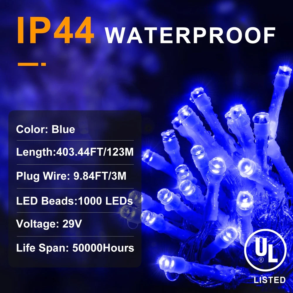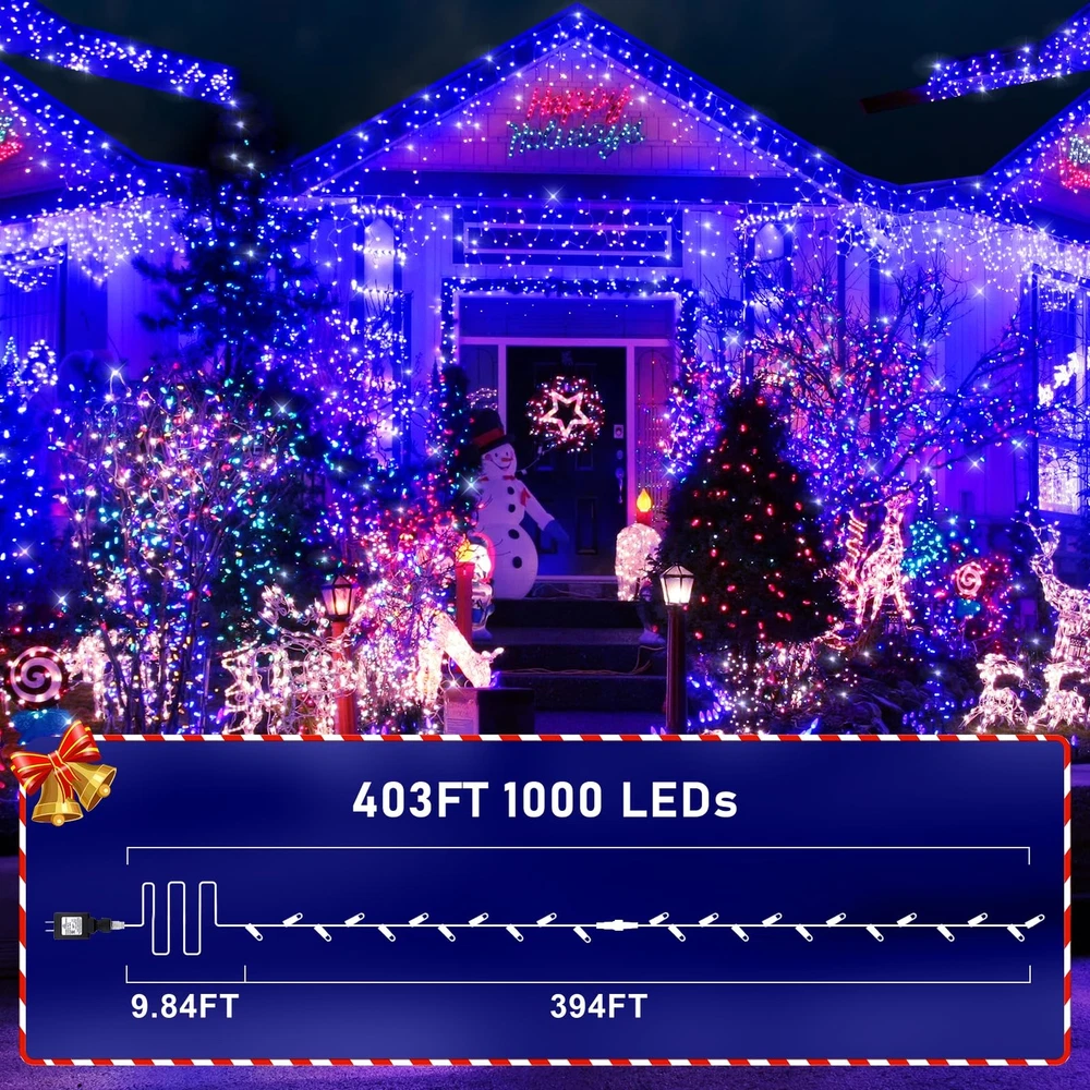 403FT Super Long and 1000LEDs Super Bright: The 403ft Christmas lights with 1000LEDs beads, and 9.84ft plug cord, which can be enough to wrap around and decorate a 15ft Christmas tree, no need to extend. Upgraded higher brightness LED bulbs make each LED beads shine 360 degrees but non-dazzling, to create a cozy, romantic and festive atmosphere for Christmas, Party, Wedding, Stage or Family Dinners. As a holiday decoration, Christmas string lights is really Excellent Value. Smart Christmas String Lights: Including 1 steady on +7 Variable Lighting Modes(Combination/In Waves/Sequential/Slo-Glo/Chasing/Slow Fade/Flash/Steady On). Stay away from single lighting mode! Whether you are hosting a lively gathering or enjoying a quiet evening under the stars, variable Lighting Modes allows you to set the perfect mood for any occasion. Safer and More Efficient: Christmas LED Lights is powered by 29V low voltage output Plug with UL certified, and Low-temp LED bulbs ensure no overheat after long time using. Very safety for kids and pets even can hold it or hang it on their bodies. The LED beads not only do they consume a fraction of the energy , but they also boast a longer lifespan, saving your both energy and money in the long run. It's a win-win situation that combines eco-friendliness with cost-effectiveness. Indoor Outdoor Used: Outdoor lights have IP44 waterproof rated, you can trust they hold up against stormy days, and provide reliable performance season after season. Kindly note the plug needs to be protected from water. Perfect for indoor and outdoor use, hang it into your yard,garden,patio,bushes,doorways,and bedroom,classroom,curtain,ceiling. Making you feel relaxed after exhausting work all day,and enjoy the peaceful moments at night. 4 Adjustable Brightness Levels and 3 Timer Function: Built-in timing and memory chip, no longer have to manually turn it on and off every day, and it will save your last mode setting or timer setting without reset. Saving your time. 100%-75%-50%-25% 4 level brightness adjustable, you can choose the brightness that makes you feel most comfortable. Super easy to install, plug-in and play, then hang it or place it anywhere you need. It`s a great gift for your family and friends.