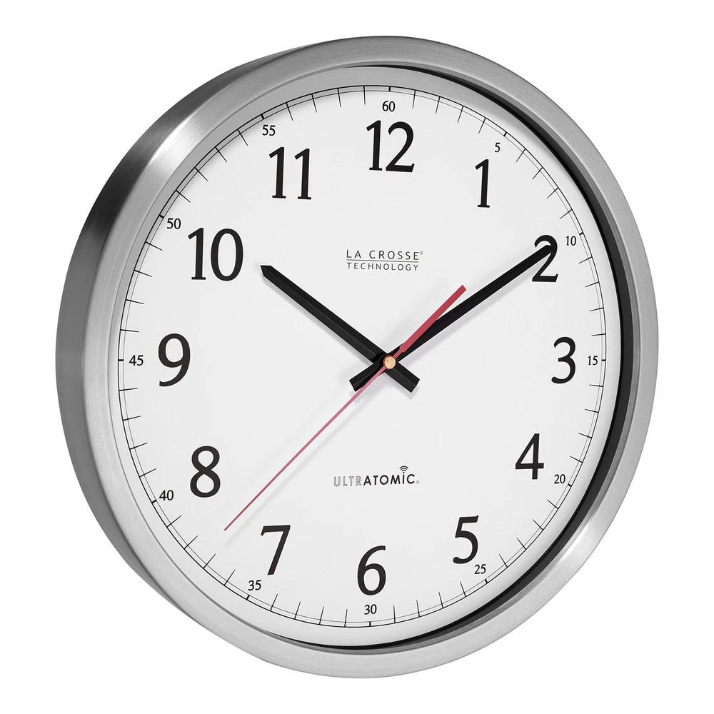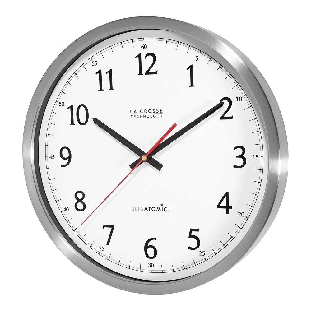 The UltrAtomic wall clock features the most accurate atomic movement on the market. Similar to the traditional atomic clocks, this clock automatically adjusts to the current time and updates automatically for daylight saving time twice a year. However, this particular clock is equipped with two antennas, enhancing the reception allowing it to synchronize in the nosiest and hostile electronic environments such as busy office buildings, hospitals, or other institutions. The extra antenna increases signal reliability and penetration. The movement features 2 additional battery compartments (optional use) that allows the clock to run longer & extending battery life. It also features a battery saving option, pausing the secondhand over night time hours and keep it running years longer before you need to replace the batteries. Receives WWVB time signal in buildings, where no other Atomic clock can Enhanced Reception with Dual Antennas; Excellent for schools, hospitals, and commercial buildings World time zone clock ‐ Set to any Time Zone around the World! 5 year battery life. Q-mode (Quartz mode) for manual time setting. Low power detection indicator Stainless steel framework