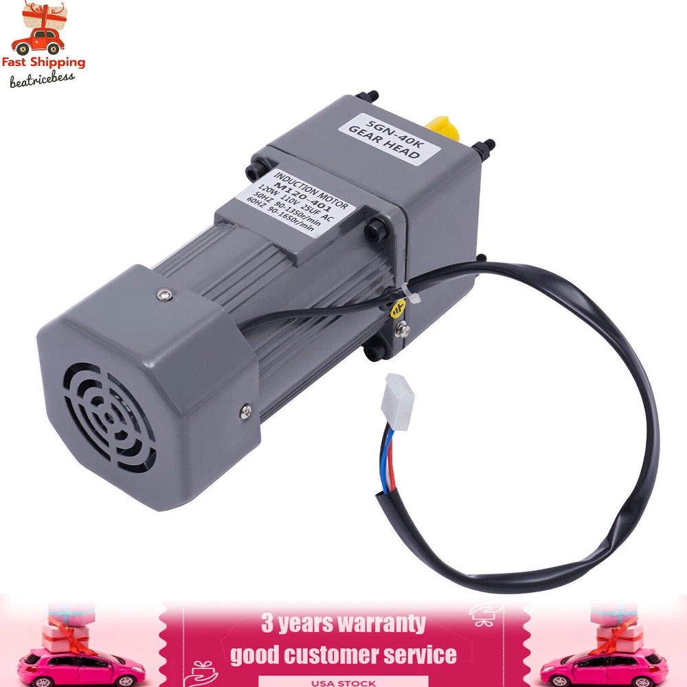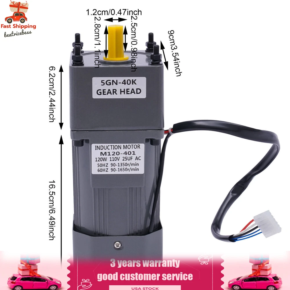 40K Gearbox Electric Motor 110V AC Geared Motor High Torque Single-phrase Gray 120W 40K 110V AC Motor Low Speed Mini Gearbox Electric Motor Barbecue High Torque 110V Geared Motor Synchronous Reduction Motor Reversible Description This is an AC 110V gear motor with 120W power, which can achieve the 1350r/min speed. It uses pure copper coils and allows for low-noise&powerful working, making it suitable for homes, handcrafts, school projects, model-churning soda machines, low-speed machines, and any other product you want. You can turn the speed control knob to adjust the motor speed, realizing the desired effect. Key Features Build to Last: Our product is made of high-quality cast aluminum shell and carburized carbon steel gear and is characterized by heat resistance, high quality, and long service life through plastic spraying, integration, and heat treatment. Speed Adjustable : With the speed controller that has various optional speeds and large torque, you can adjust different speeds according to different products to achieve the desired effect. Good Heat Dissipation: The built-in cooling fan(>60W), cooling window design on the bottom, and pure copper coils with stable performance can effectively dissipate heat to ensure long-term stable operation. Integrated Reducer: The integrated reducer with a heat treatment process improves the gear wear resistance and work efficiency. Stable Operation: Both ends of the rotor are equipped with ball bearings, which can reduce friction and temperature during use to ensure stable operation. High Safety: The slow start function can effectively avoid current overshoot and protect the motor. And it is adjustable to meet different personalized use needs. Reversing Function: It has a reversing function that is flexible with normally open and closed control systems. Easy to Operate&Assemble: With the simple structure, you can assemble this product quickly. The simple switch button and speed control knob make it easy for you to operate. Protective Package: To prevent the product from being damaged and bumped during transportation, we packed it with foam boxes and bubble pads to protect your products to the maximum extent possible. Buy with Confidence: We have been working hard to provide better service and quality for our customers, which is our goal. If there is any problem with our products, please contact us in time. Details Clear Marks: These clear number&letter marks on the machine allow for easy and convenient operation. Power Cable: The power cable has distinct colors for different wires, so you can connect them easily without confusion. Holster: The yellow holster can effectively protect the shaft when not in use. Application It is widely used in packaging, printing, textile, dyeing, chemical, food, and pharmaceutical construction machinery as well as advertising, office, petrochemical, instrumentation, stage lighting, transmission, automatic warehouse, parking, and other equipment. How to Install Please remove the holster before installation. Fix the reducer on the gear motor with four screws. Install the keyway at the keyway opening. Plug the speed controller and gear motor together (main wire to main wire). Unscrew the two AC screws on the back of the speed controller. Connect single-phase power to both AC ports (without distinguishing between zero and fire wires) and tighten the screws. Turn the speed control knob to adjust the motor speed. Install the bracket(not included) on the motor. Specifications Model: M120-401 Color: Gray Material: Cast Aluminum Gear Material: Carburizing Steel Processes: Plastic Spraying, Integration, Heat Treatment Process Type: AC Gear Motor, Induction Motor Shape: Square, Round Feature: Portable Power Phrase: Single-phrase Motor: Pure Copper Motor Noise: About 50-60db Built-in Fan: >60W Torque: 21N.m Voltage: AC 110V Power: 120W Capacitance: 25UF Speed: 50Hz 90-1350r/min, 60Hz 90-1650r/min Reduction Ratio: 1:40 (40K) Shaft Diameter: 12mm/0.47inch Shaft Length: 28mm/1.1inch Keyway: 4mm/0.16inch Key Depth: 25mm/0.98inch Dialogue Mounting Holes: 104mm/4.09inch Axis Eccentricity: 18mm/0.7inch Disc Diameter: 34mm/1.34inch Through-hole: ∅8 Gear Motor Height: 16.5cm/6.5inch Reducer Size: 9*9*6.2cm/3.5*3.5*2.4inch Speed Controller Size: 9*6*10cm/3.5*2.4*3.9inch Package Size: 28.5*24.1*12.5cm/11.22*9.48*4.9inch Net Weight: 4.96kg/10.9lbs Gross Weight: 5.3kg/11.68lbs Package Included 1* Speed Controller 1* Gear Motor 1* Reducer Notes Based on the industrial standard, to meet the different needs of customers, our motor does not include a power cord. You need to purchase a power cord to connect. The bracket is not included in this package, so you should purchase it yourself. Please do not plug&unplug the power cable when the power is on. Please do not knock or beat the machine. The speed reduction motor is composed of a motor and reducer, different speed ratios can achieve different speed regulation ranges, and they have different strengths. Under different deceleration ratios, the output shaft speed is different. The output shaft speed is equal to the motor speed of 1350 rpm divided by the deceleration ratio. When the gearbox decelerates, the greater the speed ratio, the greater the force. The slower the speed regulated by the governor, the smaller the torque. The motor can run for a long time within the safe speed regulation range. The safety speed range of a small load: is 50% of full speed-full speed; The safety speed range of a large load: is 70% of full speed-full speed. Please allow the slight color difference caused by the shooting light and 1-3cm error due to manual measurement, and make sure you do not mind before you order. Payment Delivery details Terms of sales About us Contact us Payment We accept ebay payment 。 Fees such as import duties, taxes are not included in the item price or shipping costs. These charges are the buyer's responsibility. Delivery details Shipping: 2-9 working days to: USA Terms of sales We