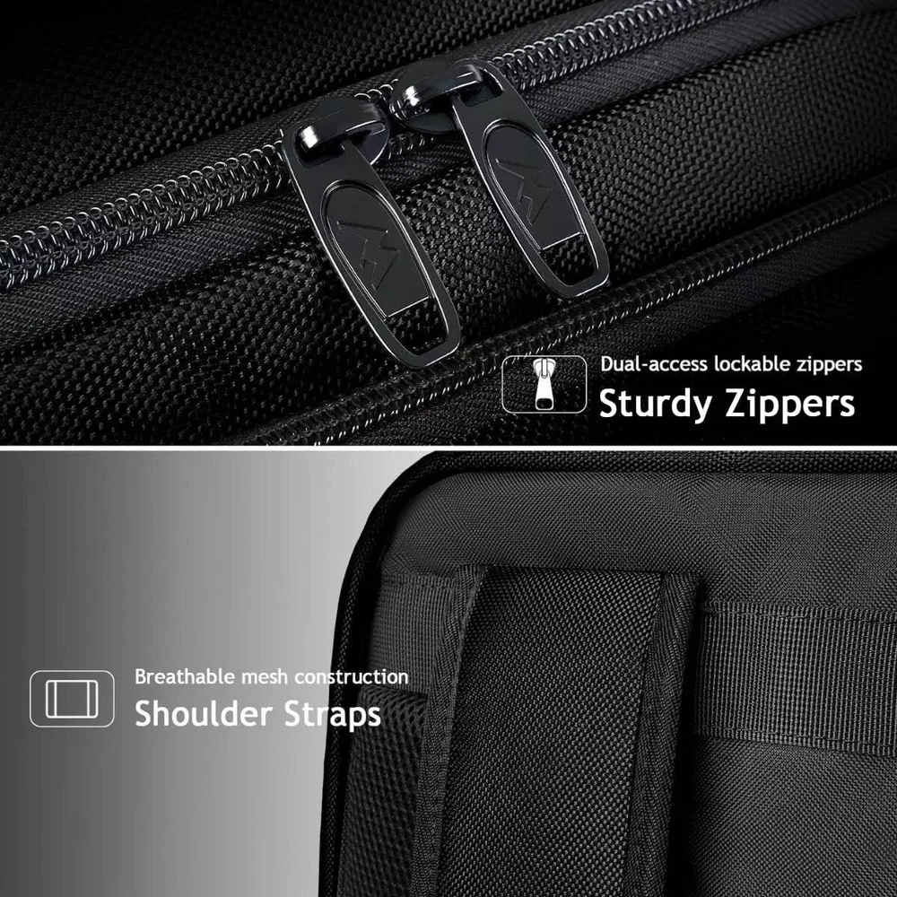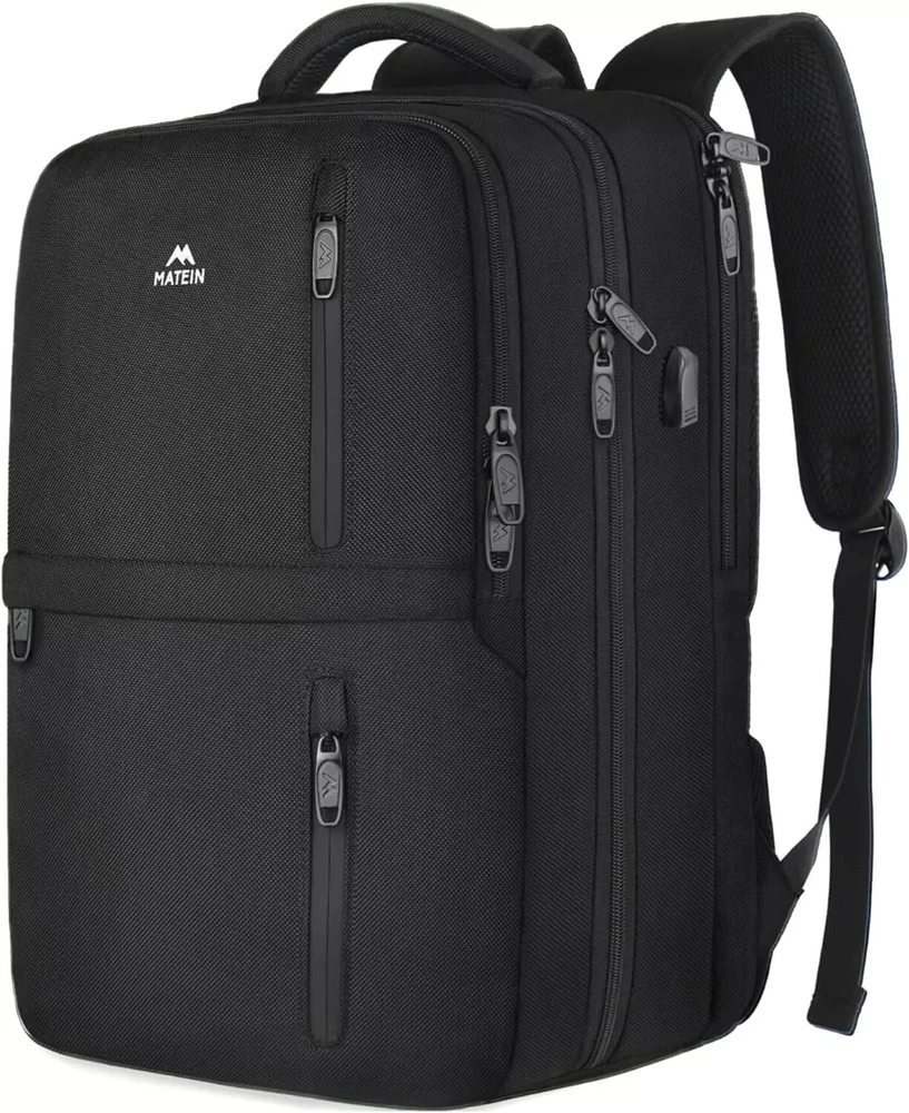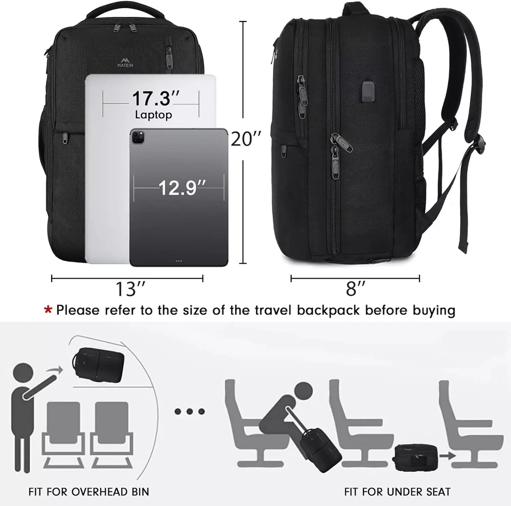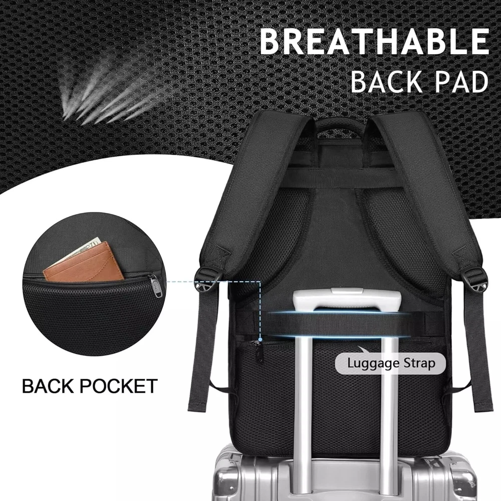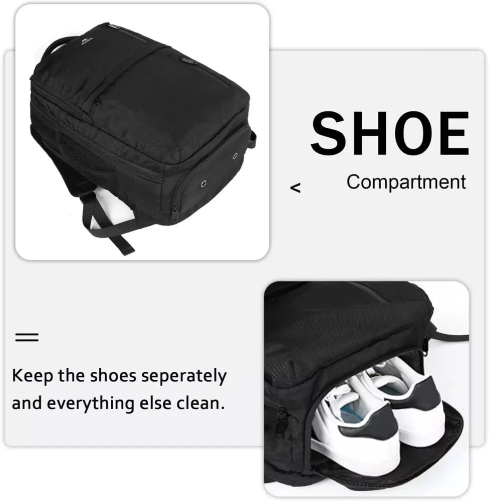 Ultimate 40L Travel Backpack: Flight Approved, Water Resistant, USB Port FUNCTIONAL & SAFE: USB interface with built-in cable design, great convenience for charging your electronic devices via connecting your own power bank Comfortable breathable back design gives you maximum back support; A luggage strap allows the travel backpack to securely slip over the handle of any rolling luggage for hands-free transport, easier carrying. With a hidden anti theft pocket on the back protect your valuable items from thieves MULTI-COMPARTMENT: Dimensions 18(H)*13(L)*8(W)inch, Light Weight 1Kg(2.2lb). Travel backpack has a separate laptop compartment could hold 17.3 inches computer and protect laptop from moving; Main compartment with double zippers has enough storage room to store your daily necessities for an overnight trip; Organizer compartment has many pockets keep your items organized and easier to find; There are many other pockets for different purposes. SHOE COMPARTMENT: The shoe compartment is crafted to bottom of large travel backpack carry on to keep the shoes separately and everything else neatly. This shoe storage is wide enough to hold size 10-12 for both lady shoes and man shoes which can also be used as toiletries bags and for other uses; There is two venting hole in shoe compartment, make it keep breathable RELIABLE MATERIAL: The large travel laptop backpack is well made of Water-Repellent and High-density Nylon Fabric with metal zippers; There has Lockable Metal Zippers in laptop pocket to protect your computer or valuables from thieves (you need to lock up laptop compartment with your own lock); Foam padded top handle is comfortable to carry on for a long time ROOMY CAPACITY: The capacity of the travel bags is 40L. You can carry it onto airplane. The carry on backpack ensure a secure long-lasting usage everyday or weekend, Serve you well as travel personal carry on bag, business trip, outdoor activities backpack, perfect for men, women.