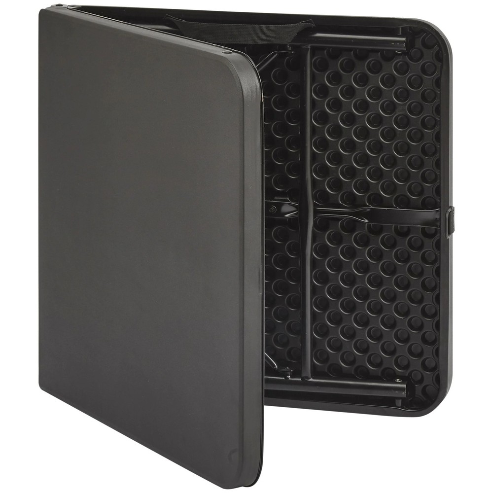Product details Provide all of the table spaces that you need in all kinds of settings with the 40" Fold-in-Half Table in Rich Black. This versatile rectangular table is sturdy and durable, made with reliable materials, folds for easy storage and transportation, and adjusts to three different heights. When you're finished using it, just fold in the metal legs, fold the table in half, and your new compact table is ready for transport! Its classic black color is sure to fit in at any gathering in any setting, and its spacious expanded 40" long table-top is ideal for holding a wide variety of foods, crafts, or whatever items you are working with! It's great for everyday use both indoor and outdoor, as a serving table, craft supply table, outdoor meal table, or for whatever purposes you may need. The plastic tabletop is easy to clean with no fuss just wipe it down with a damp cloth, and it will look as good as new! The carrying handle makes it perfect for taking on the go, for outdoor barbecues, game nights, school activities, parties, or tailgating events. The tabletop is large enough to be able to sit the whole group down around the table, so all of your friends and family can be included. Product Dimension:40" W x 20" D x 17.71" - 24.4" - 28.03" H Comfortably seats 4 adults Easily folds in half for convenient storage Classic black color coordinates with almost any decor! Includes a built-in carry handle, for easy transportation Rubber stoppers on the legs for added grip on floor surfaces Appropriate for use indoors or outdoors Easy-to-clean resin surface Strong durable powder-coated metal construction Number Of Pieces: 1 x folding table