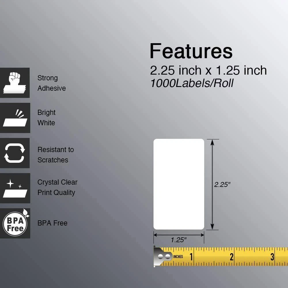 Labels per roll:1000 pcsLengh:32mmWidth:57mmBrand:9leafcloverType:Thermal labelsColor:WhiteCountry/Region of Manufacture:Chinagtin13:Does not applyLabel Type:AddressUPC:Does not applyMPN:ZB-225X125-1000Product Dimensions:3.5" (diameter) x 2.4" (height)