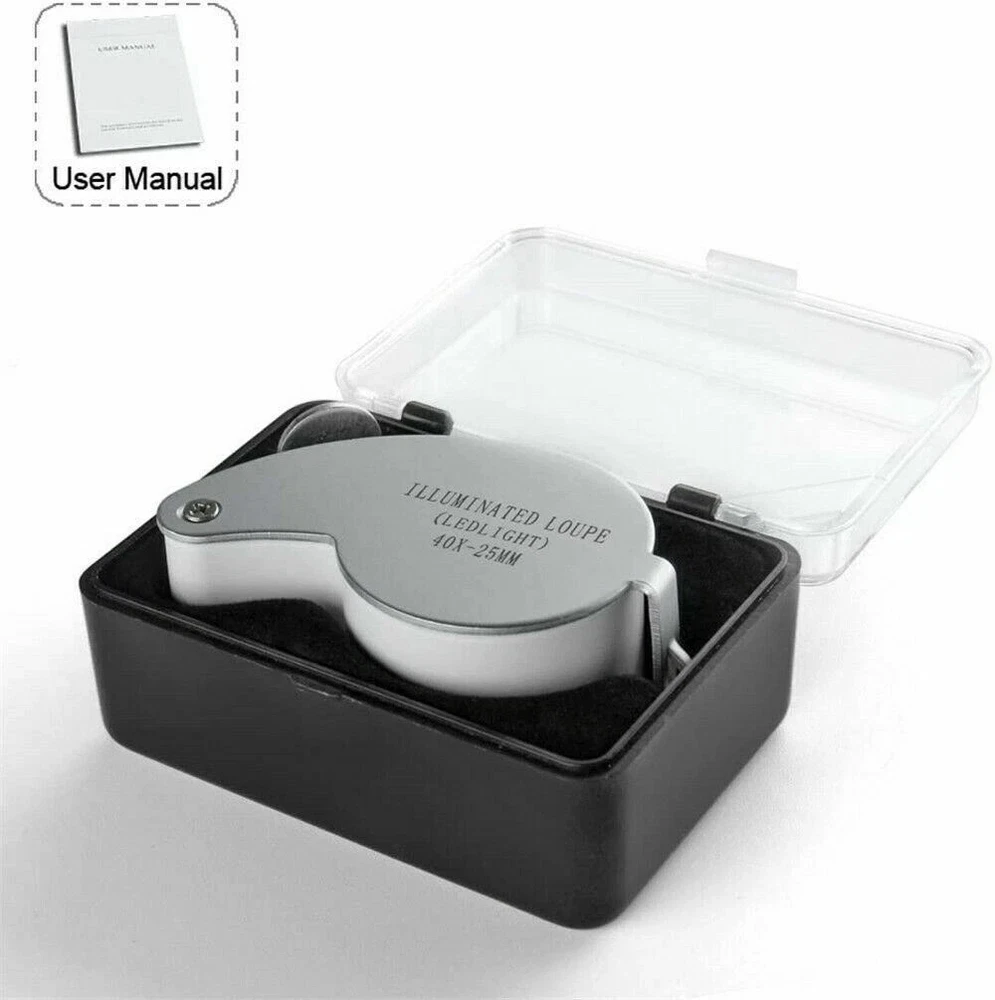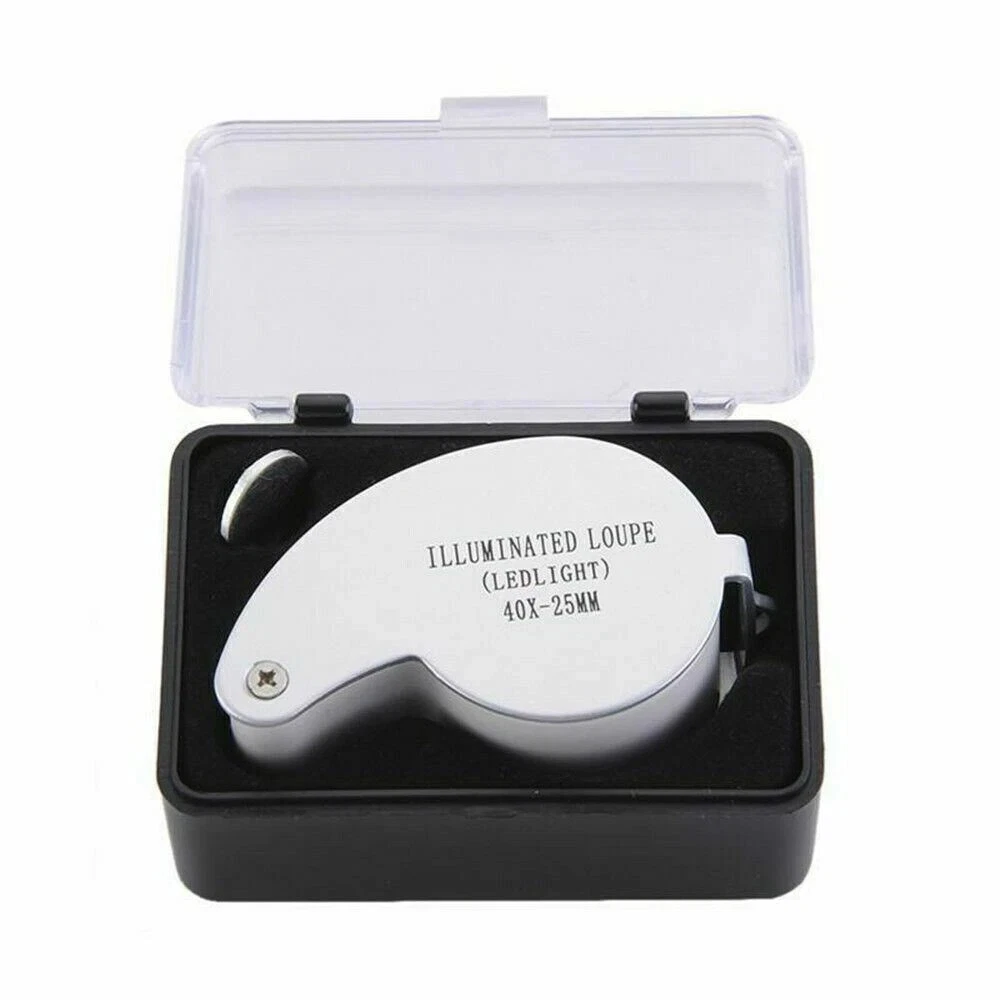 40X Magnifying Loupe Jewelry Eye Glass Magnifier LED Light Jewelers Loop Pocket W/ FREE Plastic Storage Case AND FREE TRACKING #.. BEWARE OF OTHERS WITHOUT TRACKING # 40 X 25 Magnifier Colors: Black, Or Silver Magnification: 40 X Lens diameter: 25 MM Weight: 58 g Material: aluminum alloy, ABS and Acrylic Size: 58mm*33mm*25mm Button Battery: 3 X LR927 (Included) Features: 1. Wide Application Range: LED currency detecting , Jewelry identifying, offices, hospitals, schools, printing, homes, electronics, stamps collection, jewelry appraisal, mechanical processing and so on. 2. Small size, take and keep easily. 3. With 3 LED lights, can use in dark, 4. With 40 X magnification, very clear. How to Replace the Batteries: Insert the key attached this product into the two holes of battery cover, turn anticlockwise to loosen battery cover, take out old battery and then put new battery inside, finally turn the cover board clockwise to tighten it. Package including: 40 X 25 magnifier X 1 PC Button batteries (inside) X 3 PCS Product Manual X 1 PC Package with plastic storage case