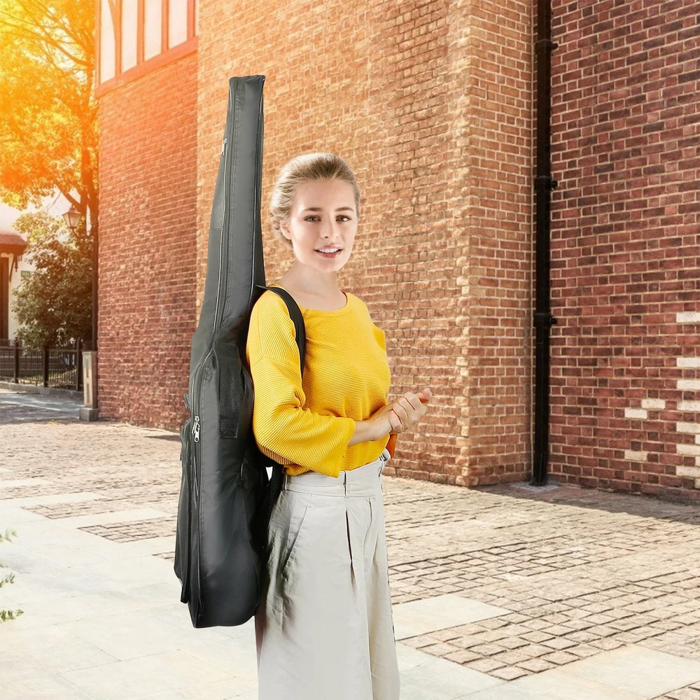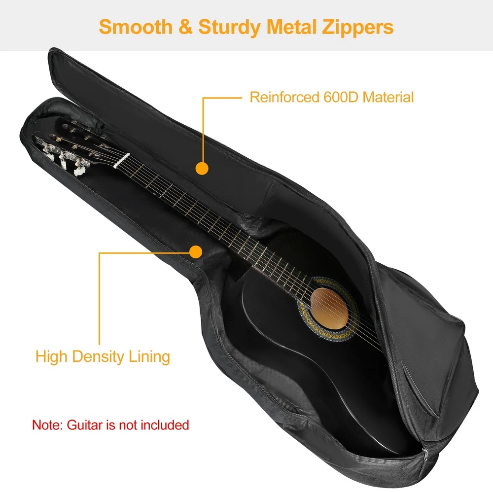 Place inside your favorite guitar, stash all the auxiliary gear in pockets, zip up and away you go to practice, lessons or gigs with no worries about getting your guitar or gear scratched during the transit even in the case of unexpected collision and bumps.Three reinforced layers including tough water-resistant, rip-stop Oxford nylon exterior, thick padded interior and soft smooth lining provide ultimate protection. Additionally, the backpack style shoulder straps and traditional side handle make transporting your guitar a breeze. Feature : Padded Protective Design: With 5mm thick foam padding and polyester lining, it can protect your guitar from unexpected collision, scratch or other damage in transport. Water-resistant: Made of 600D oxford fabric, water resistant and wear resistant. Keep your guitar tidy. House and protect your guitar and accessories against scratches, dings and bumps while making it easier to travel to practice, lessons and gigs. Plenty Of Spare Room: For auxiliary gear like spare strings, valve oils, tuner, books, sample CDs, music materials in the 2 exterior pockets that are both zipped for easy access. Easy To Carry: Features with the adjustable strap, which can enable hands-free transport while the traditional carrying handle makes it easy to carry through doorways. 41” Large Dimension: Can fit for up to 41” standard size acoustic guitar. Please confirm that your guitar is not over 41” before ordering. Specification: Product Type: Guitar Bag Material: 600D Oxford fabric, 5MM thick foam padding, polyester lining Coating: Exterior water-resistant PVC coating Compatibility: Standard classical or acoustic guitars up to 41” long Size: 41.3 x 17 x 5.5 in/105 x 43 x 14cm (L x W x H) Weight: 589g/1.3lbs Color: black Package size: 53*39*5cm/20.87*15.35*1.97in Package weight: 589g/1.3lbs Package Contents: 1 x Padded Protective Acoustic Guitar Gig Bag 1 x Care Instructions **The Guitar in the photo are Not Included, Only for display. ******Notes Before Purchasing****** **Please double-check your shipping address before checking out, as it cannot be changed once the order is completed. **Please make sure the color, size and type are correct before checking out. Avoid the waste of additional time and costs due to return and exchange **If you have any problem with the item you ordered, please contact us via eBay Messages and give us the opportunity to resolve the issue before leaving any negative feedback or opening any dispute. ******Providing you with a pleasant shopping experience is really crucial for us******