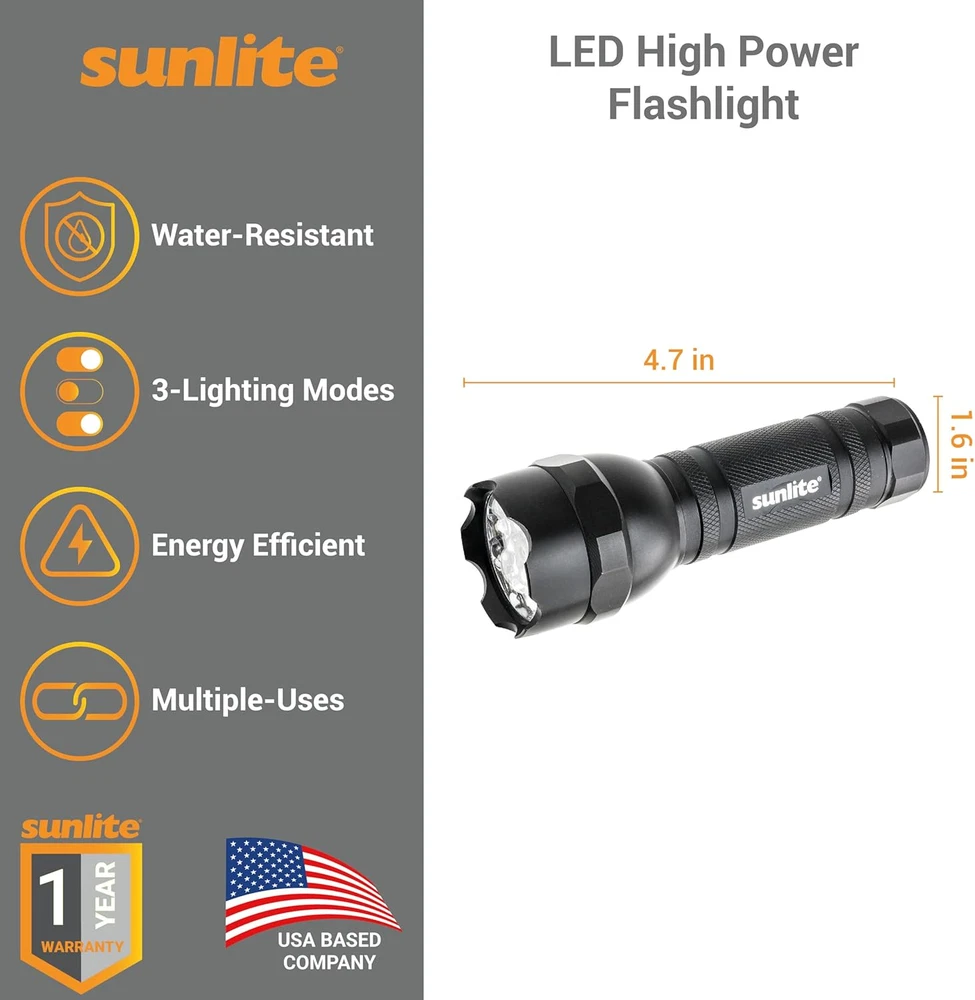 Store New Arrivals Add to Favorite View Feedback Contact 41780 LED Outdoor High Power Flashlight, 3-Modes, Flashlight, Strobe, Green Light, Water Resistant, Handheld, Black, 2 Count Description Light Source Type LED Item model number 41780 Style handheld Power Source Battery Powered Battery Cell Composition Alkaline Country of Origin China Warranty Description See packaging for details. Batteries Included? No Usage Camping Gear, Travel Light, Emergencies, Oudoor, Indoor Special Features High Strength, Three Mode flashlight, Upgraded Design Batteries Required? Yes Finish Black Product Dimensions 4.7"D x 1.6"W x 4.7"H Material Anodized Aluminum Number of Batteries 3 AAA batteries required. Finish Type Black Item Package Quantity 1 Water Resistance Level Water Resistant Item Weight 6.9 ounces Battery Description Alkaline Special Feature High Strength, Three Mode flashlight, Upgraded Design Description Pile Alkaline Part Number 41780-SU Color Black Batteries 3 AAA batteries required. Voltage 4.5 Volts (DC) Recommended Uses For Product Everyday use, camping, hiking, emergency situations Included Components Flashlight Size 2 Count DURABLE CONSTRUCTION - Sunlite LED flashlights are constructed from high strength, lightweight anodized aluminum. Knurled body for a non-slip grip and faceted sides to keep it from rolling away THREE MODES - They feature three lighting modes: ten solid white LEDs, five bright green LEDs, and white LED strobe light flash. In order to make the flashlight work, remove the plastic disk from inside the battery compartment. MULTIPLE USES - Great LED flashlight for everyday use, camping, hiking gear and so much more! The strobe and green light modes are helpful for attracting attention in emergency situations COMPACT SIZE – Handy and stylish compact body design makes it the ideal size for purse, pocket, and glove box. Water-resistant makes it useful in most weather conditions. The flashlight is 1.6-inches diameter x 4.7-inches long ENERGY EFFICIENT - LED technology means a long battery life so it's ready when you need it the most (batteries not included). Sunlite LED flashlights are constructed from high strength, lightweight anodized aluminum. They are water-resistant and feature three lighting modes: ten solid white LEDs, five bright green LEDs, and a white LED strobe light flash. Knurled body for a non-slip grip and faceted sides to keep it from rolling away. Three handy tools in a small form factor make it the ideal size for a purse, pocket, and glove box. Great LED flashlight for everyday use. The strobe and green light modes are helpful for attracting attention in emergency situations. Anodized high strength aluminum makes it water resistant and virtually indestructible. Uses 3-AAA batteries (not included). The flashlight is 1.6-inches in diameter x 4.7-inches long. ABOUT US We offer the best prices around on high quality products. Our E-store includes media such as books, movies, music and games while offering electronics, toys, sporting apparel, clothing, tools, general home, garden items and more. SHIPPING We are always working hard to ensure your package arrives as soon as possible. Please understand that some factors like weather, high postal traffic, and the performance of shipping companies are outside of our control. We offer free shipping to the lower 48 states and ship within 2 business days of payment, usually sooner. We do not accept P.O. Boxes. Please provide a physical address. For shipping outside of the continental USA, we only use eBay's Global Shipping Program.The item is shipped to KY and then sent to the rest of the world. International customers are responsible for all duties and taxes. Continue to check out in order to calculate costs for shipping the item to your country. Messages regarding eBay's Global Shipping Program MUST be directed at eBay EXCLUSIVELY. RETURNS We offer a 30-Day Return Policy on items which you are not completely satisfied with. You have the option for a full-refund or an exchange of the item. No returns are available on items shipped outside of the USA. PAYMENT We accept PayPal. CONTACT US This page content is yet to come Please ad us to your favorite seller and visit again later Thank You CUSTOMER SATISFACTION We try our very best to make sure every customer is completely satisfied. If there's a problem, message us! We're happy to help. WE ACCEPT Copyright © 2021 AutoDS. | All Rights Reserved